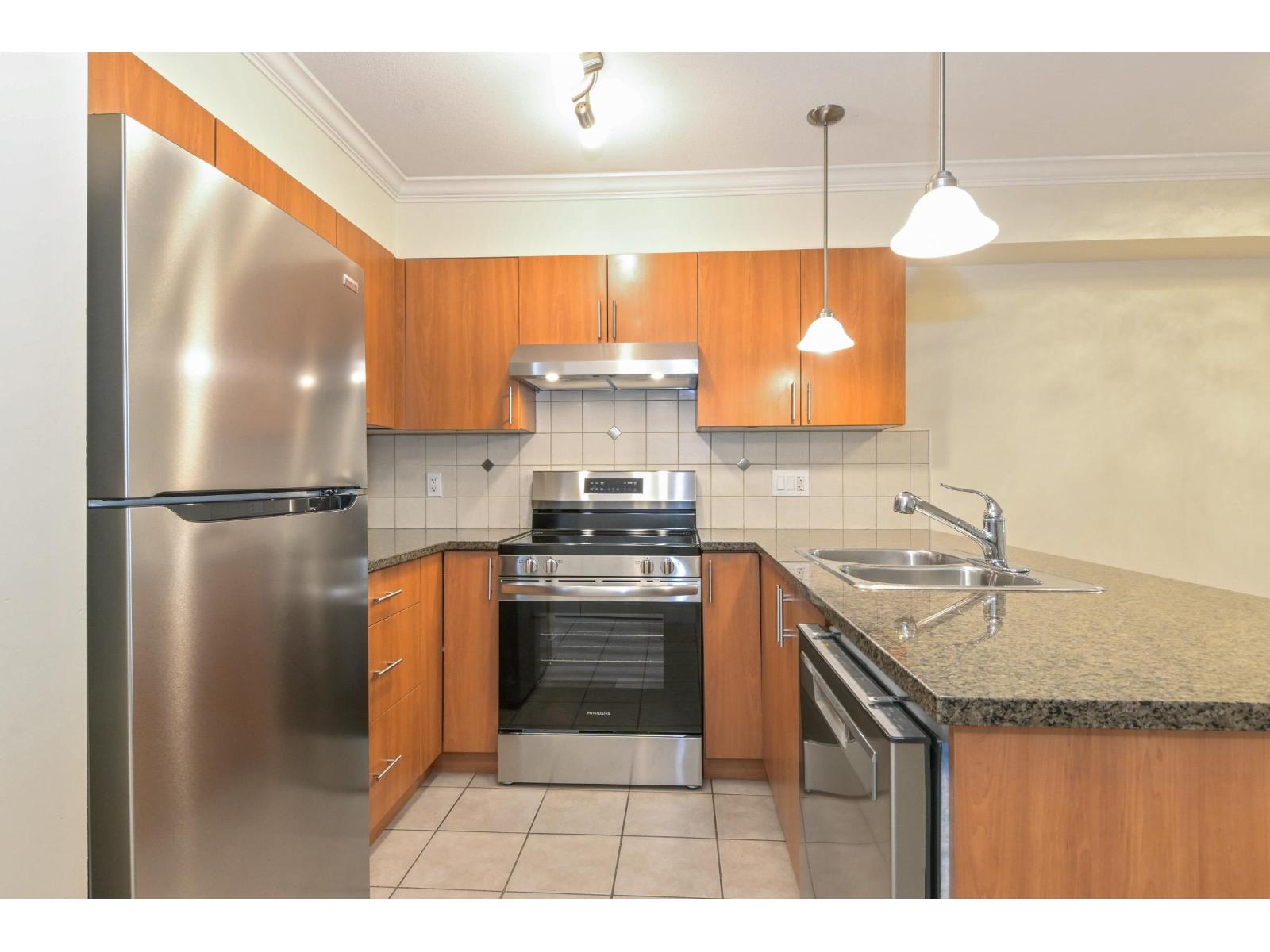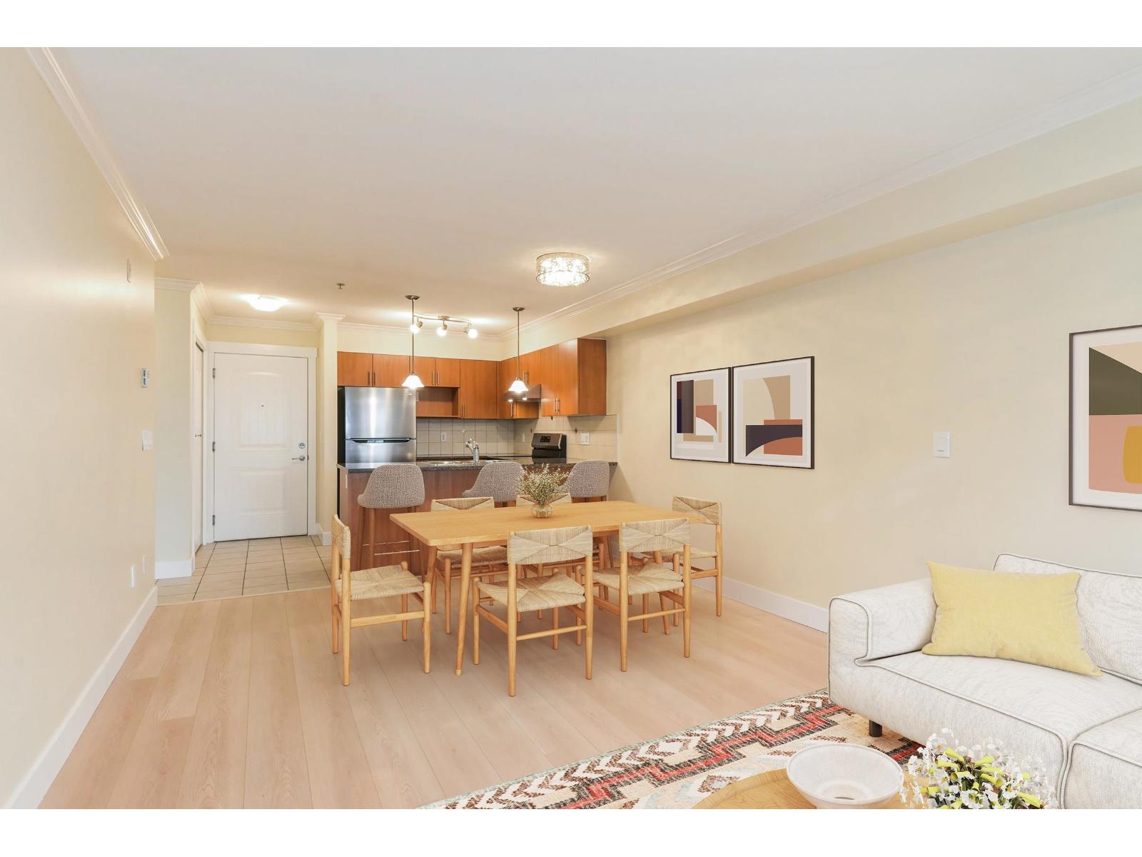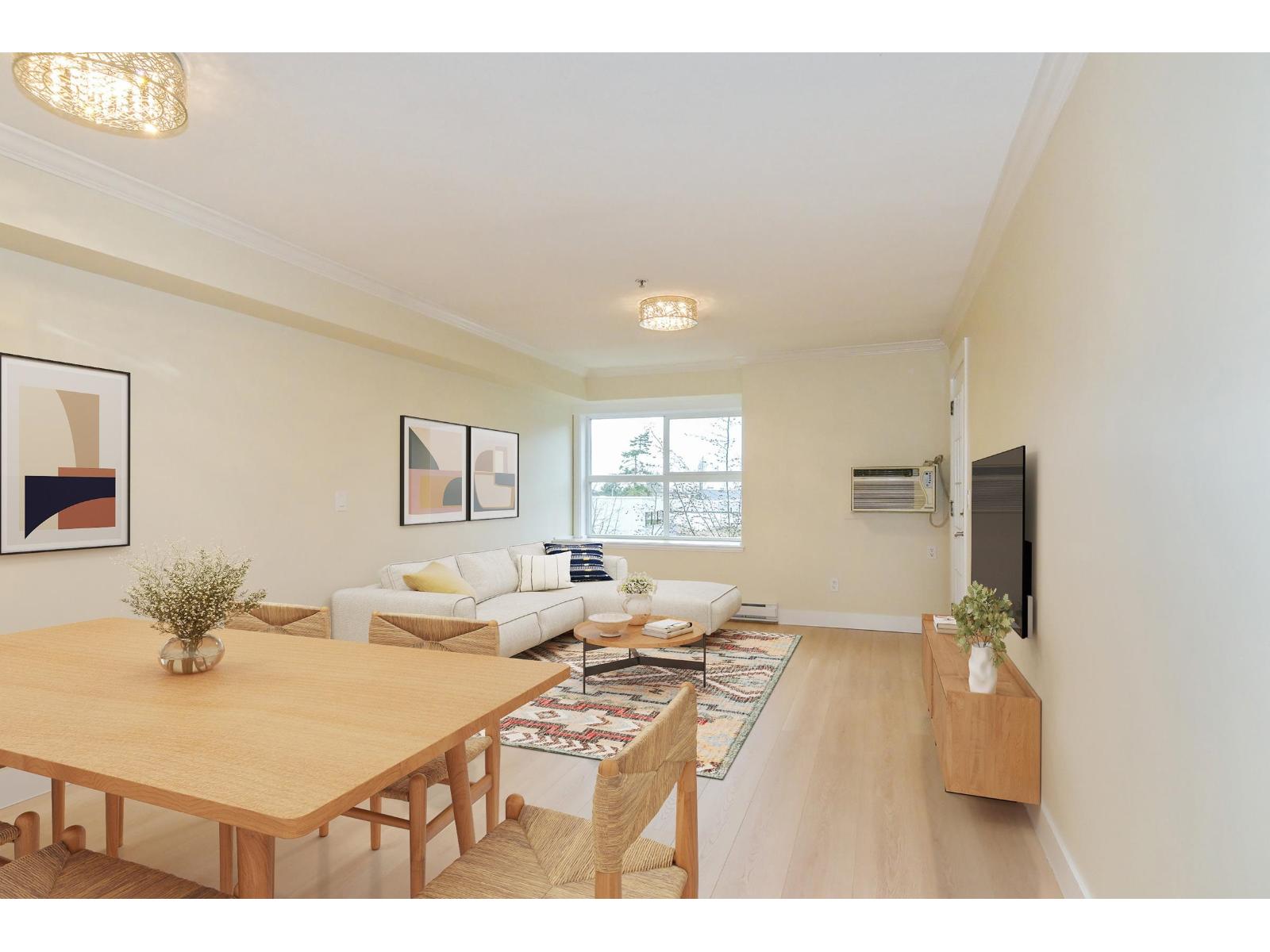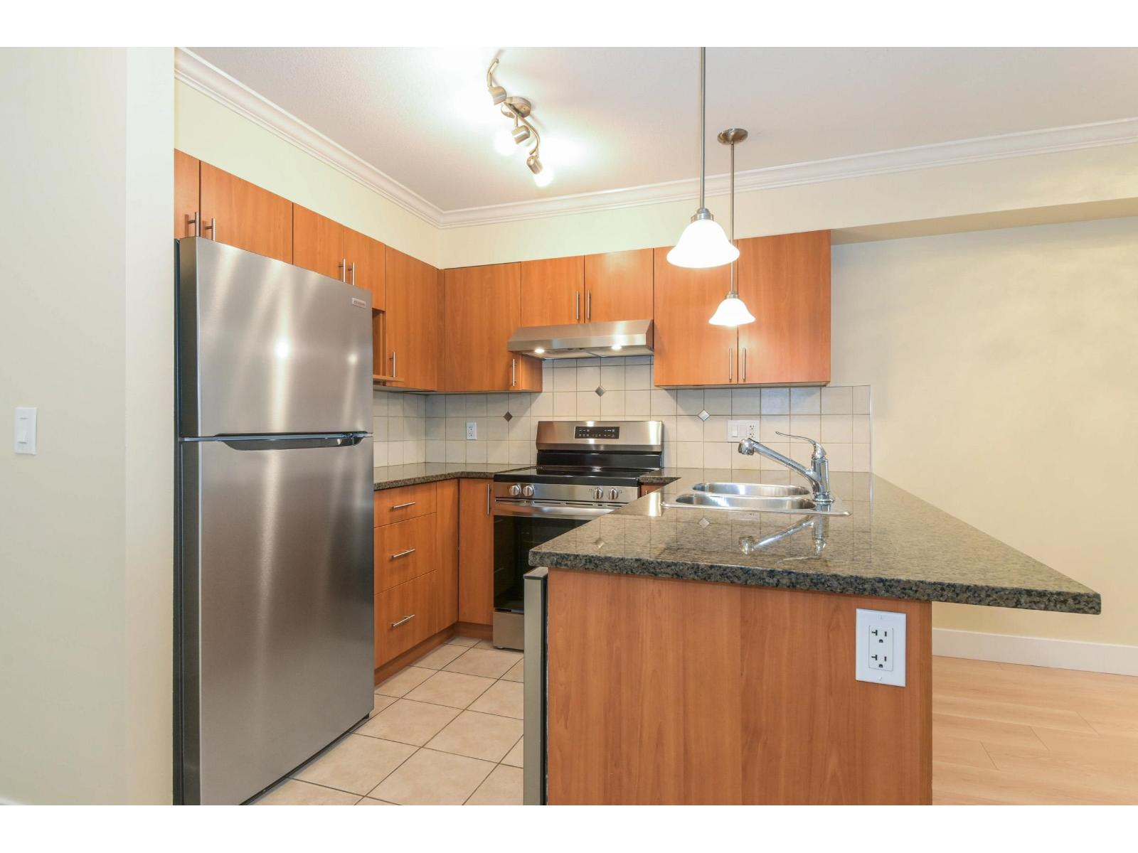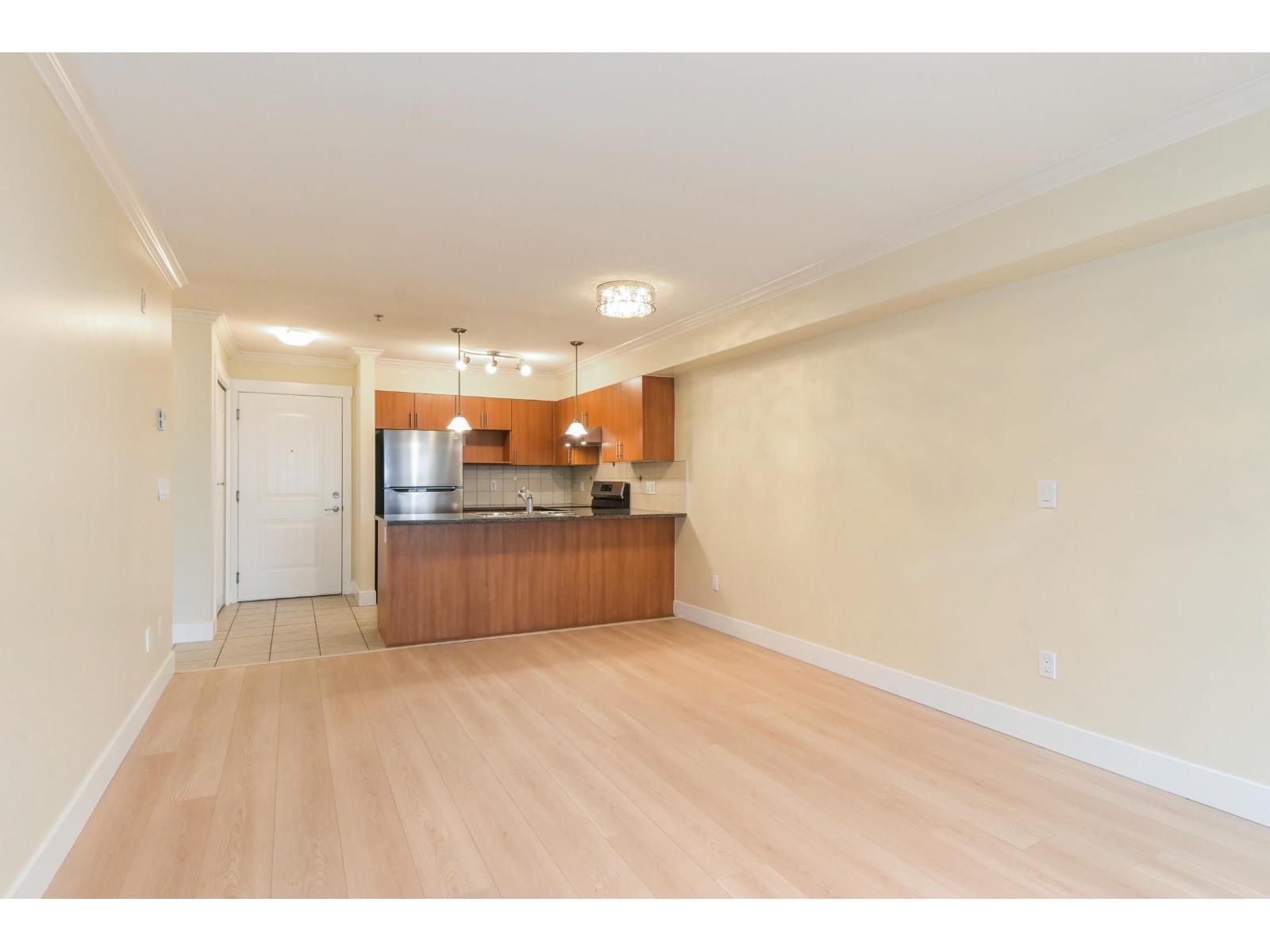 Clover Downs Estates in the heart of downtown Cloverdale. Well-maintained 1 bedroom, 1 bathroom home offering a spacious, efficient floor plan with no wasted space, fresh new paint & laminate flooring. West-facing exposure that fills the home with natural light, plus a/c for year-round comfort. The kitchen features new stainless steel appliances, including a fridge, stove & dishwasher, & opens to a large deck-perfect for relaxing or entertaining. The building is well cared for and offers great amenities including a gym & games room. You'll also appreciate the low strata fees of $264/month, 1 parking stall with high ceilings in the parkade, and 1 storage locker. Steps from shopping, restaurants, Kwantlen University & the new hospital. Easy to show. Book your private appointment today! (id:64528)