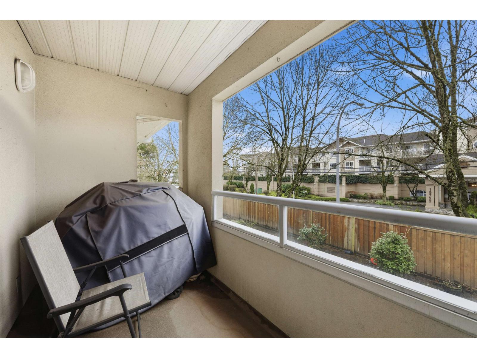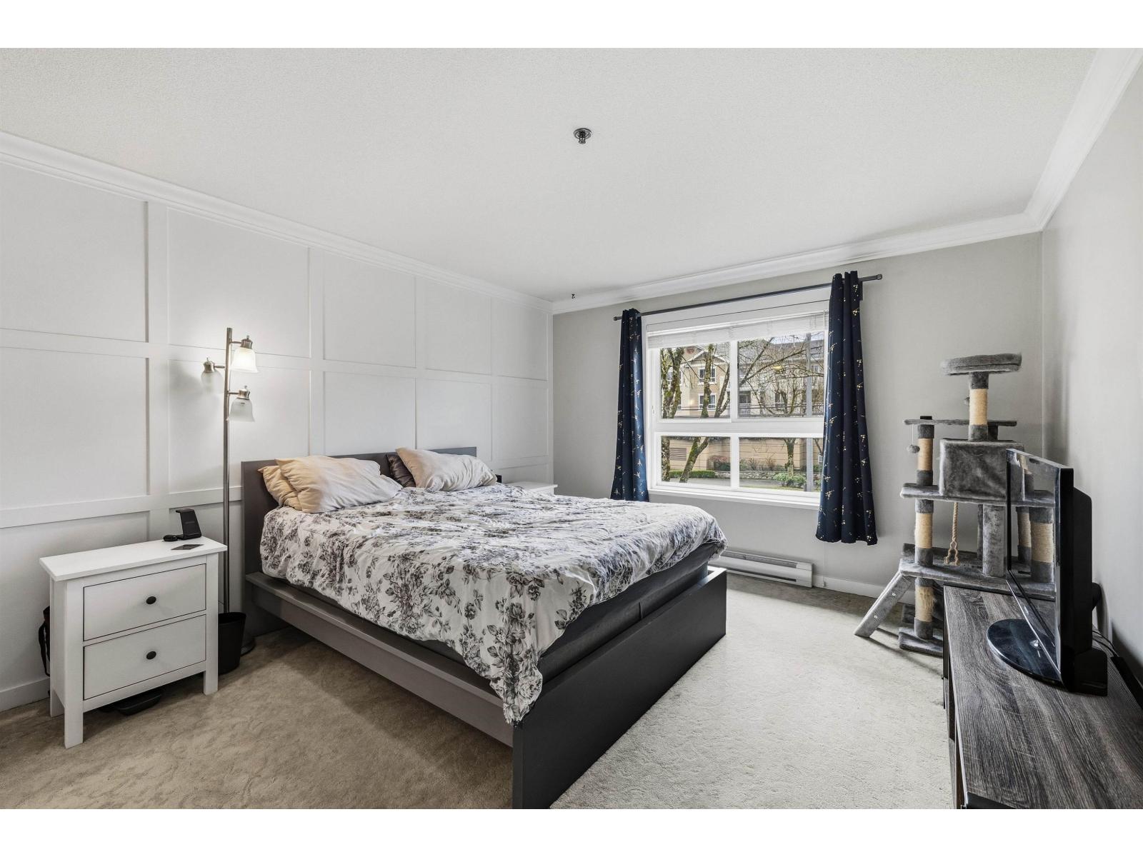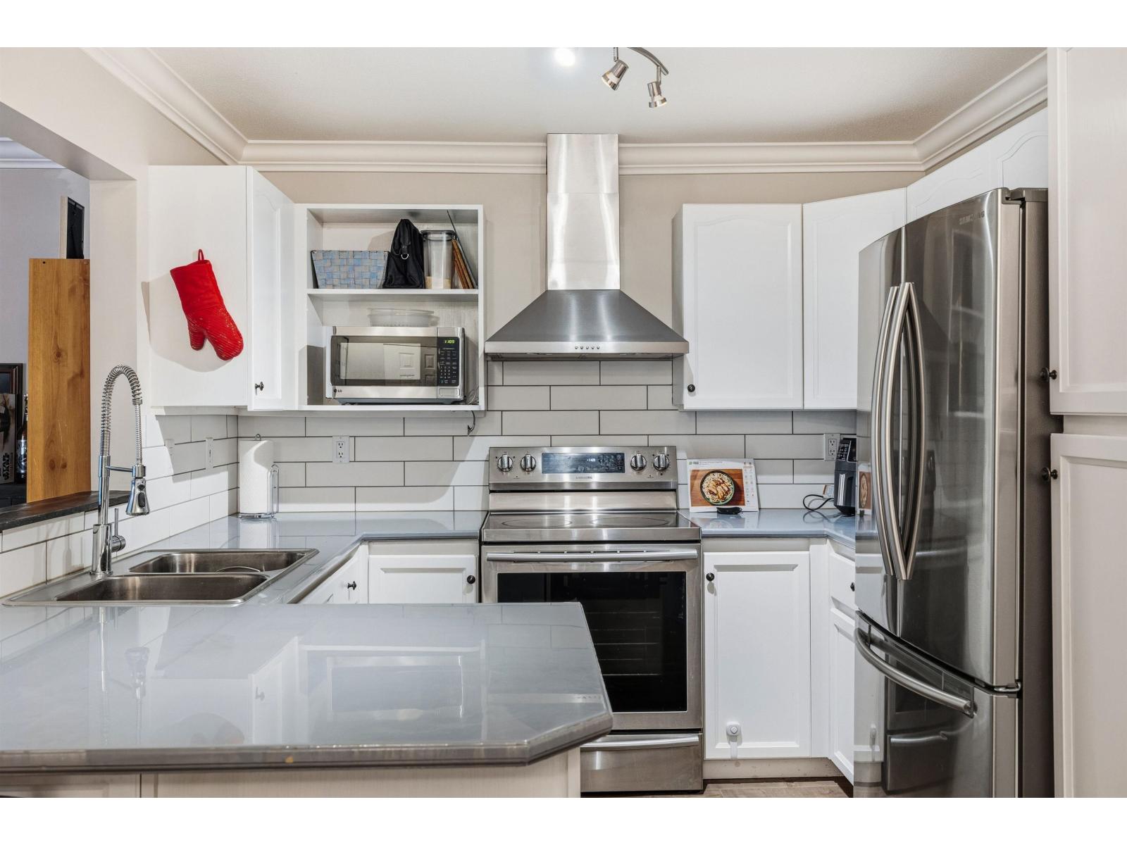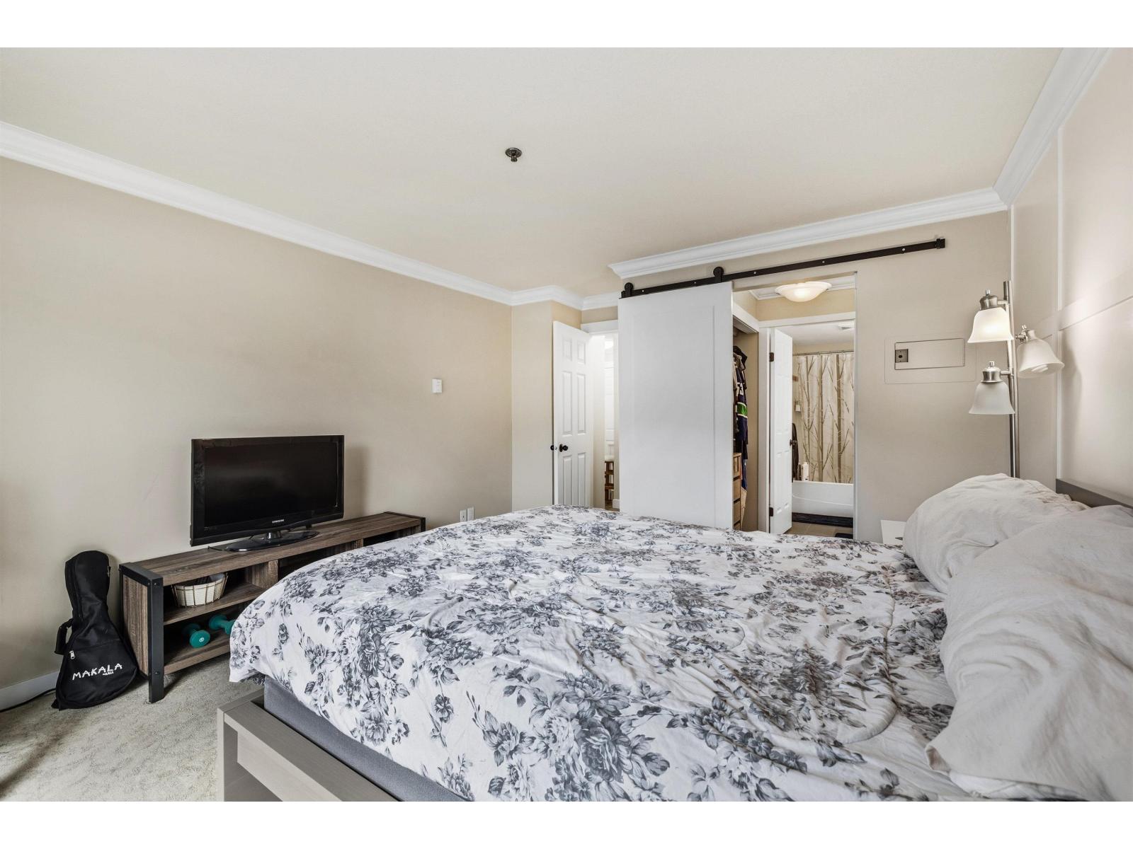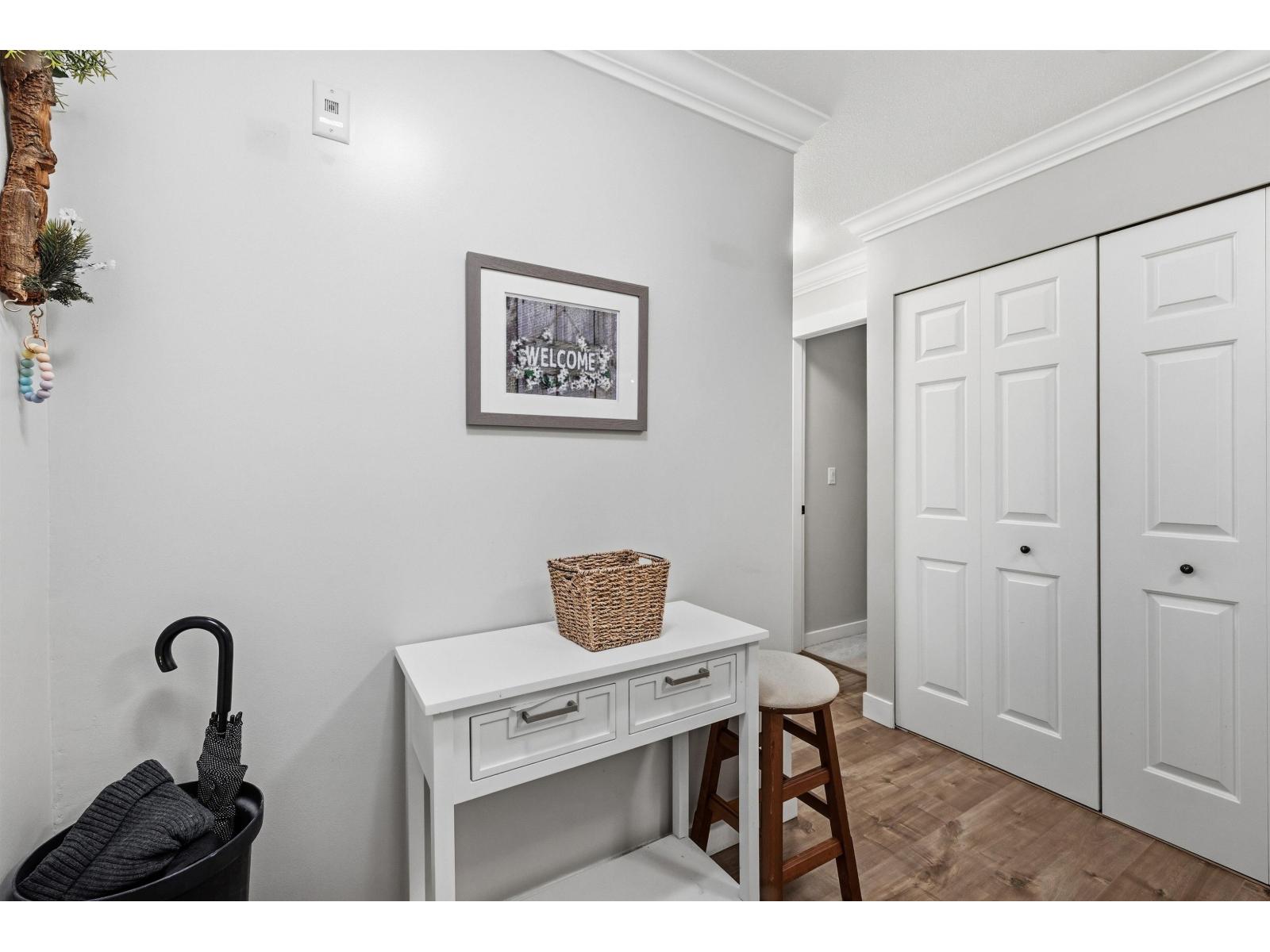 Prime location! This beautifully updated 1,087 sq ft, 2 bed, 2 bath home is just steps from everything Langley has to offer. Restaurants, Willowbrook Mall, transit, and the future SkyTrain are all within two blocks of your front door. A welcoming foyer opens into an inviting living area highlighted by a striking stone fireplace. Extensively renovated in 2020, the home features laminate flooring, designer paint colours, an updated kitchen, and elegant crown mouldings throughout. The generous primary bedroom boasts a feature wall, barn door to walk-through closet leading to ensuite. Relax and unwind on the south-facing covered patio, perfect for summer evenings. Complete with in-suite laundry, pet-friendly living, and two parking stalls, storage on the same floor. An exceptional opportunity! (id:64528)