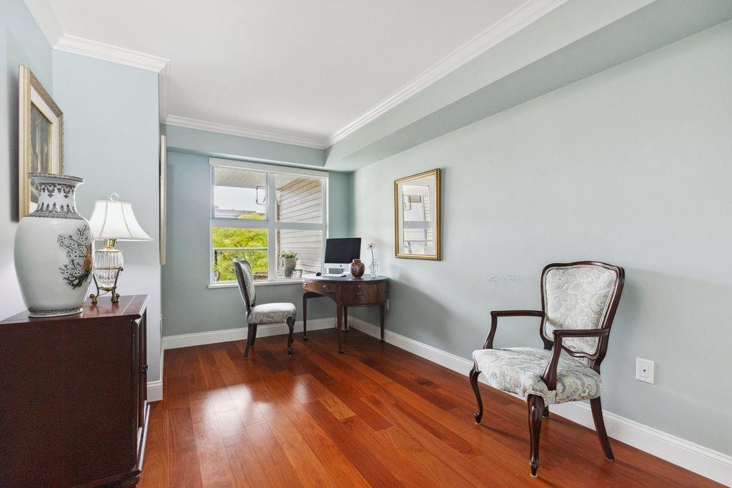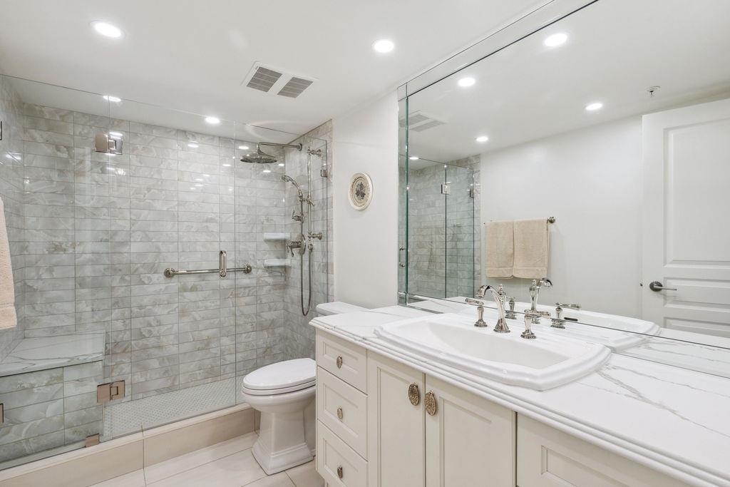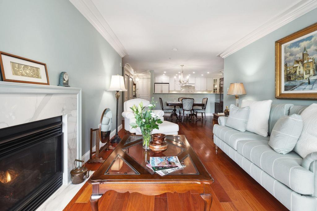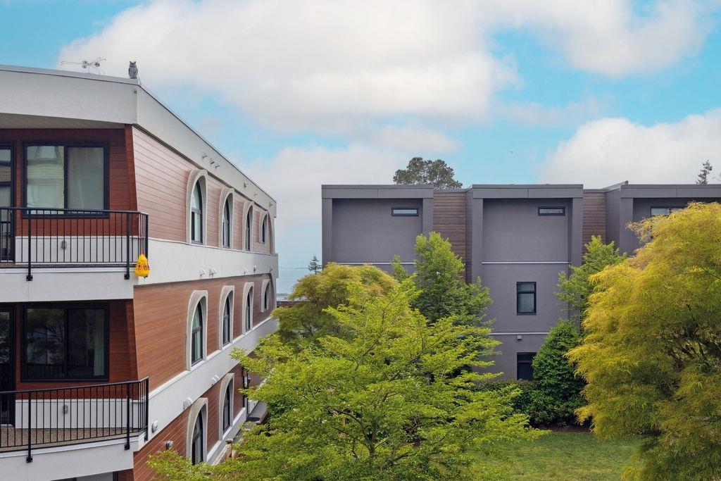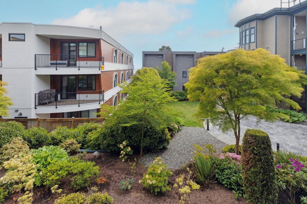QUALITY 2bd + 2bth 1315 sq. ft condo in Five Corners. From superior designer kitchen & bathrooms (Carrara marble counters) to Lauzon Designer Collection engineered hardwood, radiant in-floor heating, crown moulding, & custom electric Sonoma blinds, every element reflects a commitment to elegance & functionality. The home is further elevated by exquisite Swarovski/Schonbek crystal chandeliers & light fixtures. The chefs kitchen is equipped w. premium appliances, incl. a 36-inch French door refrigerator, built-in electric oven/cooktop & LG digital washer/dryer tower (Apr 2025). Spacious balcony w. south exposure & courtyard/ocean views. Storage locker. Thoughtfully designed from top to bottom by an interior designer w. no expense spared! Beach, shops & restaurants. (id:64528)