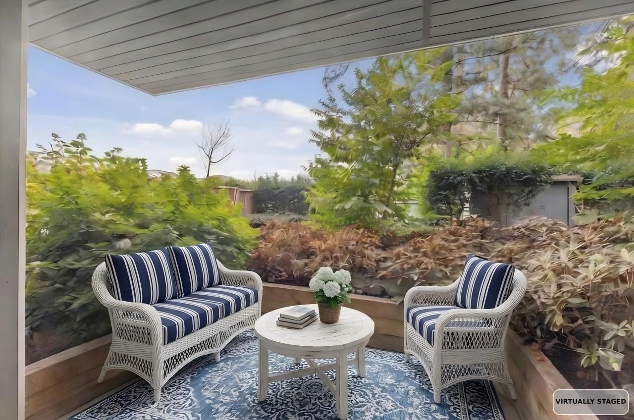 The Wesley - where modern elegance meets the rare luxury of a private backyard retreat. This exceptional south-facing ground-floor corner unit offers refined living with central A/C and a peaceful greenbelt backdrop. Step into your exclusive yard, a true extension of your home-perfect for relaxing or entertaining in a serene natural setting. Inside, the bright open layout features a stylish kitchen with stainless steel appliances and a sleek eating bar. The split-bedroom design ensures privacy, complemented by spa-inspired bathrooms and elegant finishes throughout. Ideally located near parks, trails, shopping, and dining, and just minutes to the future SkyTrain, offering outstanding convenience and strong appreciation potential.Open House April 19 (Sun) 2-4pm. (id:64528)