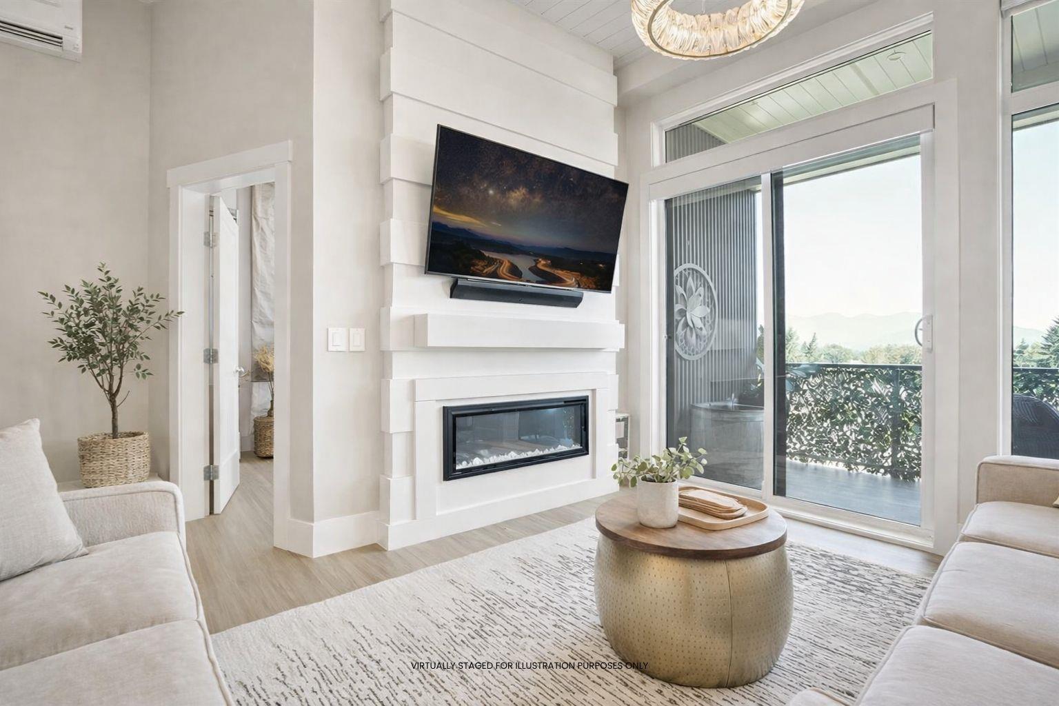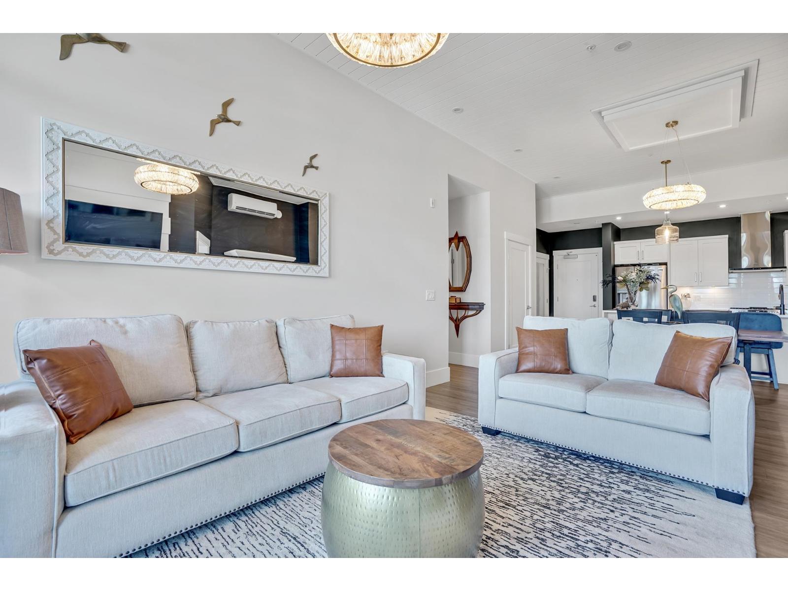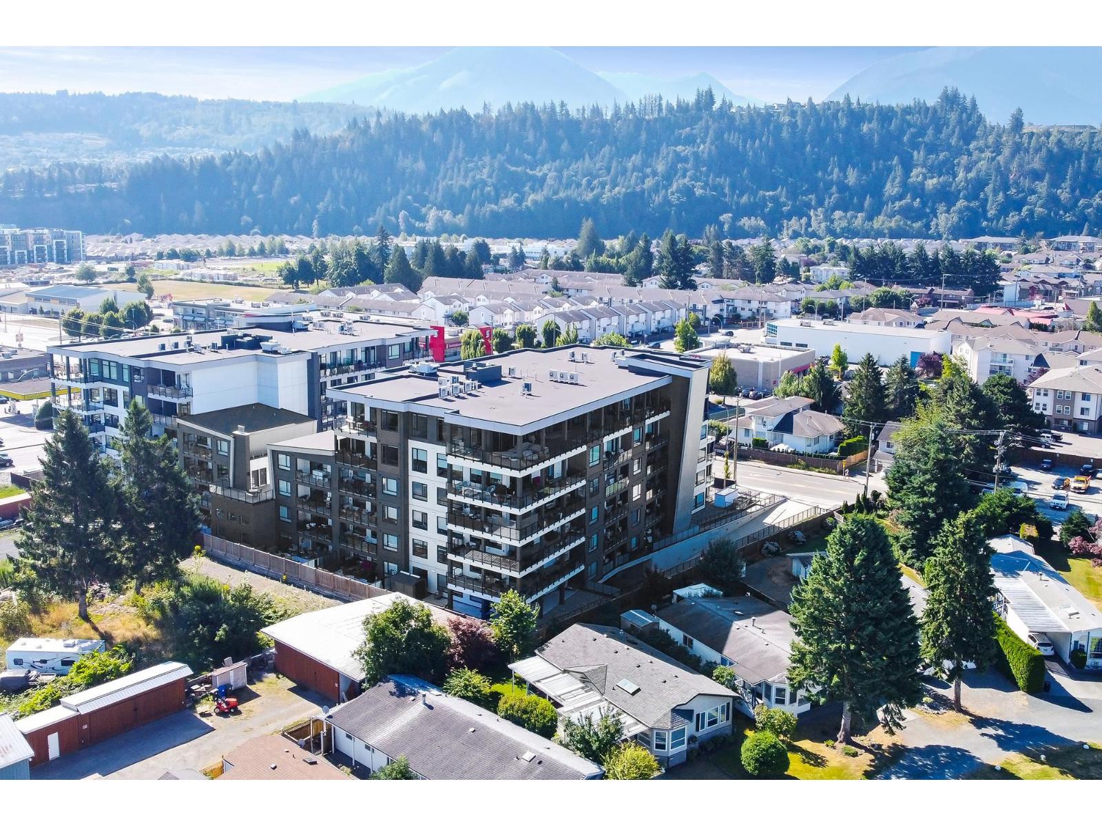 Welcome to refined living in this professionally designed 2-bed, 2-bath + den Sub-Penthouse! perfect for your next chapter. Thoughtful touches include crystal chandeliers, 11-ft ceilings, a warm, elegant colour palette, and an upgraded kitchen with custom pantry. Enjoy a walk-in closet that feels like a dressing room, a serene primary bedroom, power blinds on all windows, heat pump/AC, and stunning mountain views. With a secure EV charger dedicated to your parking spot, a vibrant community room and rooftop terrace with gas fire pits and BBQ, this move-in-ready home offers connection, comfort, and ease in the heart of Sardis. Did we mention the stunning views and that we are on the quiet side of the building? Call your REALTOR today. (id:64528)