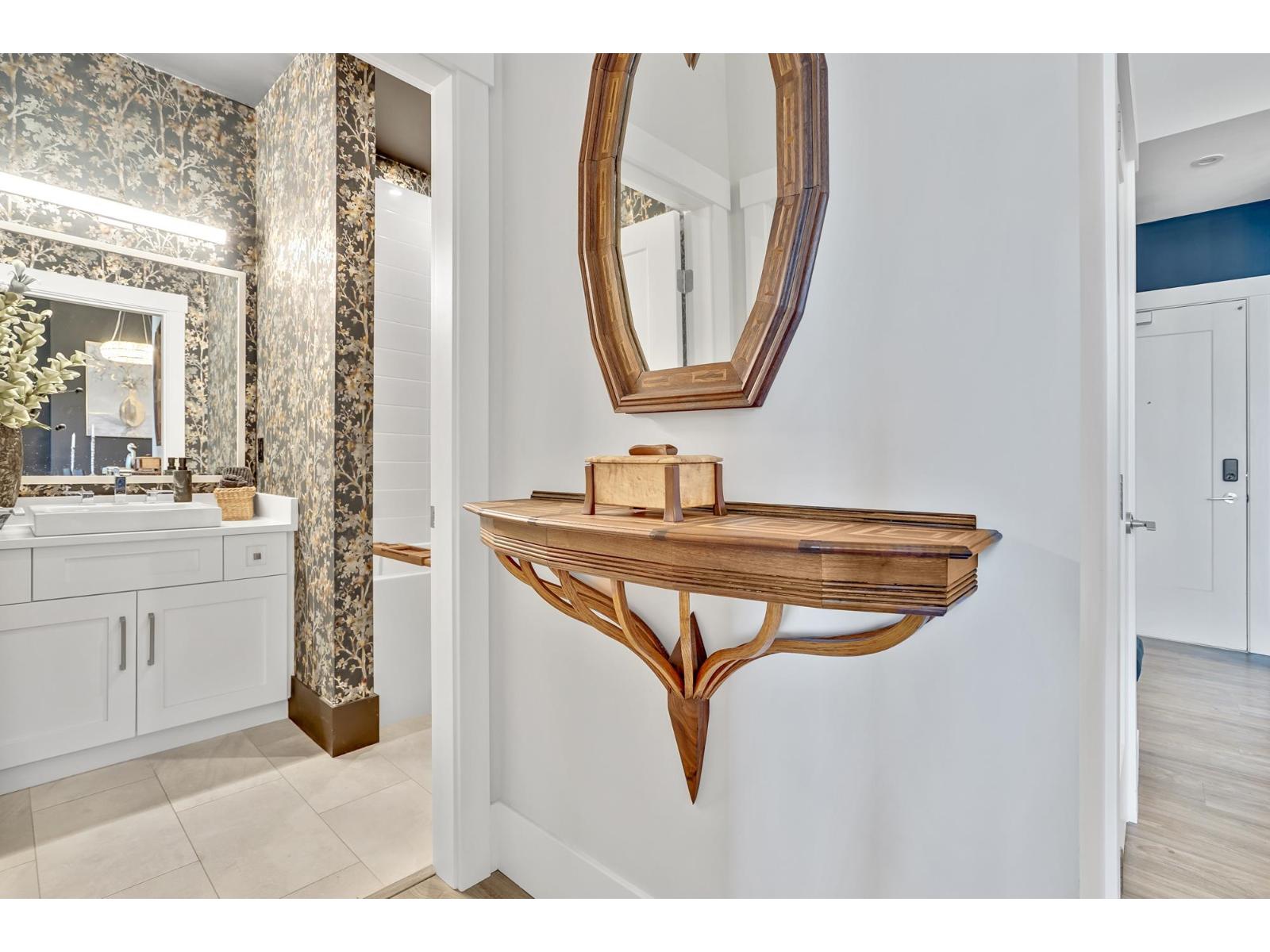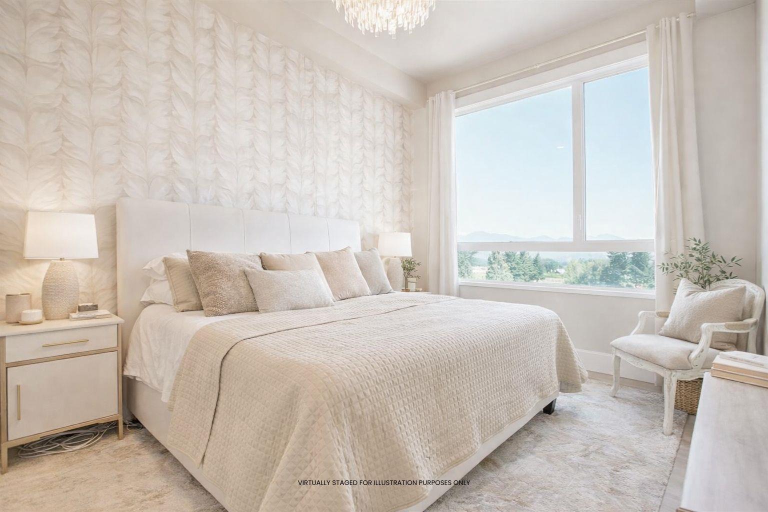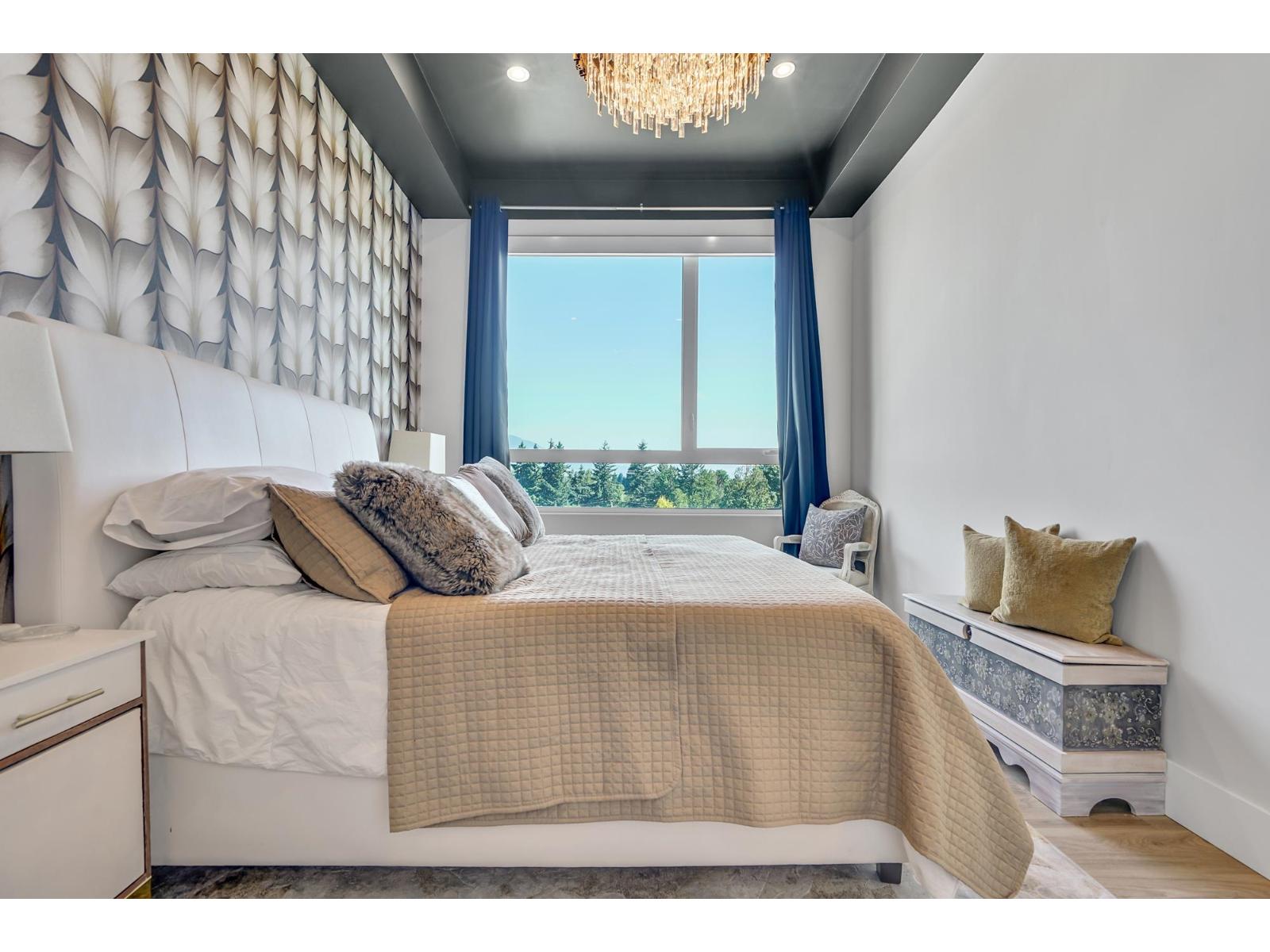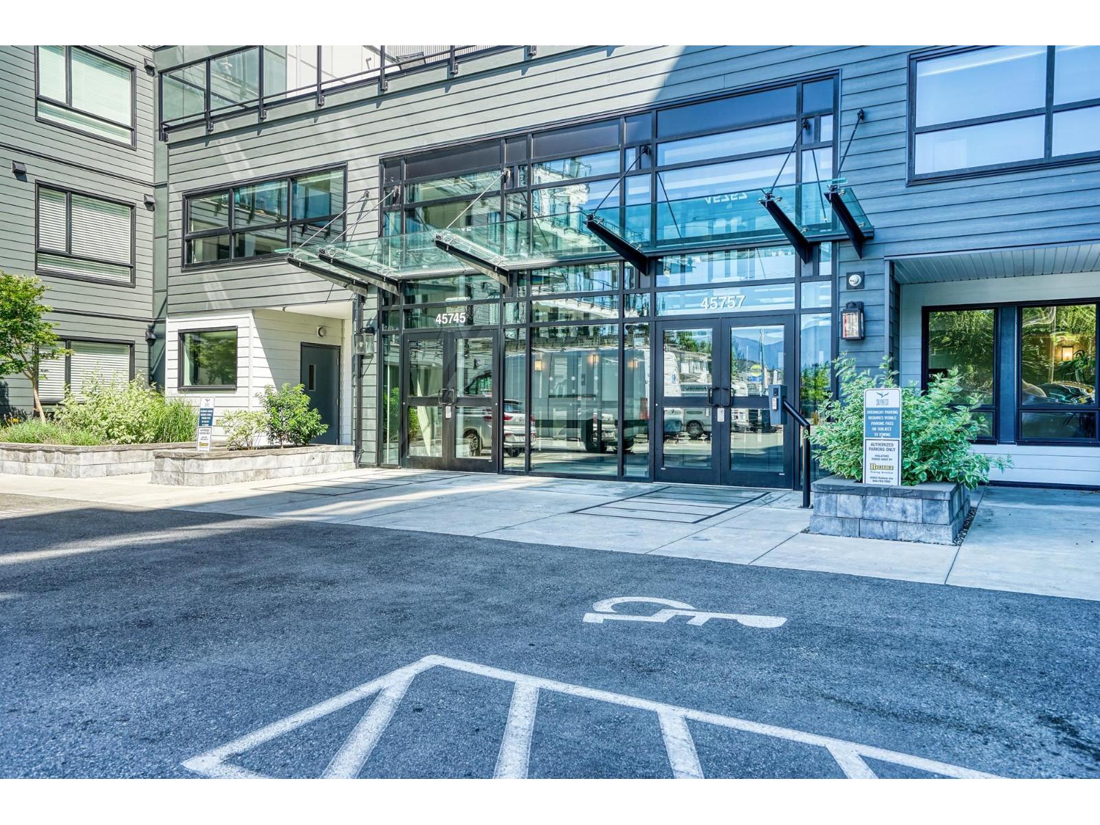 Welcome to refined living in this professionally designed 2-bed, 2-bath + den Sub-Penthouse! perfect for your next chapter. Thoughtful touches include crystal chandeliers, 11-ft ceilings, a warm, elegant colour palette, and an upgraded kitchen with custom pantry. Enjoy a walk-in closet that feels like a dressing room, a serene primary bedroom, power blinds on all windows, heat pump/AC, and stunning mountain views. With a secure EV charger dedicated to your parking spot, a vibrant community room and rooftop terrace with gas fire pits and BBQ, this move-in-ready home offers connection, comfort, and ease in the heart of Sardis. Did we mention the stunning views and that we are on the quiet side of the building? Call your REALTOR today. (id:64528)
