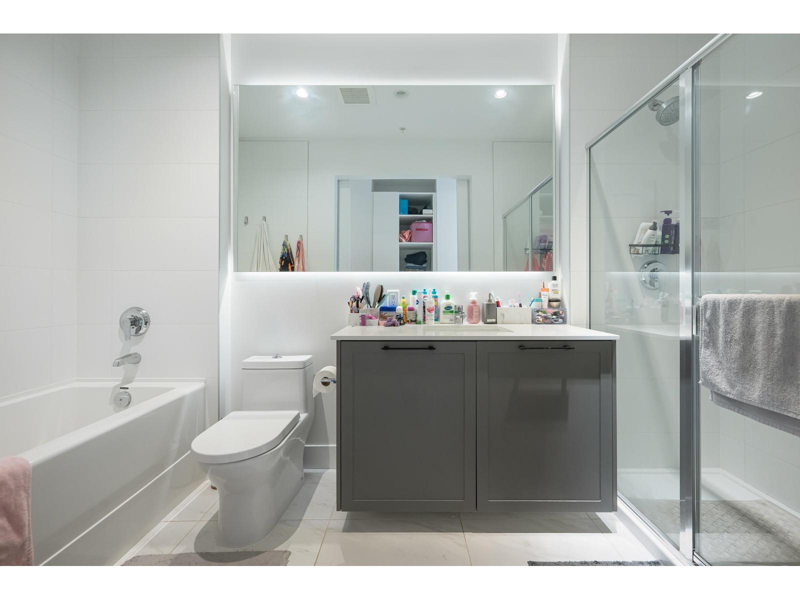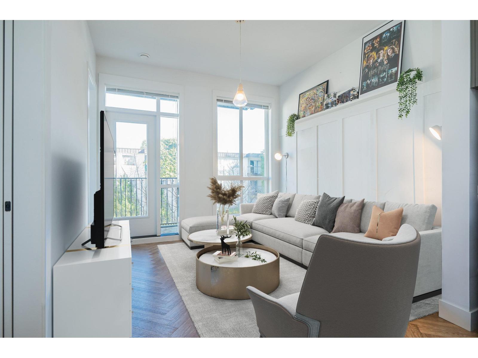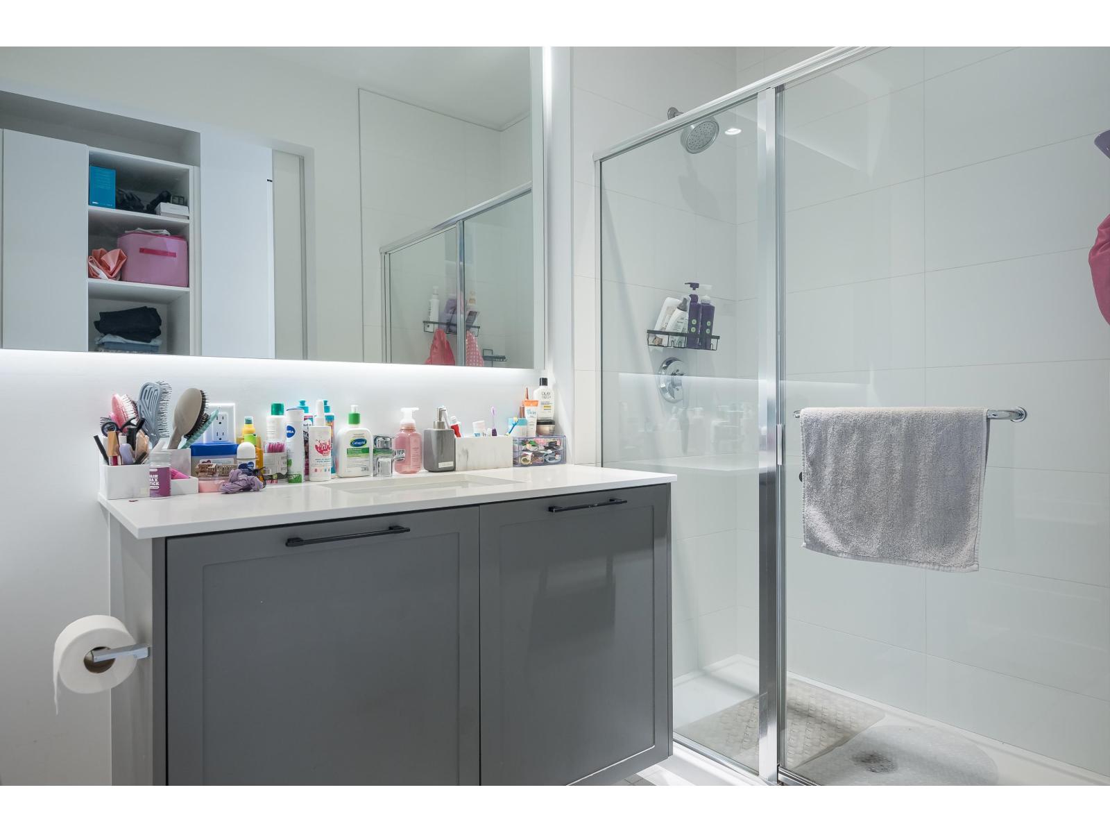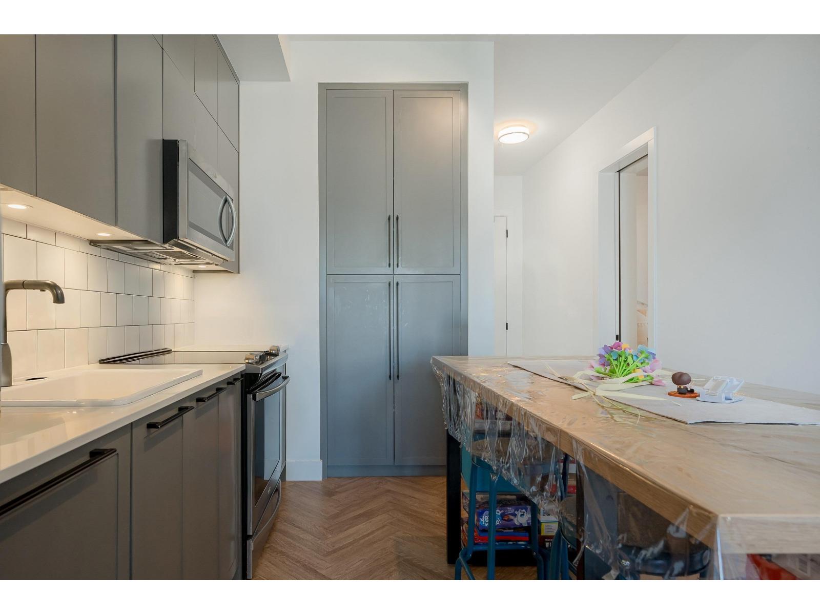 Welcome to Guildhouse II by award-winning Mosaic Homes, still under warranty. Lovely, modern 2 bedroom, 2 bathroom condo with soaring 10' ceilings and over-sized windows for lots of natural light. Peaceful, private outlook towards trees and garden with balcony for relaxing and bbqs. Excellent open-concept layout w spacious kitchen, high-end stainless steel appliances and pantry. Both bedrooms are a generous size with walk through closet and luxurious ensuite bathroom. Powder room for convenience. Two side-by-side parking spaces. Pet friendly. Well-equipped recreation centre. Centrally located, steps to Guildford Town Centre, schools and transit. Tenants are leaving 30 June. (id:64528)