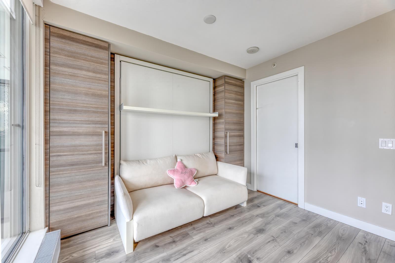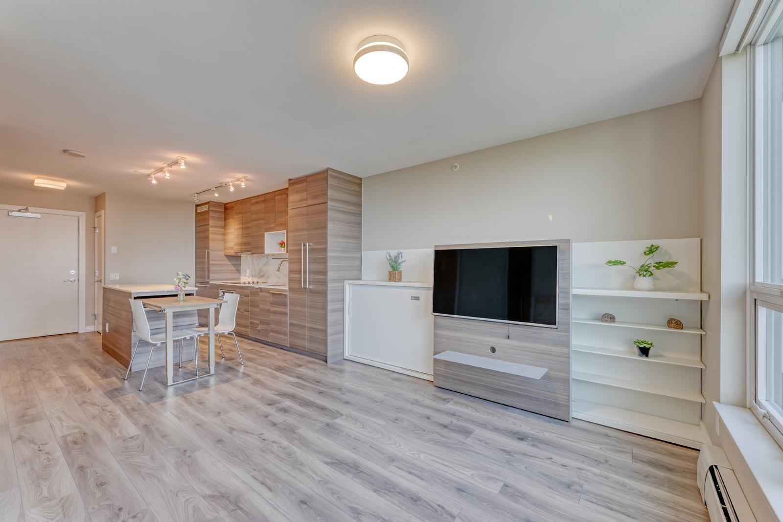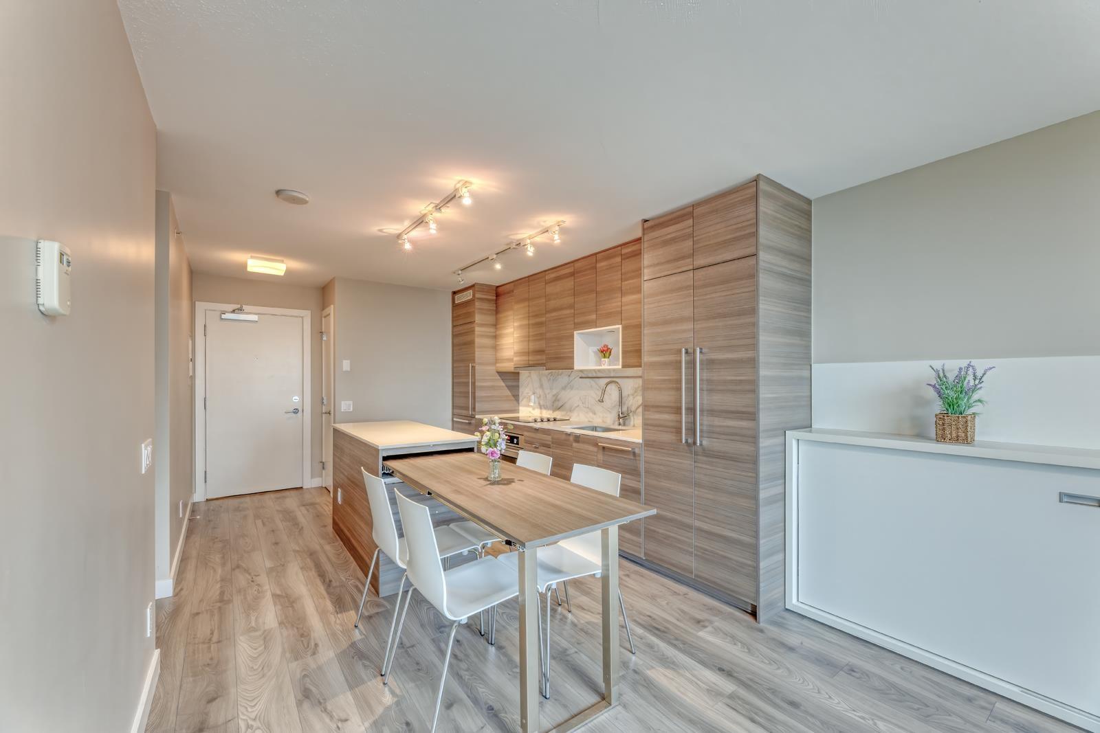 Welcome to University District Alumni Tower by BOSA! This one bedroom condo features BOSA SPACE integrated furniture, including a MURPHY BED with Queen Mattress & Built in Closets. A Chef style kitchen, including a Kitchen Island with a PULLOUT DINING TABLE fits Seating for 8 and Built-in Euro style Appliances & Quartz countertops. The Living Room includes a built in Wall Shelving that includes a floating TV PANEL and a GUEST BED. Euro-style stainless steel appliances. Quartz countertops, expandable dinging table for eight. Balcony with city & Mount Baker views. Exercise gym, meeting room, lounge and rooftop garden. 1 parking & 1 locker. Close to all amenities; malls, SkyTrain, public library, City Centre, SFU, parks, T&T. Easy to show. (id:64528)