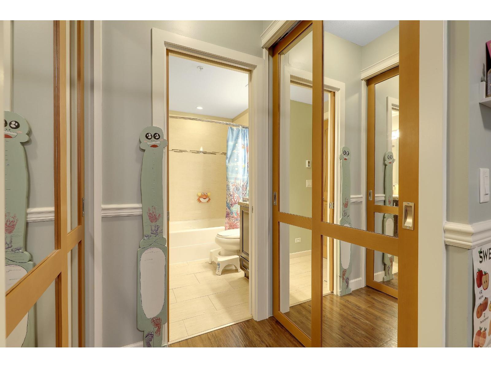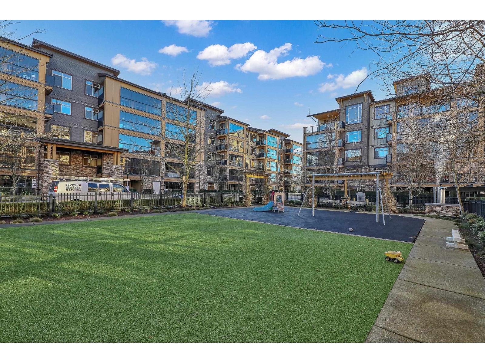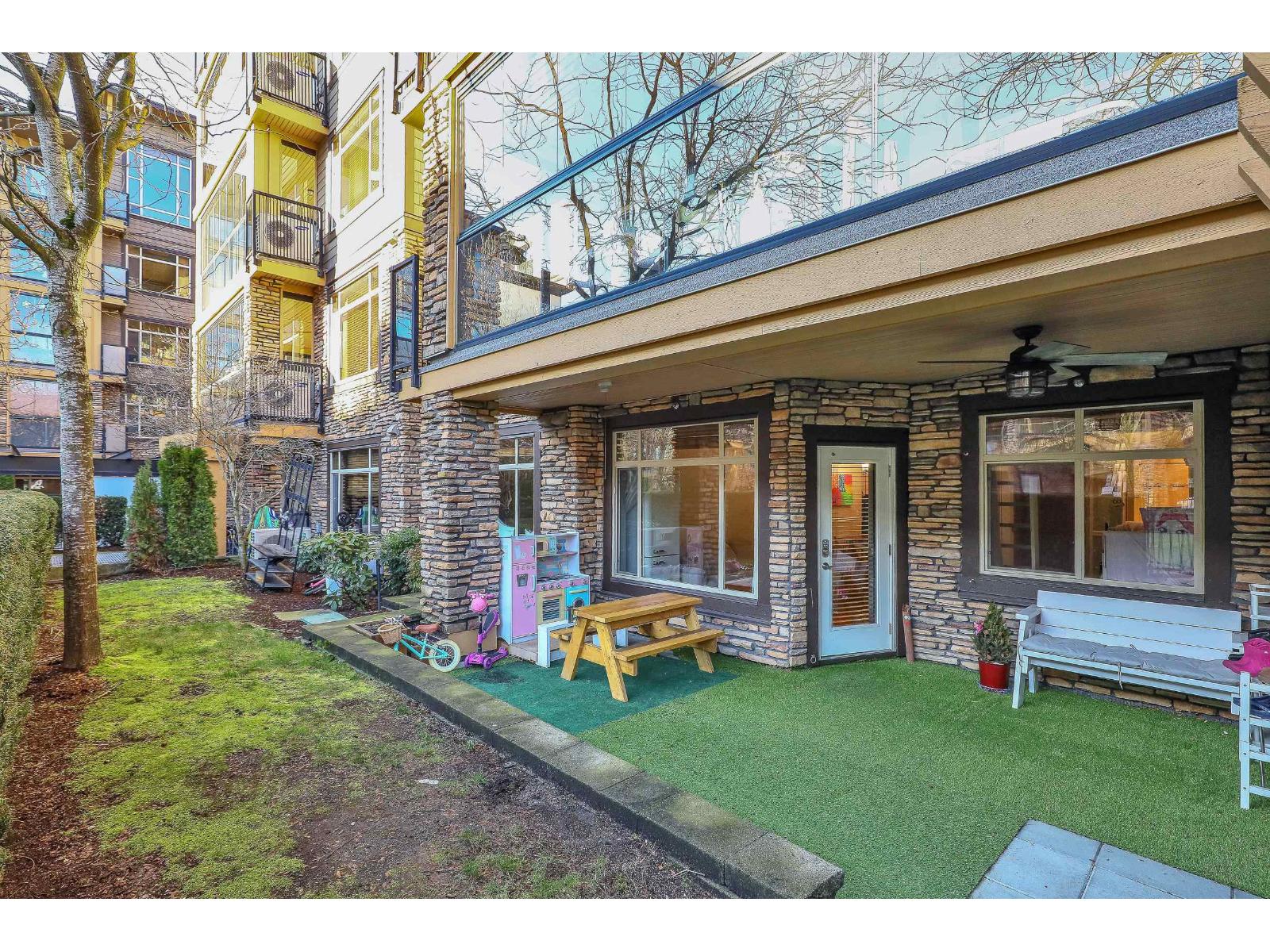 An ideal family home for young children, featuring direct access to a safe, fenced playground and a large patio! Spacious and bright south-facing ground-level 2 bedroom + DEN home (den can be used as a 3rd bedroom). Located in the fast-growing Willoughby Heights neighborhood, close to schools, shopping, restaurants, parks, Carvolth Rapid Bus, and easy highway access. Excellent layout with bedrooms on opposite sides for added privacy. Features include built-in A/C, laminate flooring throughout, granite countertops, bathrooms with heated floors, wood closet organizers, a built-in safe, and gas BBQ hookup. Includes 2 parking stalls and 1 secure roll-up garage storage locker with power outlet. Do not miss this one! (id:64528)