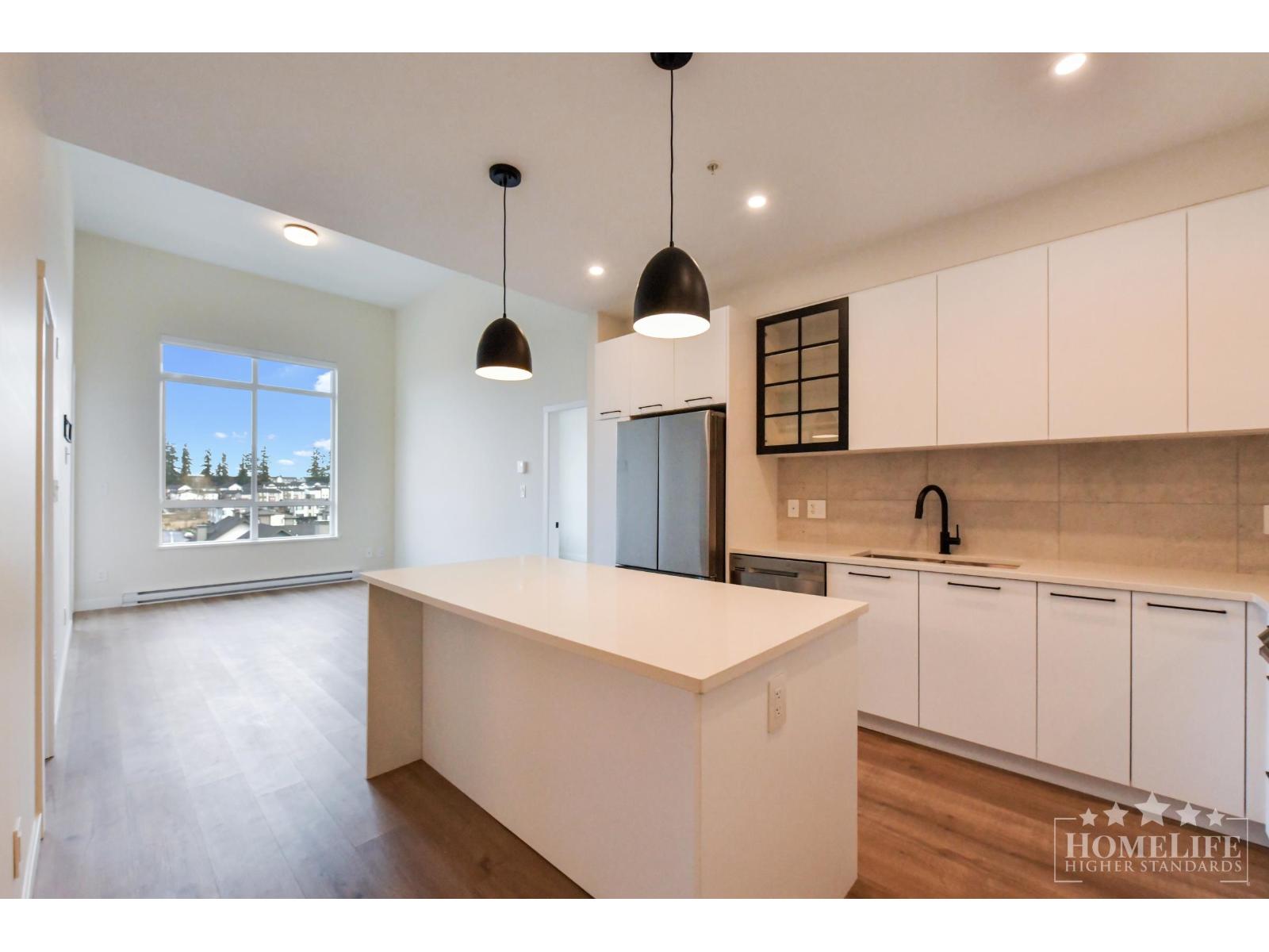 Stunning 2 bed, 2 bath penthouse in the desirable Willoughby Heights community. This top-floor residence offers vaulted ceilings, expansive windows, and unobstructed city and mountain views from every room. Both bedrooms are spacious primary suites featuring walk-in closets and ensuite bathrooms. The open-concept living space includes a chef-inspired kitchen with stainless steel appliances, built-in microwave, and oversized quartz island, ideal for entertaining. Quietly located on the private side of a well-maintained luxury building with fitness centre, resident lounge, playground, and secure package lockers. Close to parks, schools, trails, shopping, dining, and transit. Includes 1 parking stall and 1 storage locker. (id:64528)