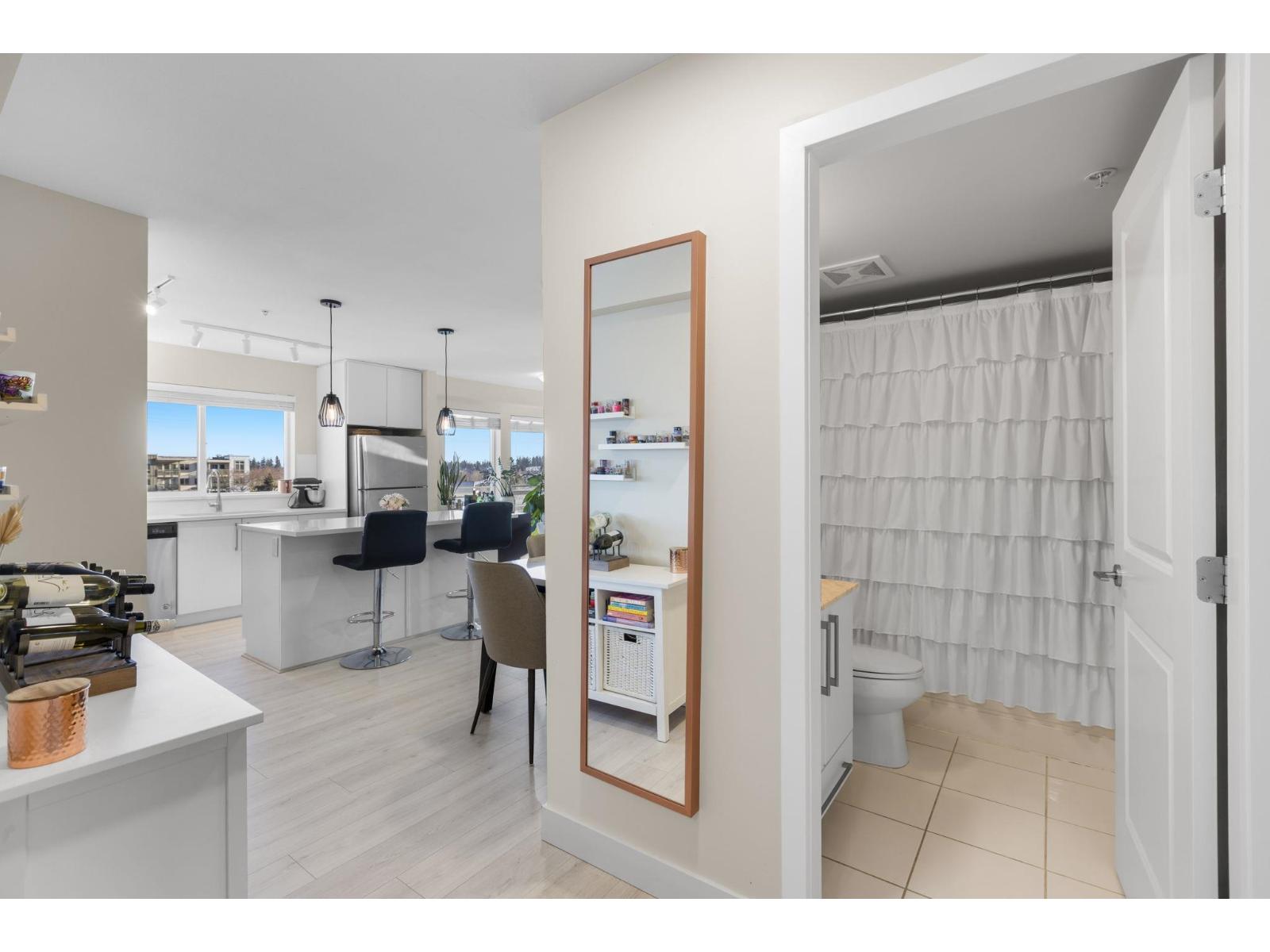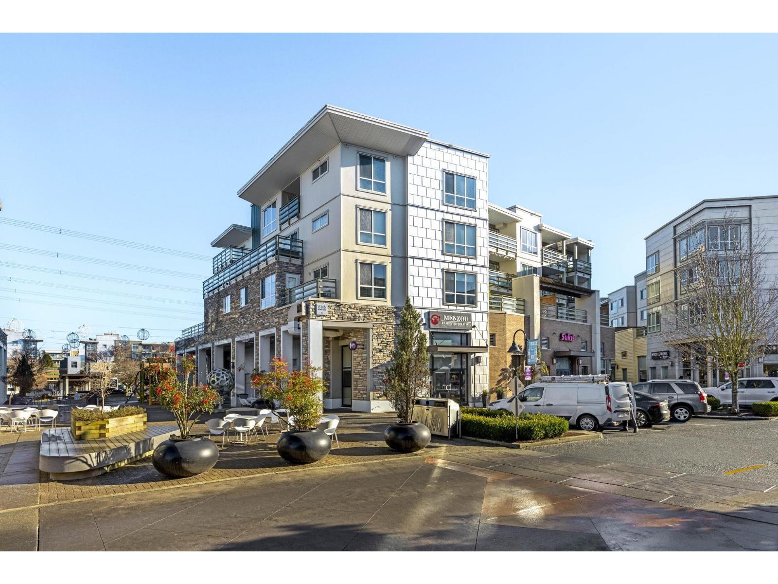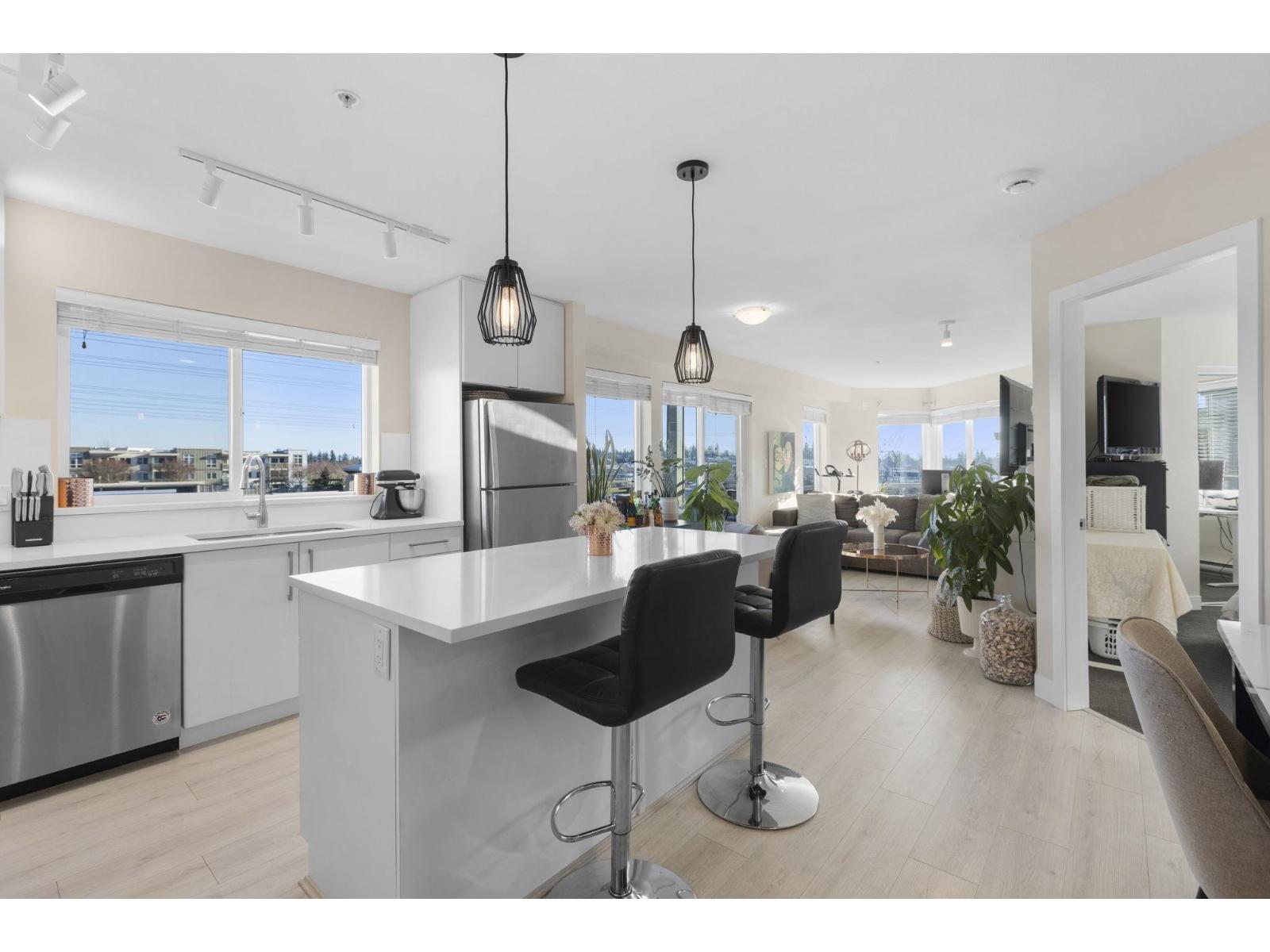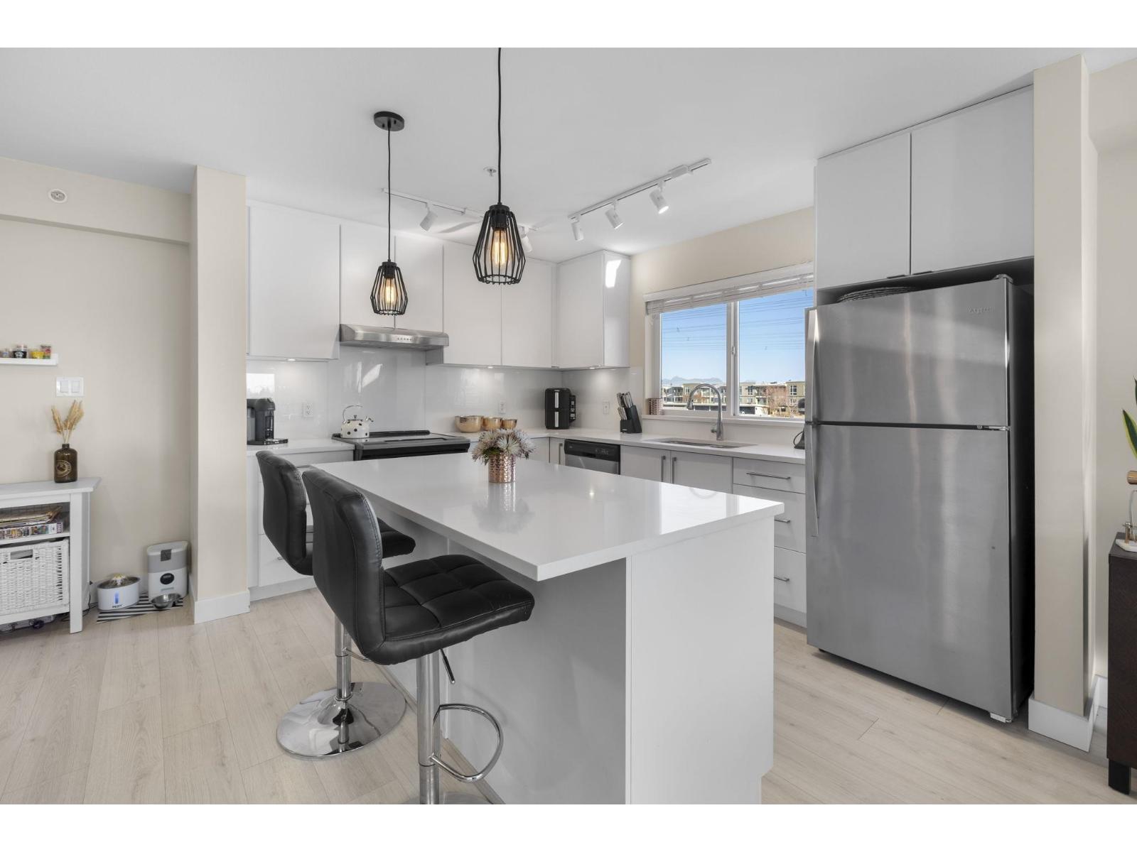 Welcome to PIVOT in Morgan Crossing - Situated on the top floor, this bright corner 1-bedroom home offers nearly 800 sq ft of well-designed living space. Expansive north and east windows bring in abundant natural light, enhancing the open layout. The kitchen features quartz counters, a generous island, and stainless steel appliances. A flexible bonus area easily accommodates a home office, bar setup, or added storage. Step outside to a roomy patio, perfect for outdoor dining. One secure parking stall close to the entrance and a large storage locker are included. Two pets welcome with no size limits and rentals allowed. Walk to shops, groceries, and restaurants just outside your door. OPEN HOUSE: Sat. Feb 21st from 11am-1pm (id:64528)