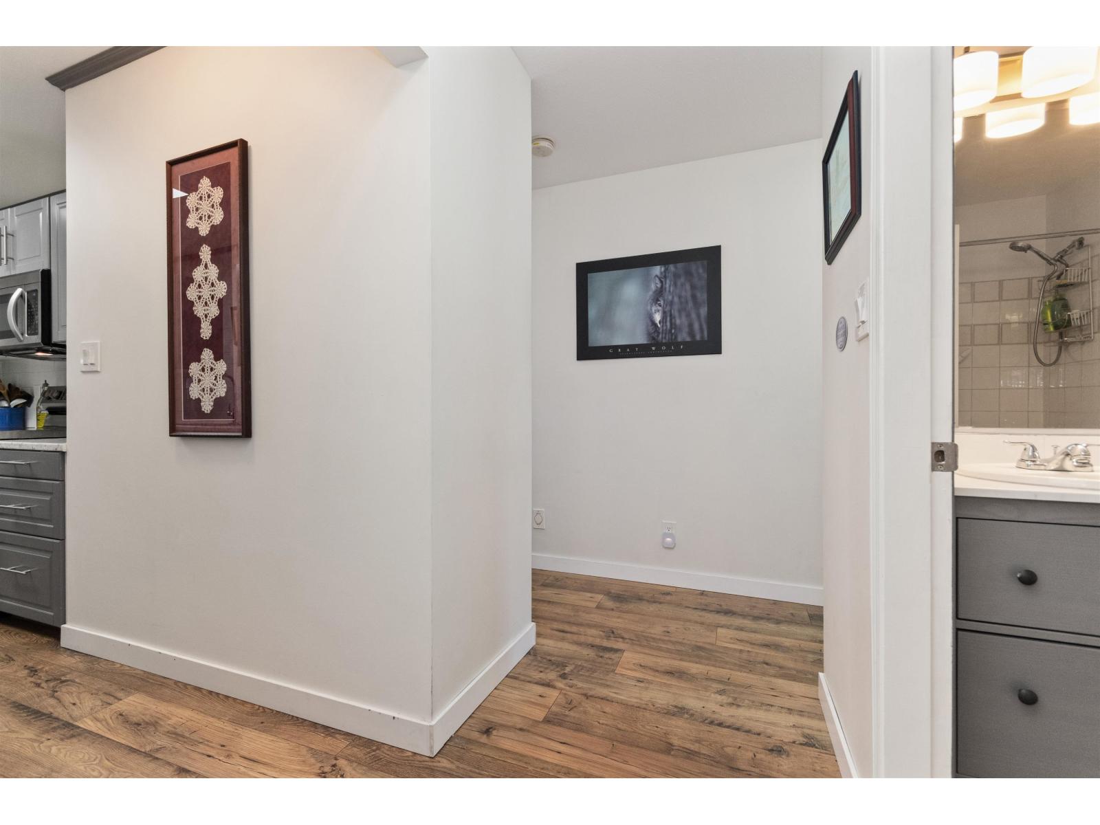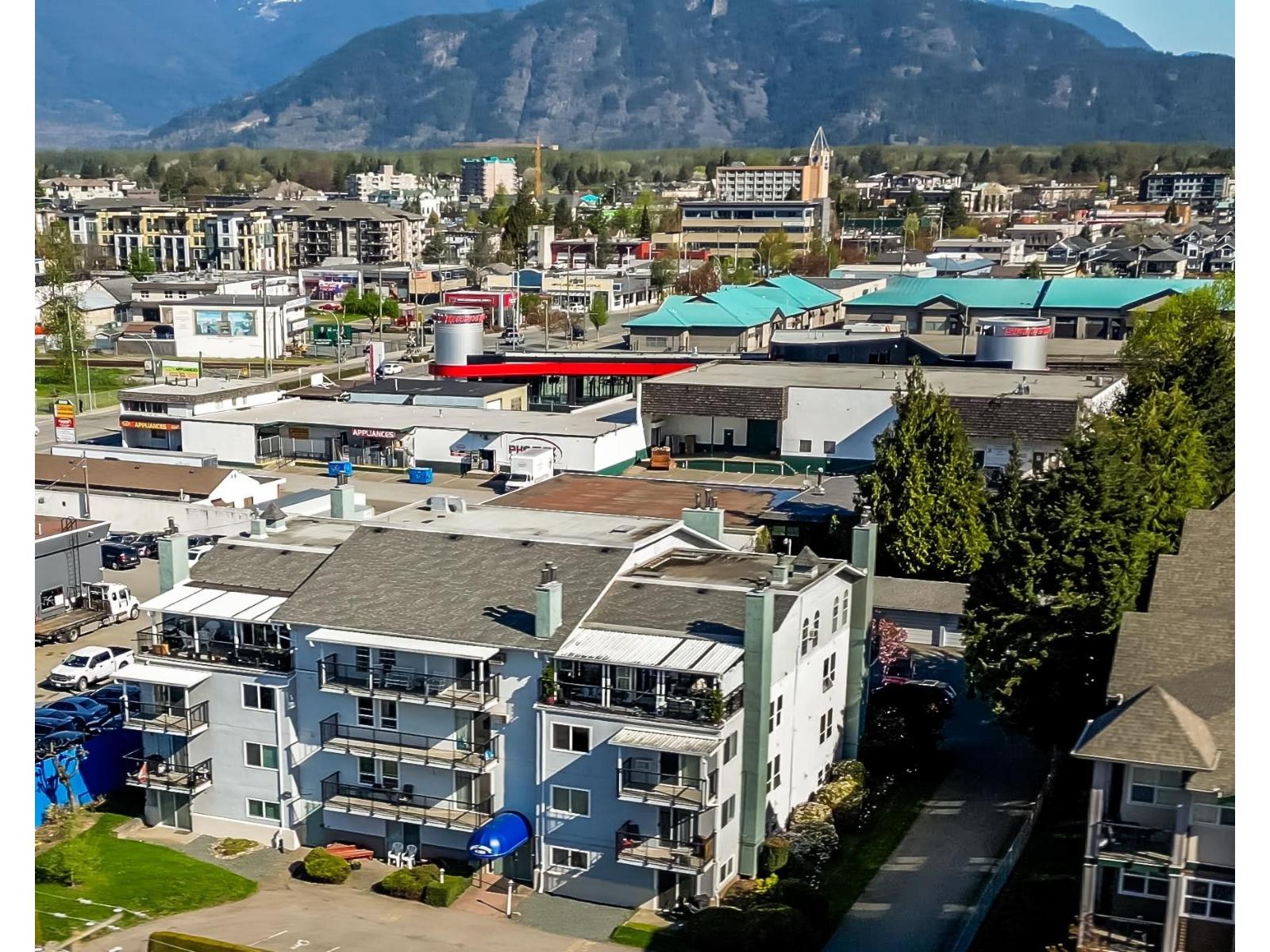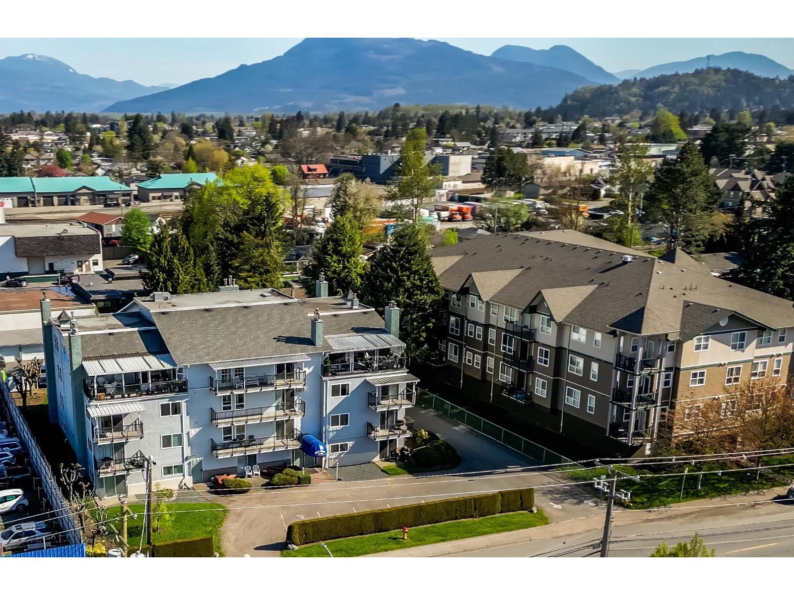 Welcome to 'HAZELDENE", a small 21 unit, well run strata. Spacious & BRIGHT 1240 sq ft., 2 bed/2 full bath TOP FLOOR CORNER unit. Lots of outdoor living space w/MOUNTAIN views from MASSIVE north & south facing covered BALCONIES. Living rm features cozy, updated gas fireplace, corner windows. Dining rm w/walkout to covered SOLARIUM w/wet bar. Huge PRIMARY boasts walk-in closet & 4pc ensuite w/dual sinks, sep shower. 2nd bdrm is also a generous size. Lots of updates incl. paint, kitchen w/newer SS appliances, carpet. Heat pump (AC/heat), hot water tank & gas FP 2022; waterproof wide-plank laminate 2025. Lots of storage. 1 covered parking, extra pkg subj to avail. All AGES & RENTALS welcome. NO PETS. Great location close to DISTRICT 1881. Perfect for 1st-time buyers, downsizers. (id:64528)