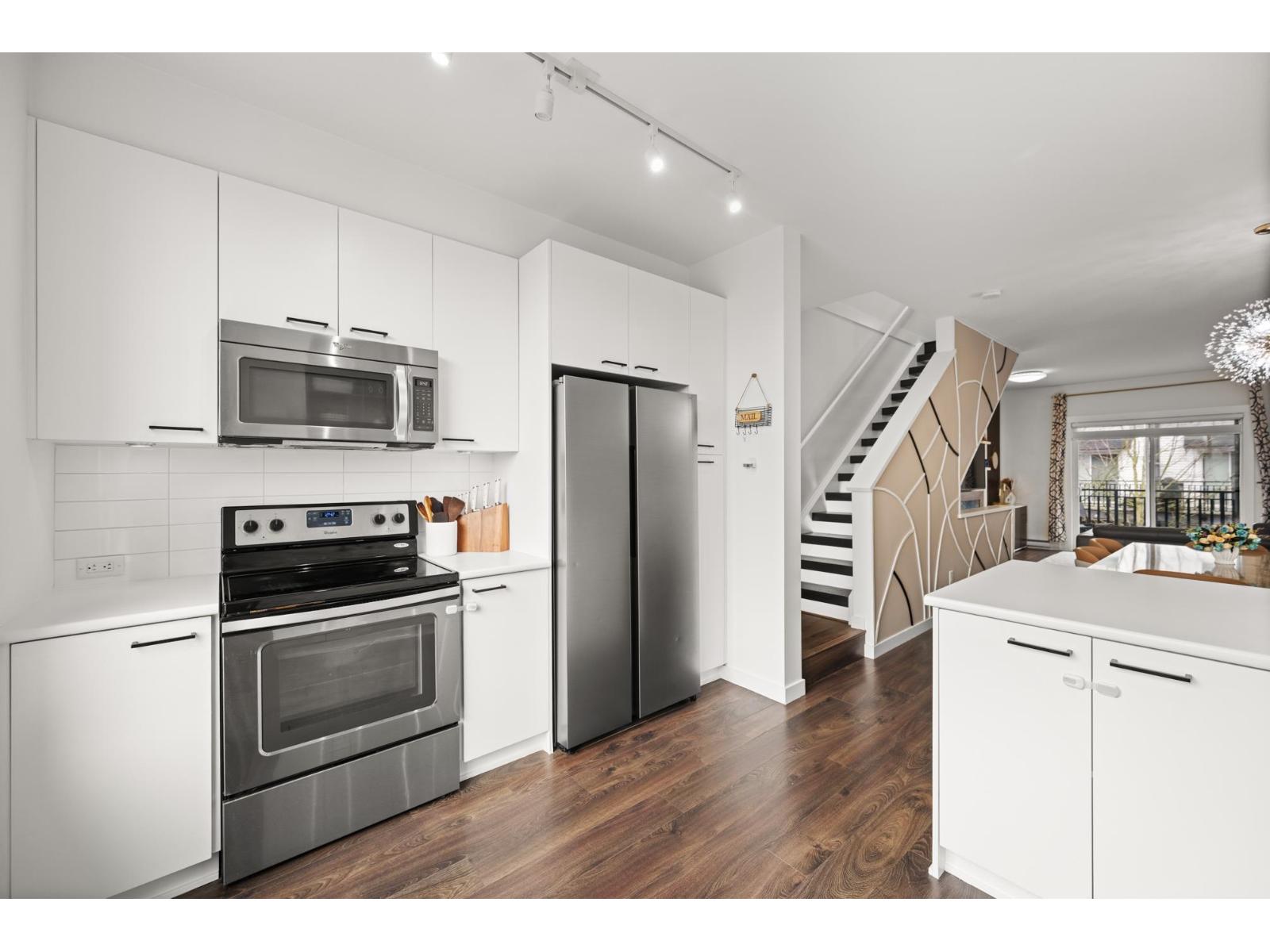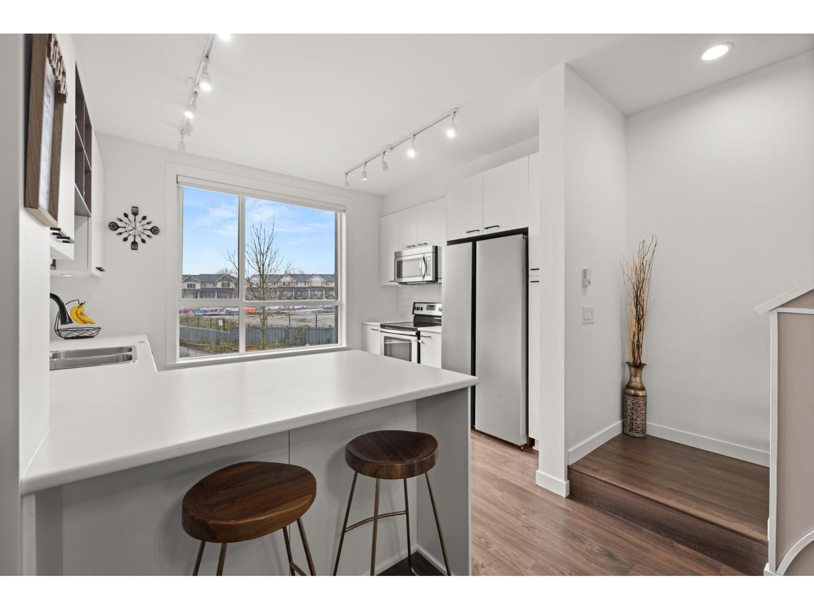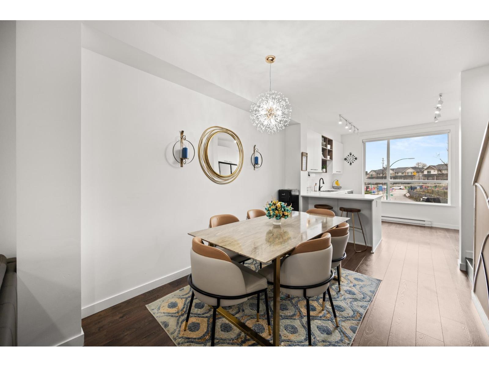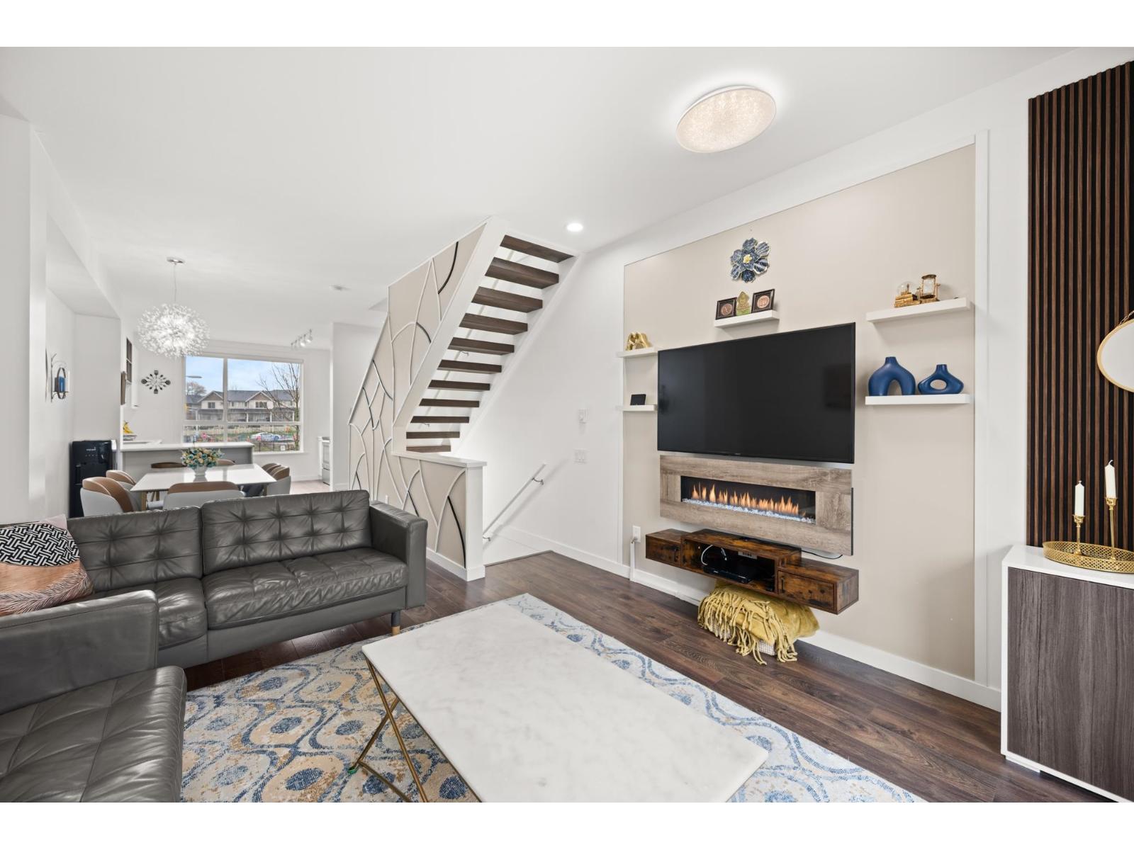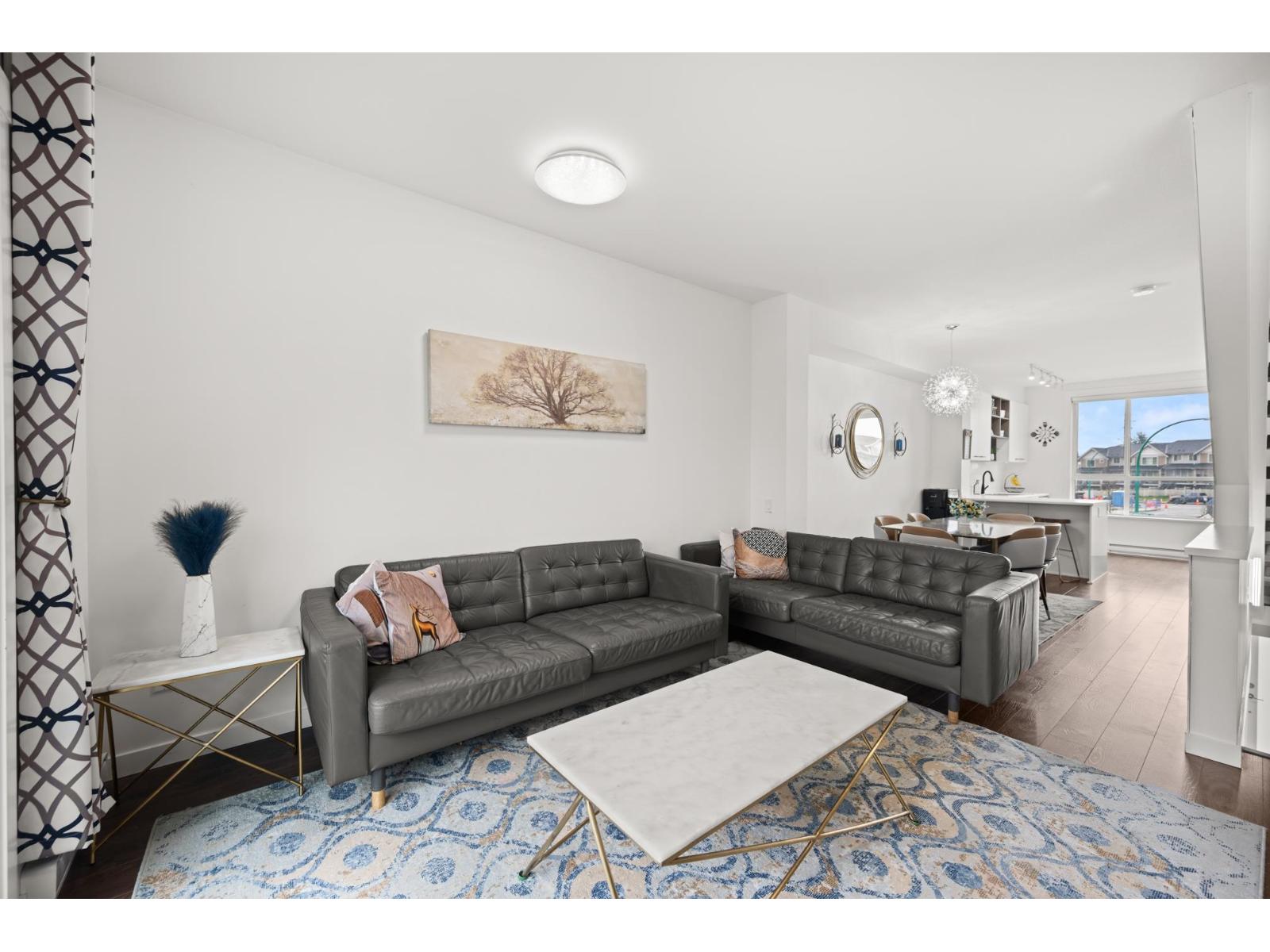 Welcome to this beautifully cared-for, southwest-facing Mosaic home, offering modern design & elegant finishes throughout. This 2-bedroom plus den layout is thoughtfully designed w/open-concept main-floor living, a convenient powder room on the entry level next to den (home office), and two spacious bedrooms with full baths upstairs. Enjoy sunset views from the gourmet kitchen w/ breakfast bar, ample counter space, & room to entertain. Earth-toned wide-plank laminate flooring enhances the bright living area while the stunning open-riser floating staircase makes a statement. Oversized windows flood the home with natural light. Ideally located steps from Clayton Market Retail Village, major amenities, restaurants, Willowbrook Mall, and transit. Parking for 2, garage & driveway. (id:64528)