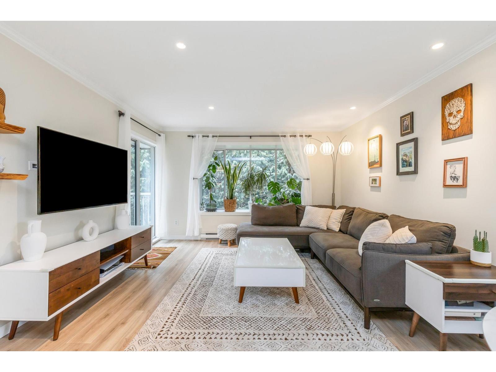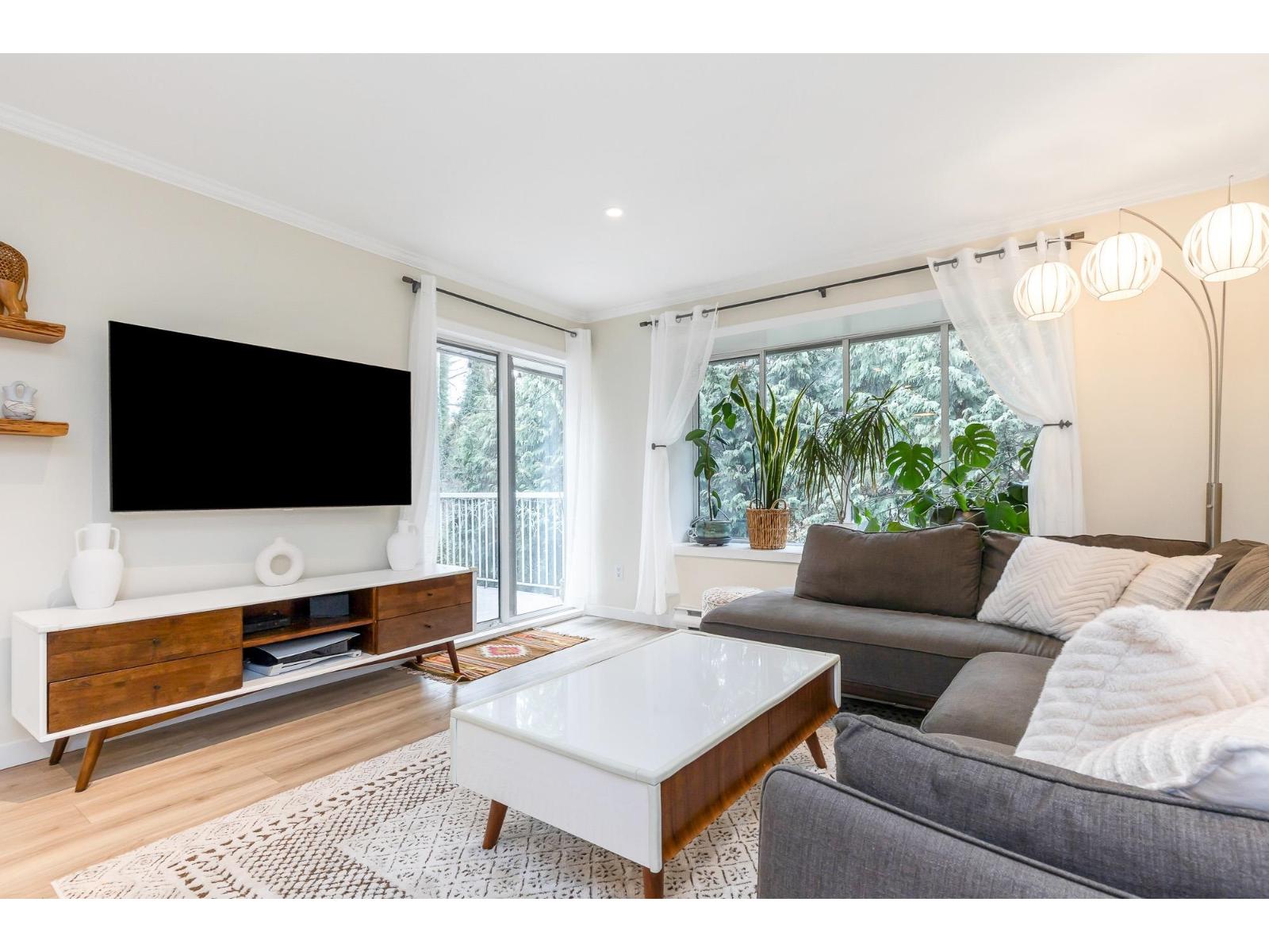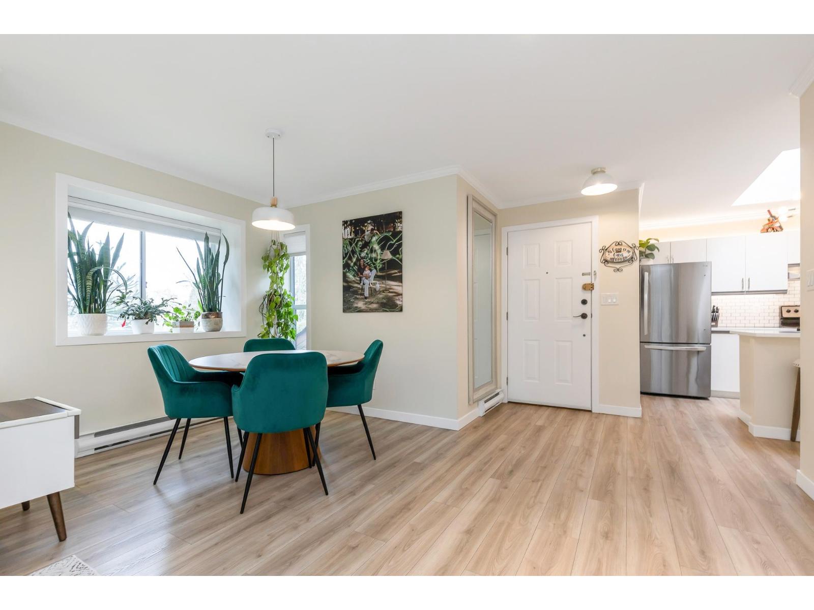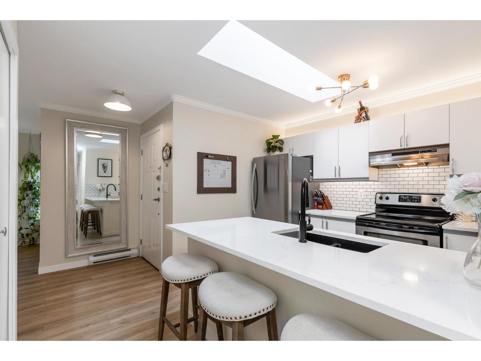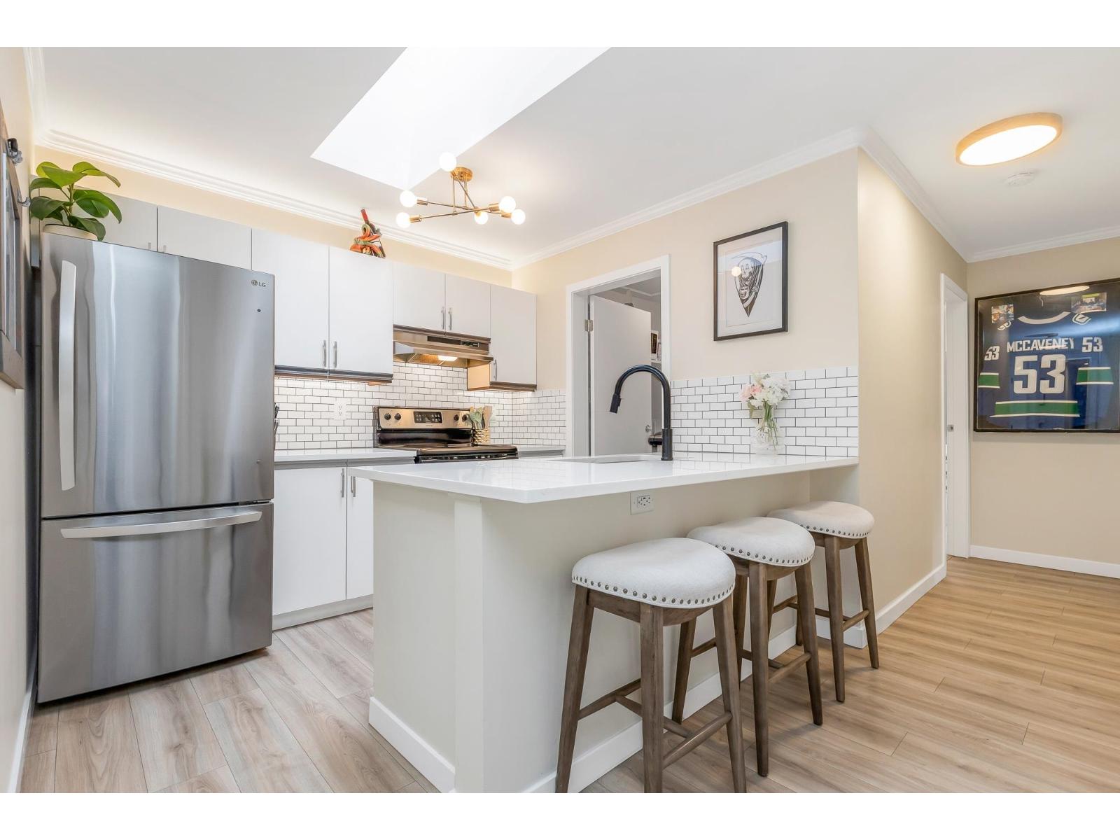 Top corner townhome with a bright open layout. Lots of windows and 2 skylights for plenty of natural light. Stylish updates throughout including designer colours, newer flooring, quartz counter tops, stylish backsplash, crown mouldings and pot lights to mention a few. Spacious walk-through closet with cheater ensuite access. Private balcony overlooking treed area. Park is 1 block away and easy access to Hwy 1 and the pedestrian overpass to UFV. Pet friendly with no age restrictions. Nothing to do here but move in and enjoy! 2 parking spots available. 1 cat or 1 dog max 25lbs (id:64528)