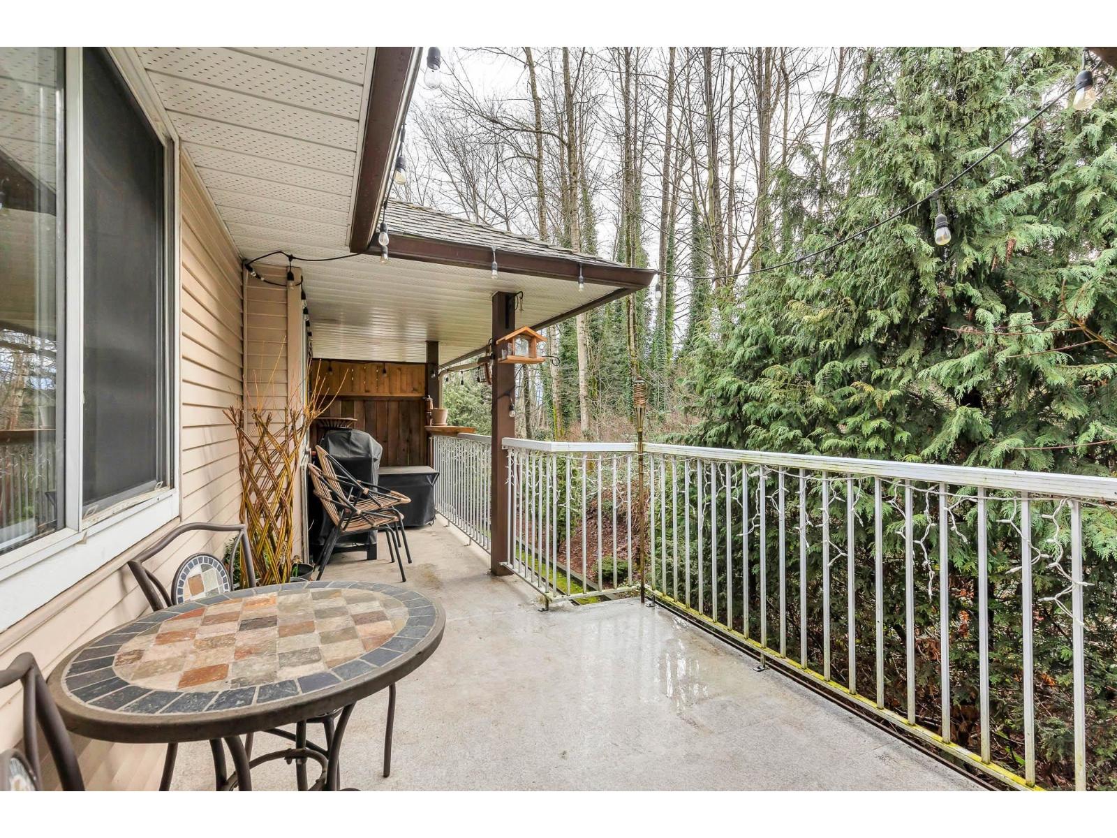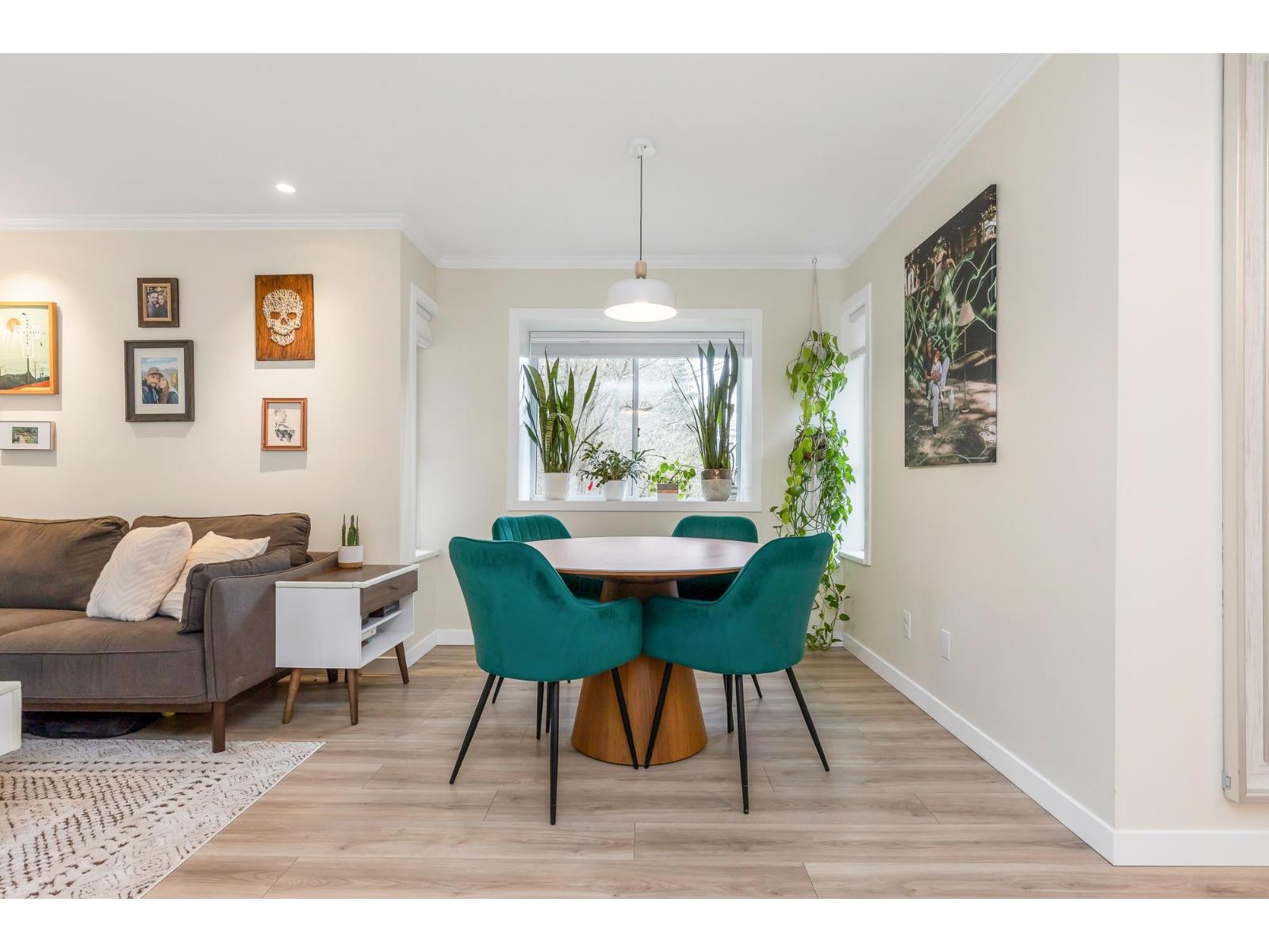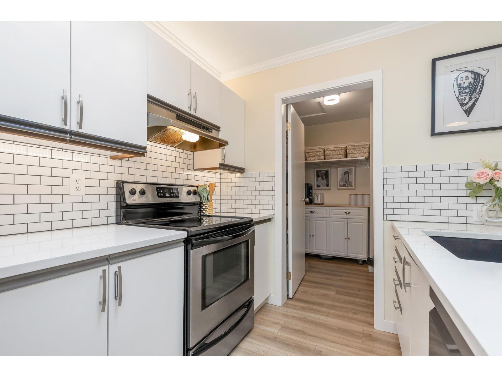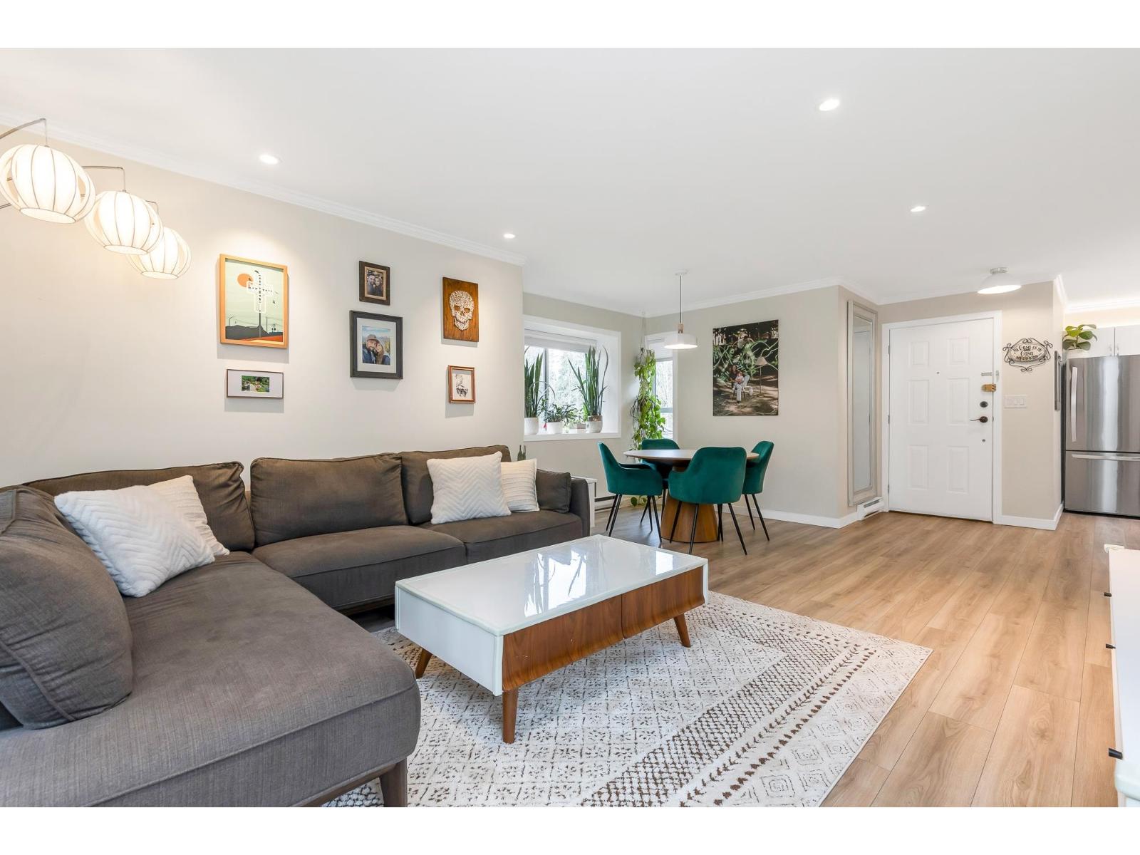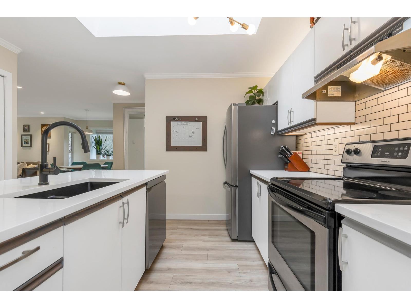 Top corner townhome with a bright open layout. Lots of windows and 2 skylights for plenty of natural light. Stylish updates throughout including designer colours, newer flooring, quartz counter tops, stylish backsplash, crown mouldings and pot lights to mention a few. Spacious walk-through closet with cheater ensuite access. Private balcony overlooking treed area. Park is 1 block away and easy access to Hwy 1 and the pedestrian overpass to UFV. Pet friendly with no age restrictions. Nothing to do here but move in and enjoy! 2 parking spots available. 1 cat or 1 dog max 25lbs (id:64528)