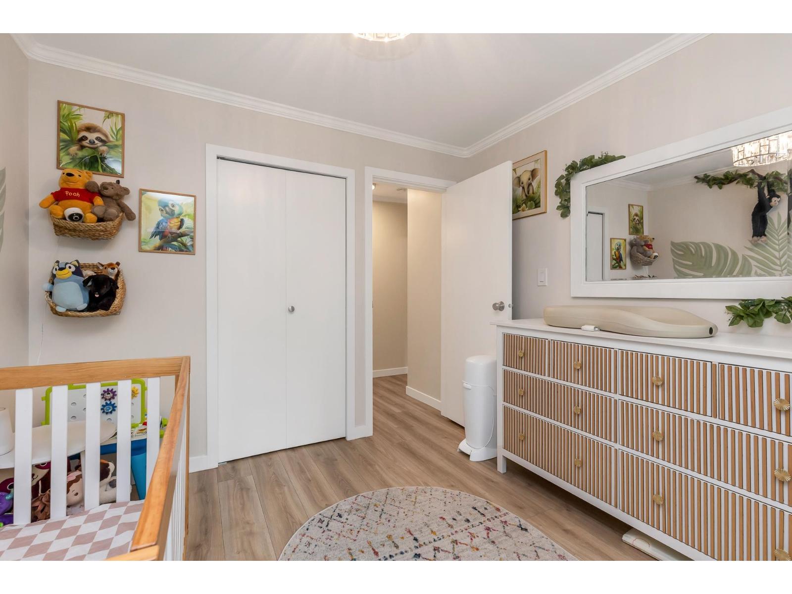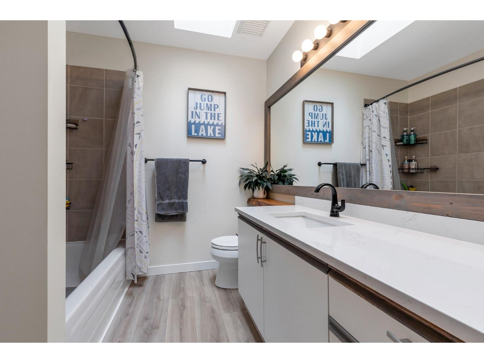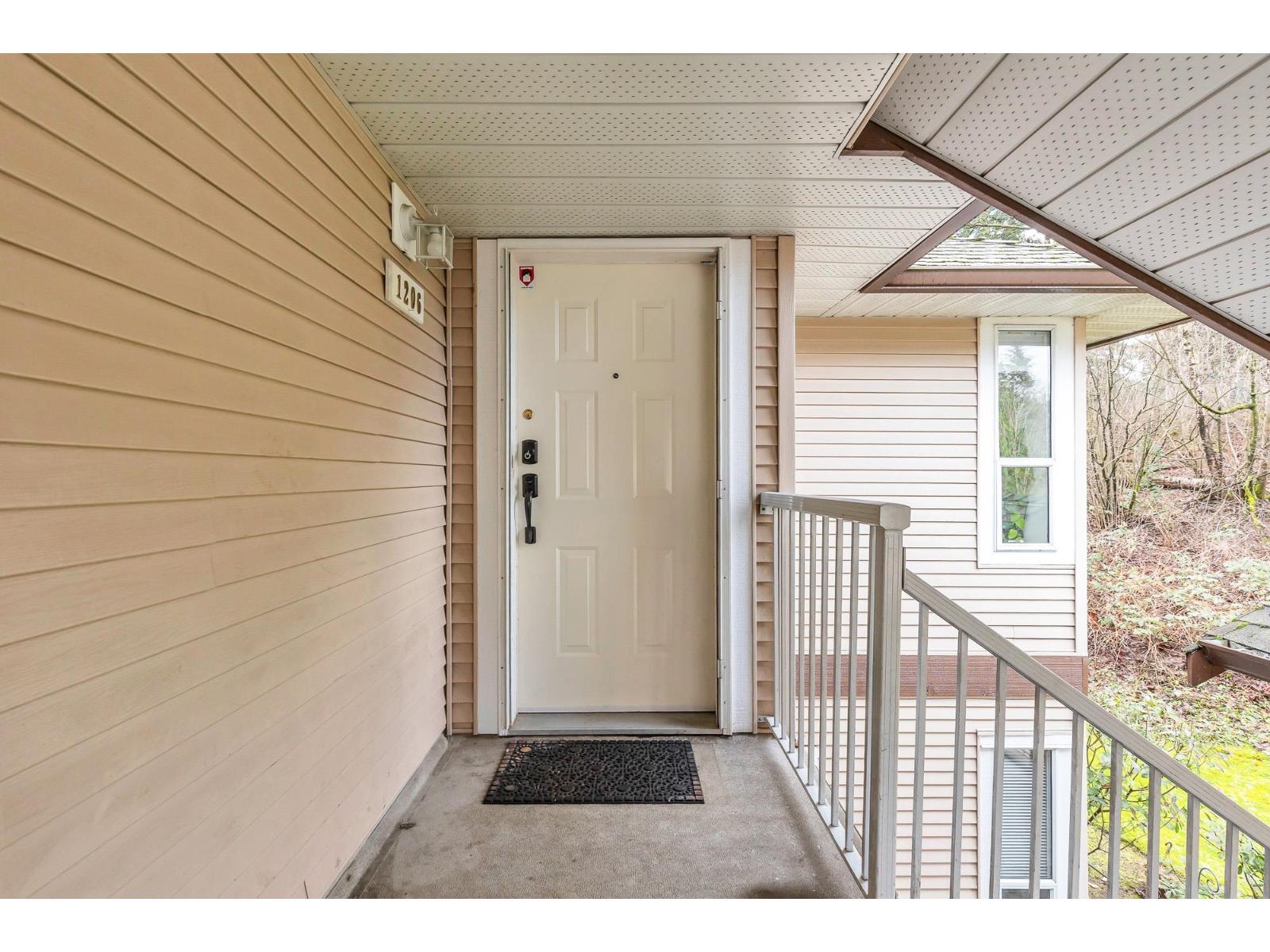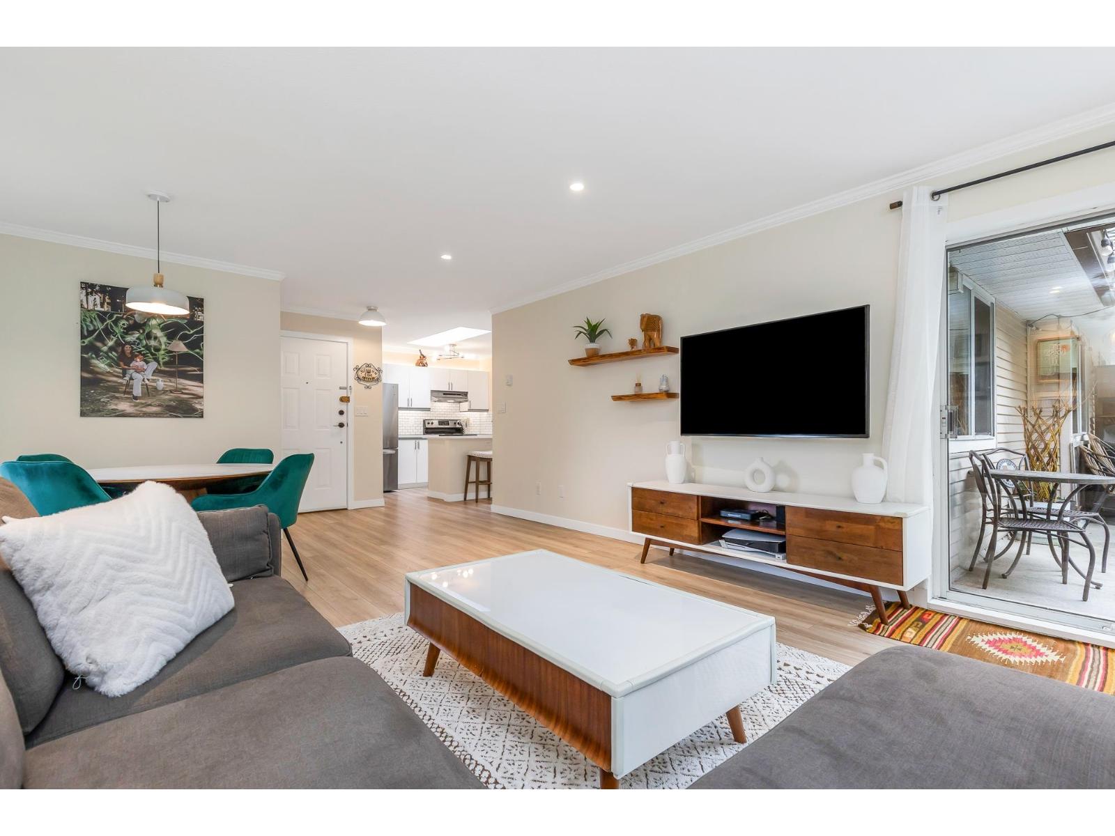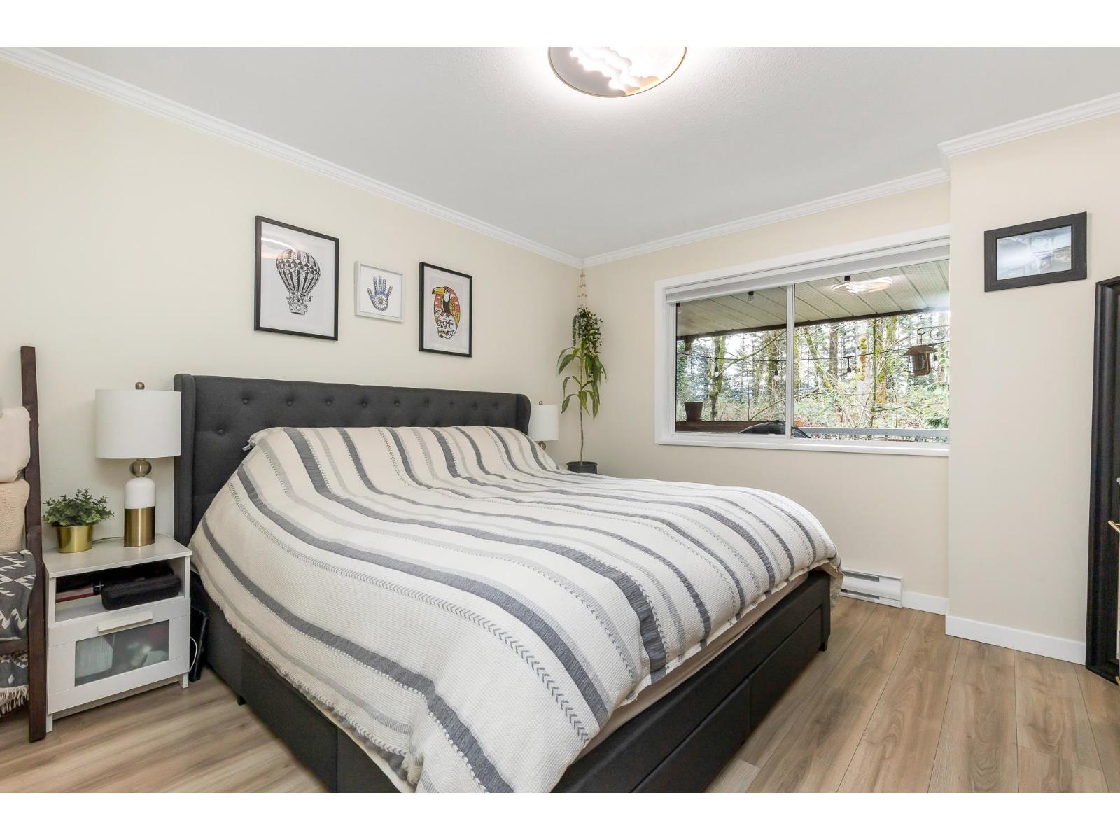 Top corner townhome with a bright open layout. Lots of windows and 2 skylights for plenty of natural light. Stylish updates throughout including designer colours, newer flooring, quartz counter tops, stylish backsplash, crown mouldings and pot lights to mention a few. Spacious walk-through closet with cheater ensuite access. Private balcony overlooking treed area. Park is 1 block away and easy access to Hwy 1 and the pedestrian overpass to UFV. Pet friendly with no age restrictions. Nothing to do here but move in and enjoy! 2 parking spots available. 1 cat or 1 dog max 25lbs (id:64528)