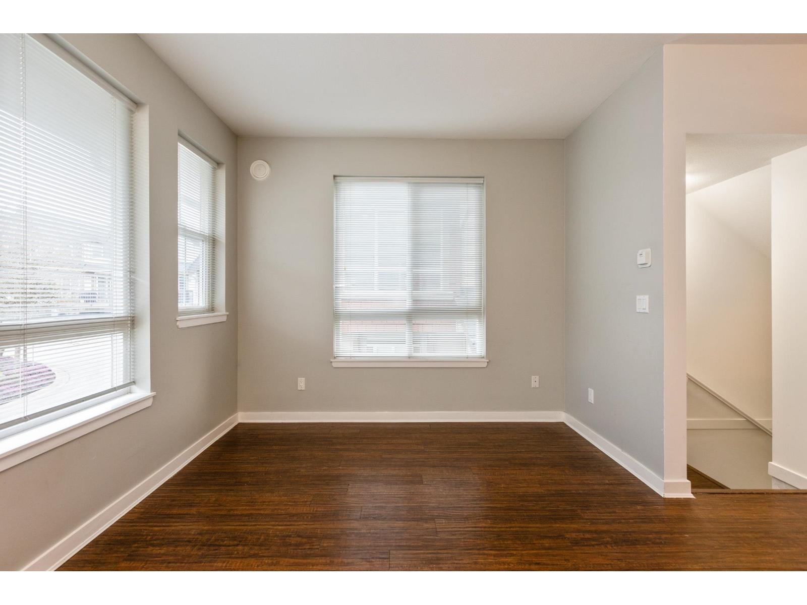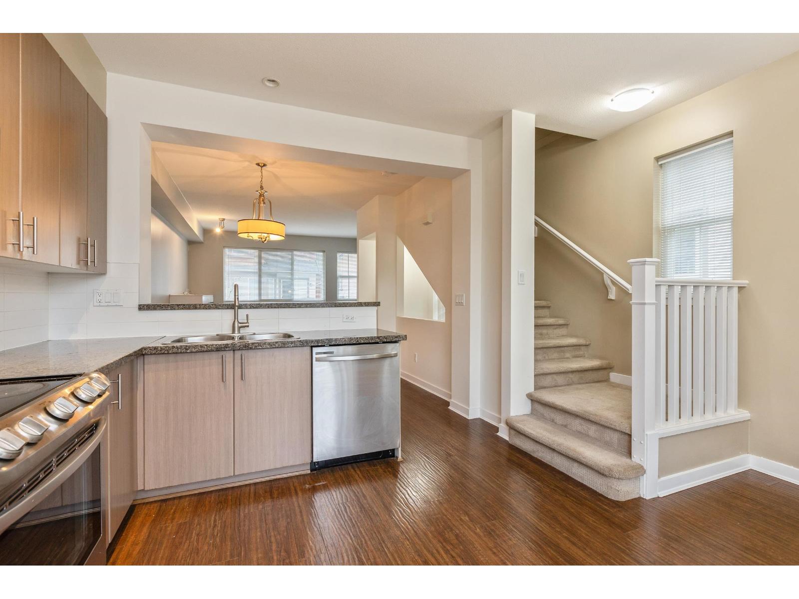 Welcome to Bacara in Clayton! This freshly painted, bright, and spacious 1,212 sqft END-UNIT townhouse offers 3 generous bedrooms and 1 bathroom. The wide-open main floor features a stylish kitchen with granite countertops, custom light fixtures, and modern laminate hardwood flooring, creating a modern and inviting space. Enjoy the convenience of a single garage plus driveway parking for another vehicle. Low maintenance fees of only $265 per month!. Fantastic walkable Clayton location close to new Clayton Rec Center, schools, transit, parks, future skytrain, and Langley shopping. Shows beautifully! (id:64528)