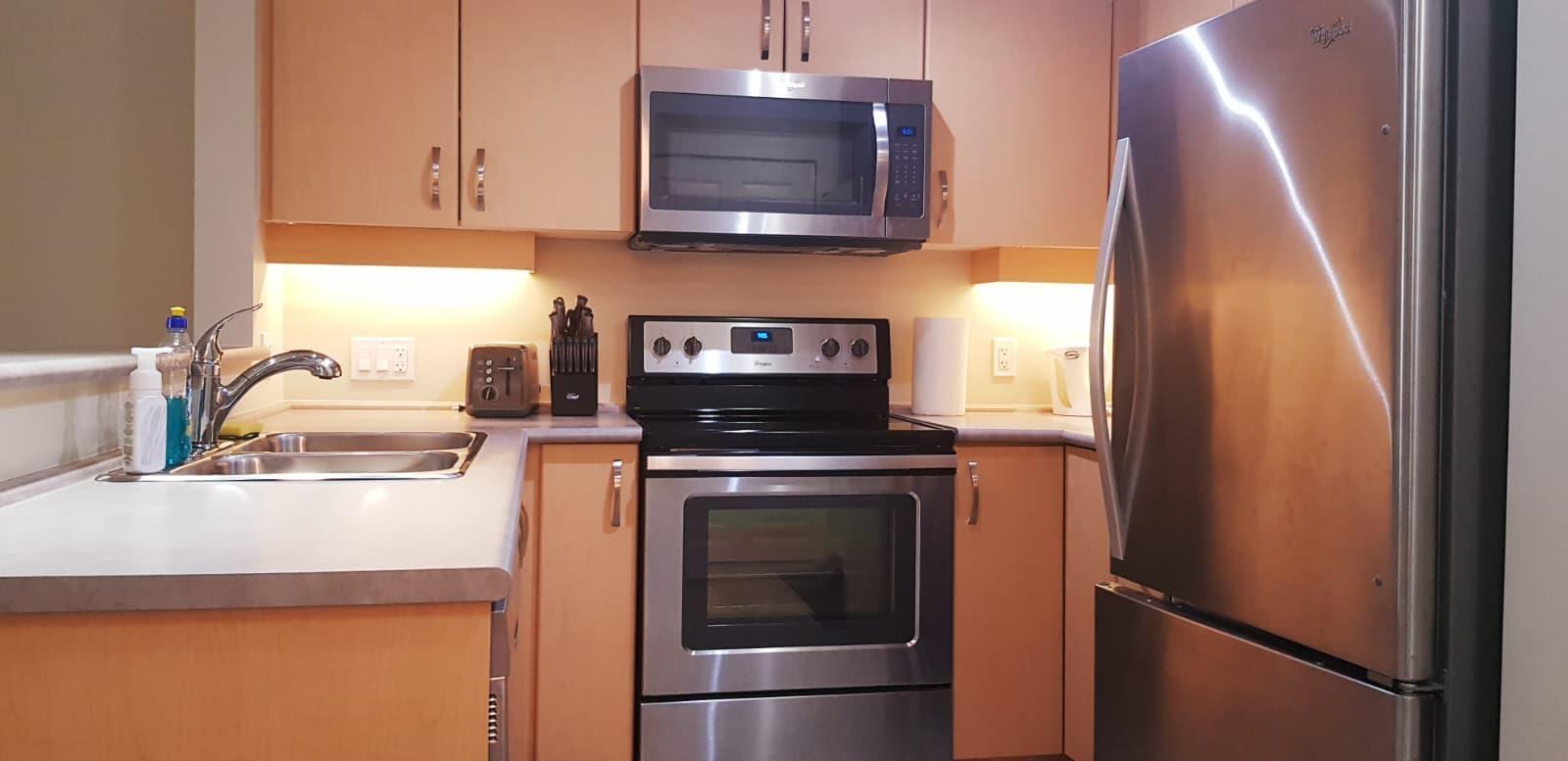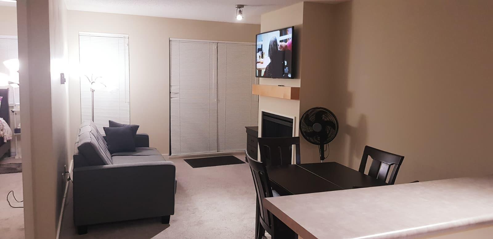 Fully Furnished 1 Bedroom + Den Condo in Central Surrey - Move-In Ready Step into comfort and convenience with this beautifully furnished 1 bedroom + den condo located in the heart of Surrey. Thoughtfully designed and ready for immediate enjoyment, this home is ideal for professionals, students, or anyone seeking a stylish, low-maintenance living space. - Spacious Layout: Bright and comfortable one-bedroom floor plan with a well-designed den-perfect for a home office, study space, or creative nook. - Fully Furnished: Move in with ease. The unit comes fully furnished, offering a seamless transition into your new home. - Cozy Fireplace: Enjoy a warm and inviting living area featuring a charming fireplace for added comfort. - Fully Equipped Kitchen: Modern kitchen (id:64528)