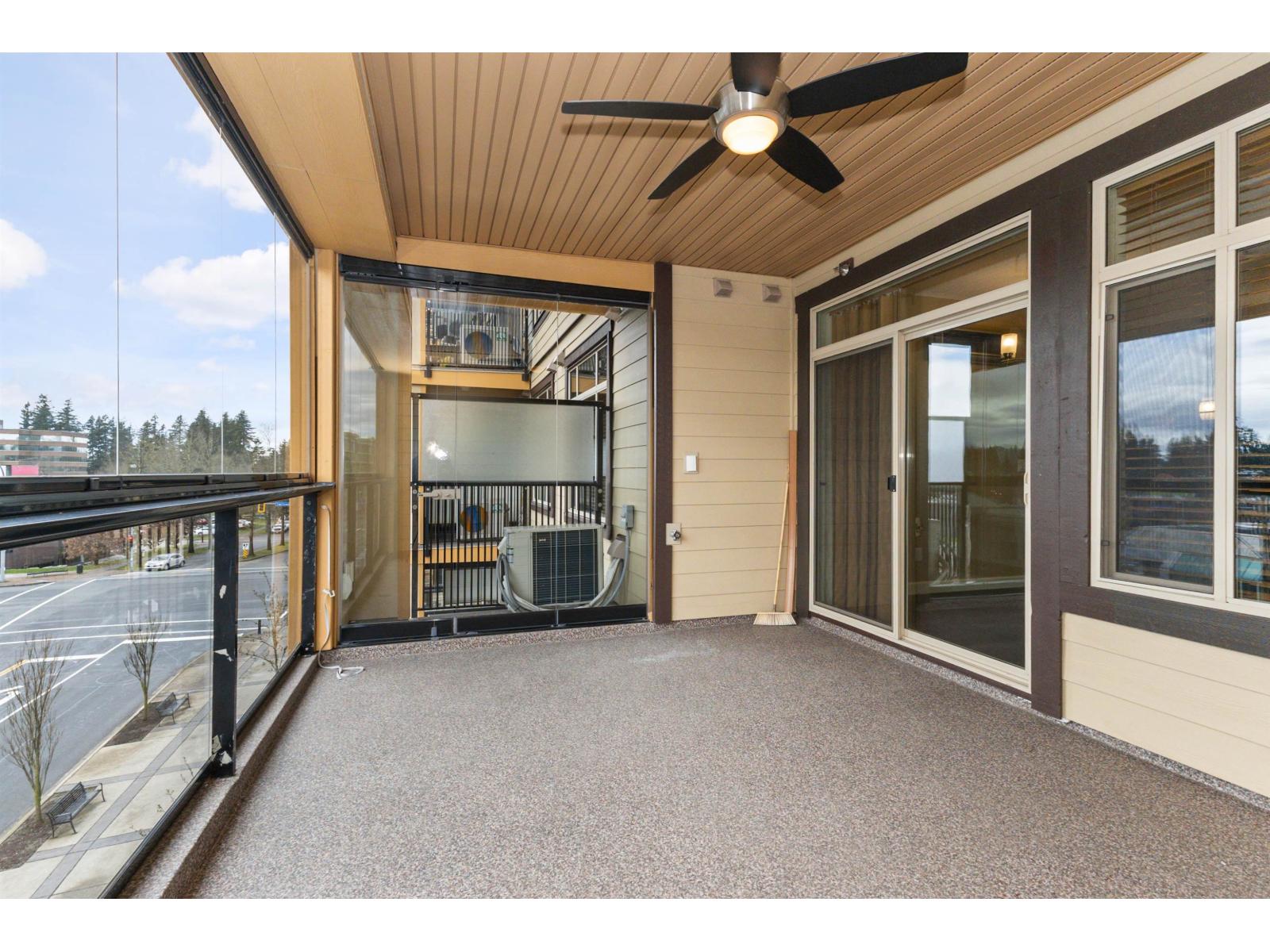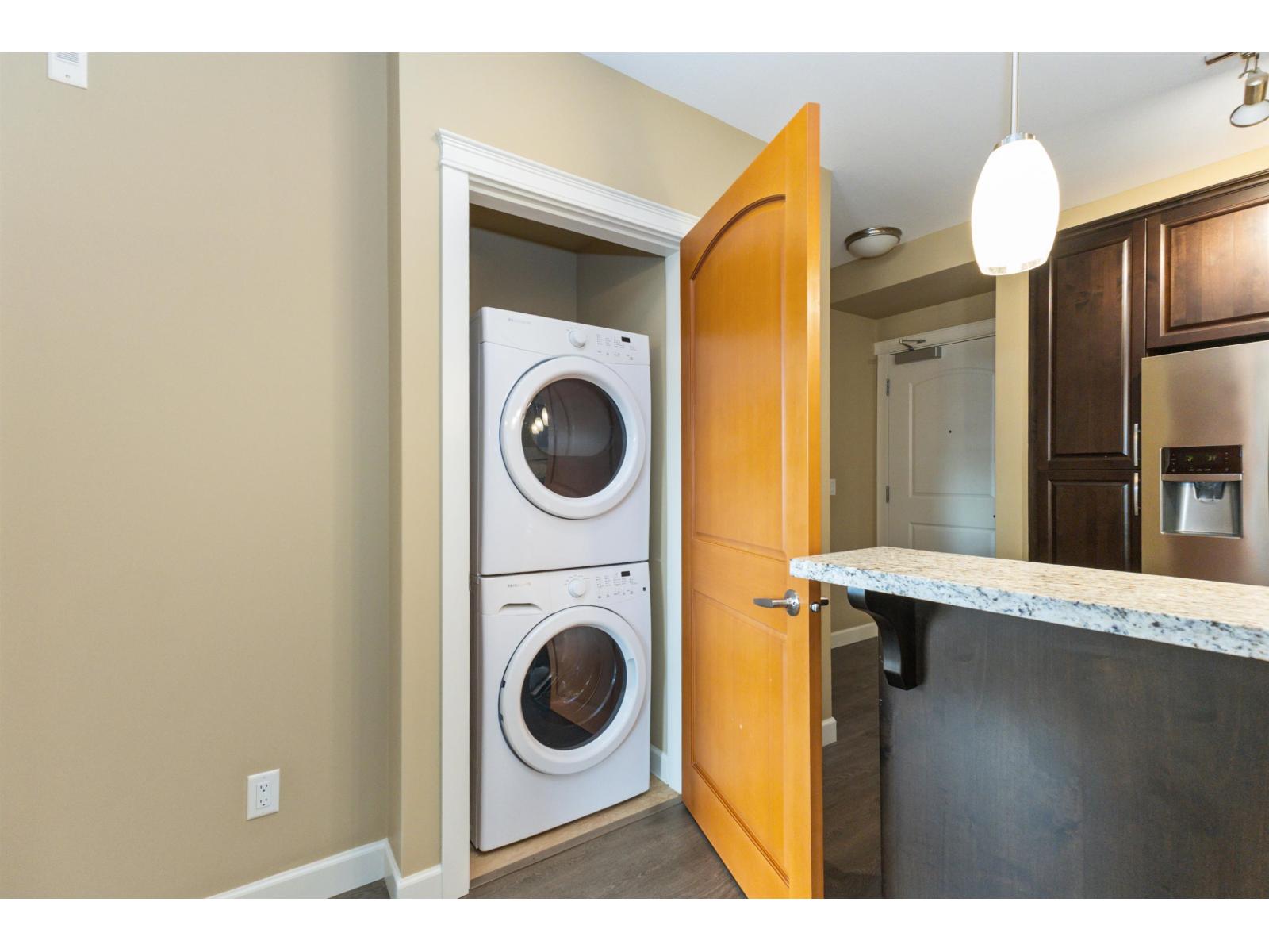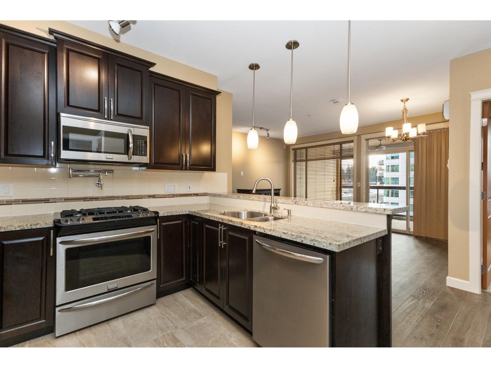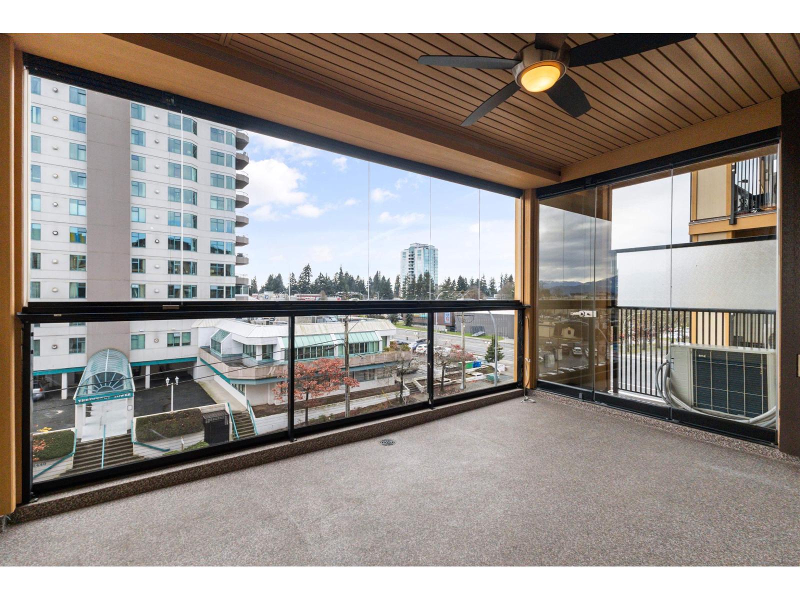Highly sought after "La Galleria" condo in Abbotsford, immediate possession! Awesome location within walking distance to grocery store, shopping, restaurants, public library & more. 4th floor south facing, 1 bed & den, stainless steel appliances, granite countertops, REAL wood paneled cabinetry, central A/C, elec F/P. Also includes a large 219 sq ft retractable glass solarium with natural gas outlet for bbq; perfect for year round entertaining. 2 underground parking stalls, large storage locker, on site gym. 2 pets allowed 20" at shoulder. Don't miss out! (id:64528)