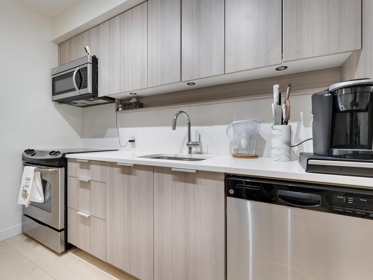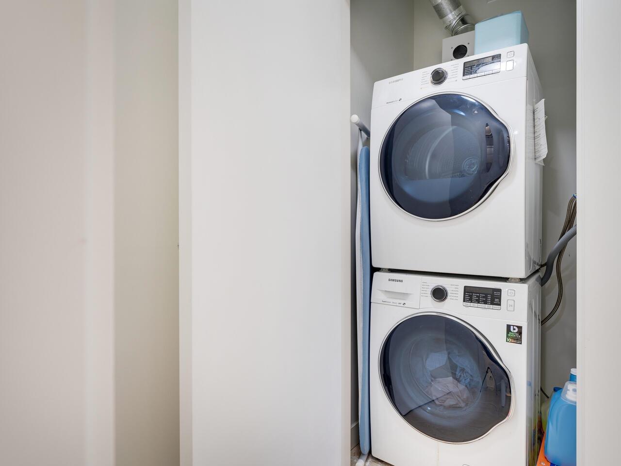 Welcome to Evolve, the heart of Surrey! This stunning 1-bedroom, 1-bathroom condo offers modern living with breathtaking city and mountain views. The unit boasts an open-concept design with floor-to-ceiling windows, filling the space with natural light and creating a bright, airy ambiance. The contemporary kitchen features sleek stainless-steel appliances, quartz countertops, and ample storage, perfect for cooking and entertaining. Enjoy the convenience of in-suite laundry, a spacious balcony, and access to a range of building amenities, including a fitness center, rooftop terrace, and social lounge. Located in Surrey's vibrant downtown core. Perfect for investor and starter! (id:64528)