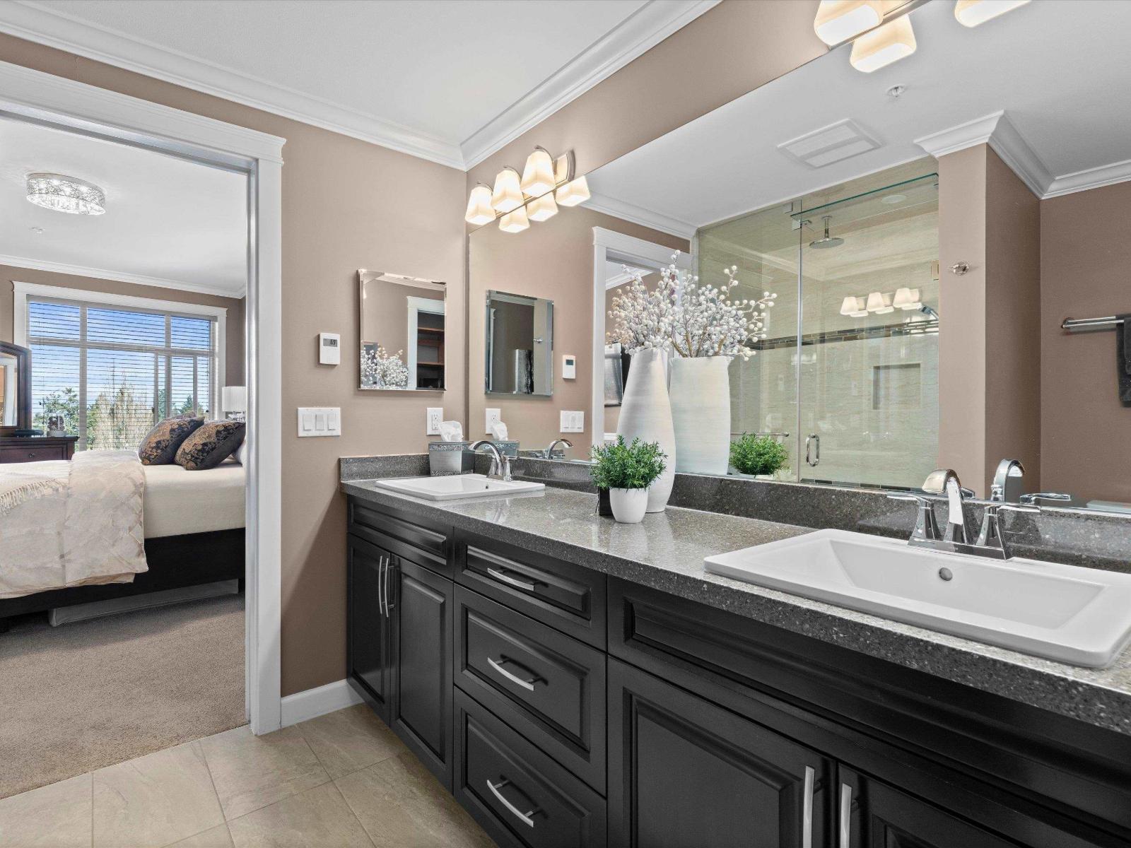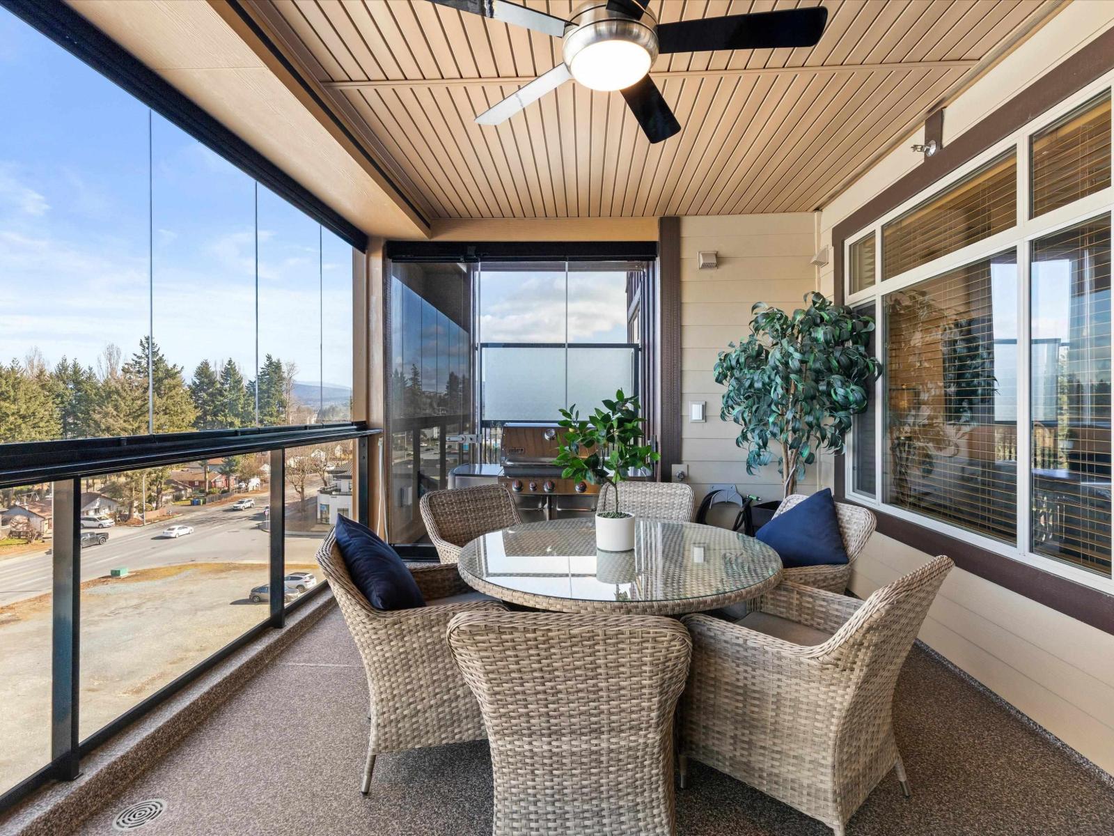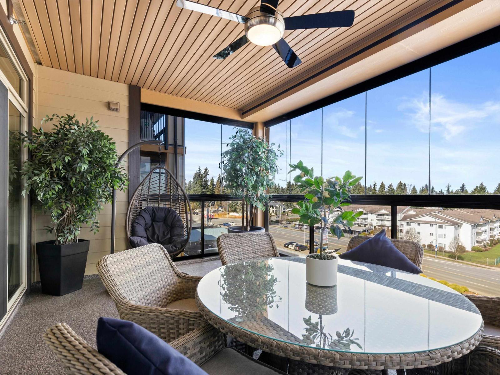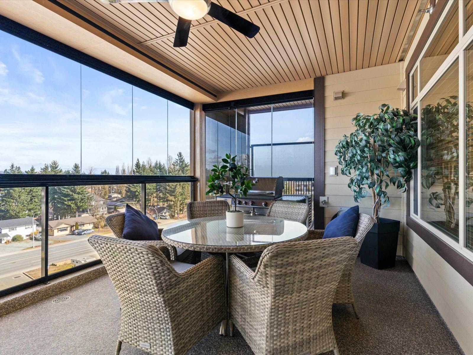 Step into refined living at La Galleria, Abbotsford's premier luxury mid-rise condo community. This stunning upper-level corner residence offers exceptional north-facing mountain views and a bright open layout with 9' ceilings and elegant finishes throughout. The spacious 2 bed, 2 bath design features a luxurious primary suite with walk-in closet and spa-inspired ensuite with radiant in-floor heating. Enjoy year-round outdoor living in the fully enclosed Lumon solarium, seamlessly extending your living space. Designed for comfort with individually controlled heat pump heating and A/C, plus upgraded lighting. Includes 2 parking stalls and a storage locker. Residents enjoy a fitness centre, amenities room, all in a central location just minutes to shopping, dining, and services. (id:64528)