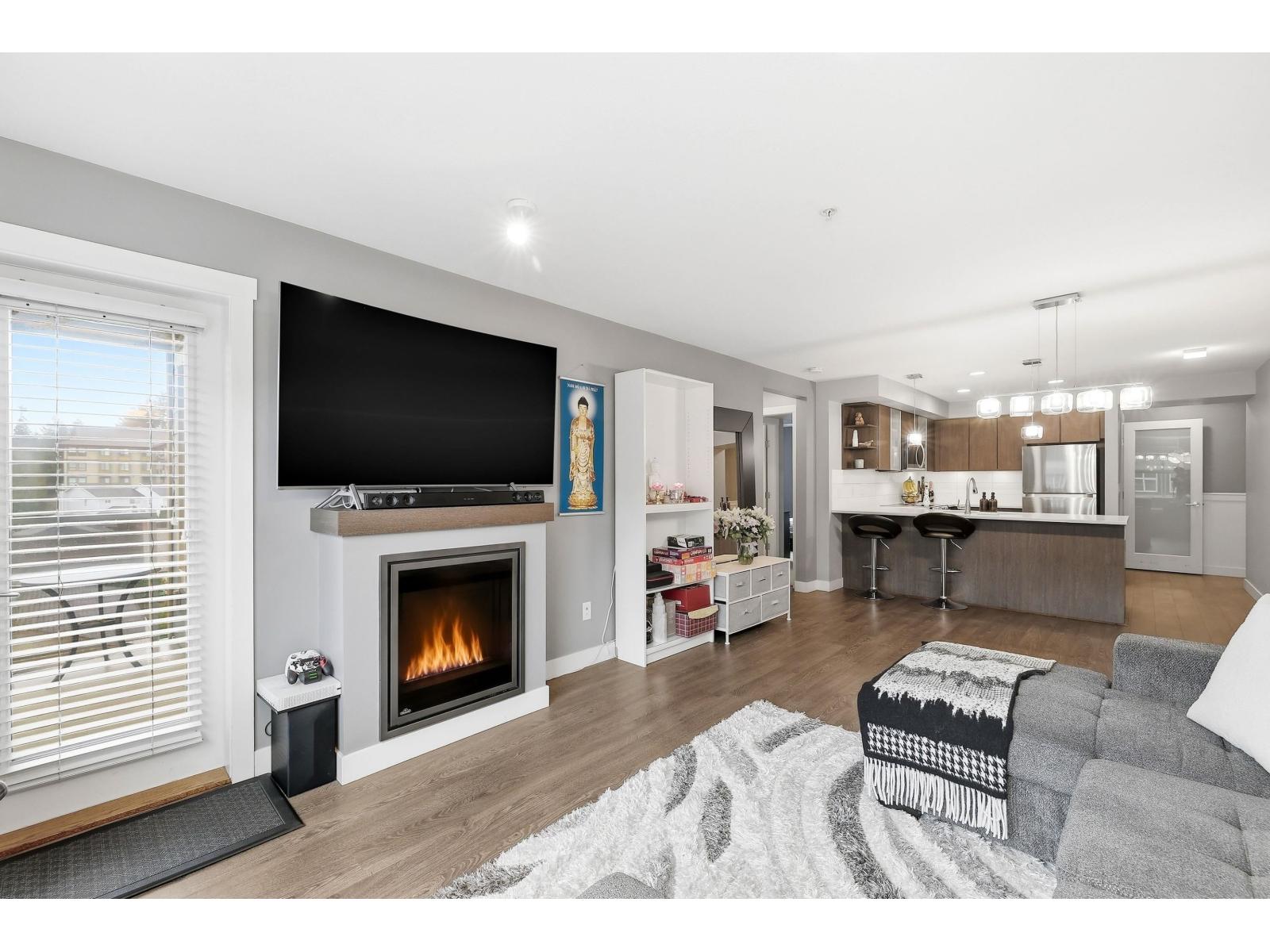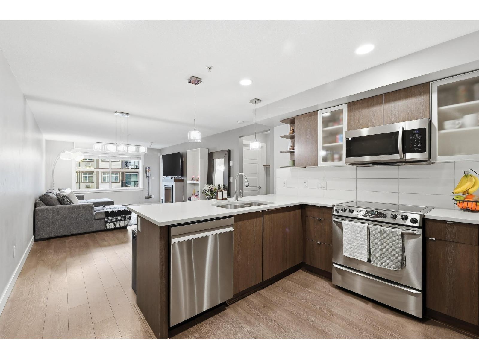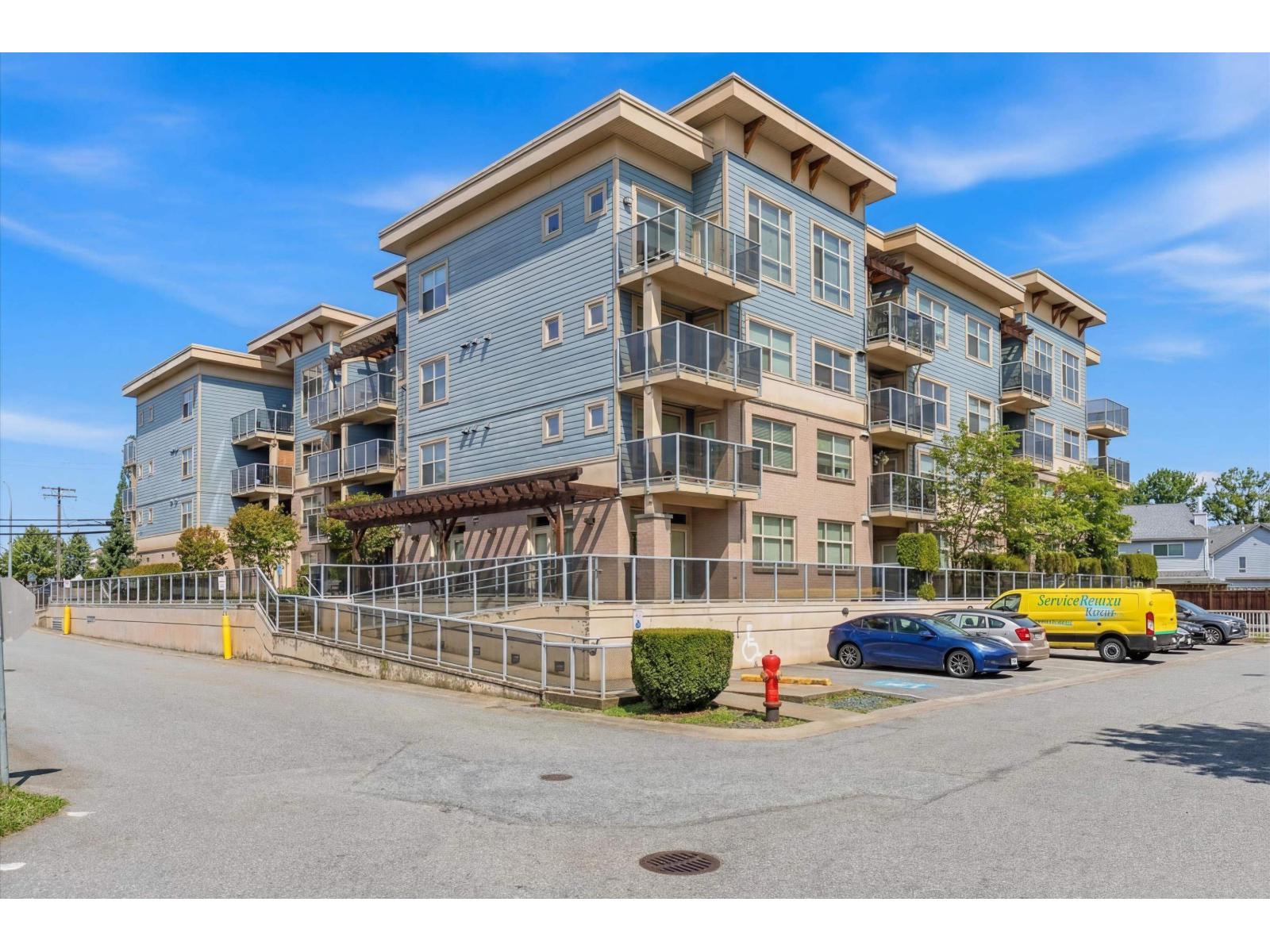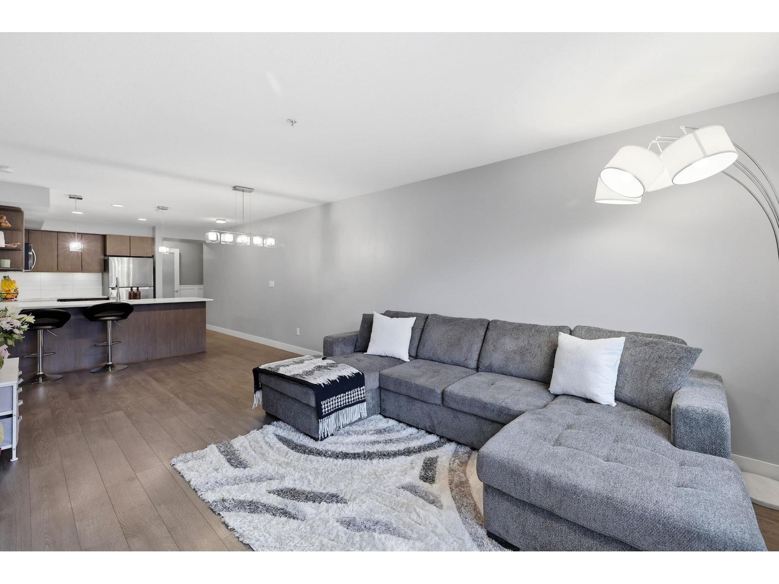 Welcome to Bearing Pointe! Bright south facing 2 bed & 2 bath, 959 sqft CORNER UNIT. Perfect for first time buyers or investors. Attention to detail is evident with window trim, wainscoting, custom built-ins in the pantry & linen closet, and light fixtures! Chef's kitchen with Caesarstone counters, warm cabinets, new stainless steel appliances, a large pantry, bar seating & a dining area. Spacious primary bedroom boasts a walk-in closet & fabulous en-suite with soaker tub, moen fixtures, & stone counters. Comes with one of the largest parking spots plus a storage locker. Party room, two elevators, 2 pets any size, and lots of visitor parking. Steps away from the heart of Langley City with shopping, restaurants, transit, future skytrain, recreation, schools and parks! (id:64528)