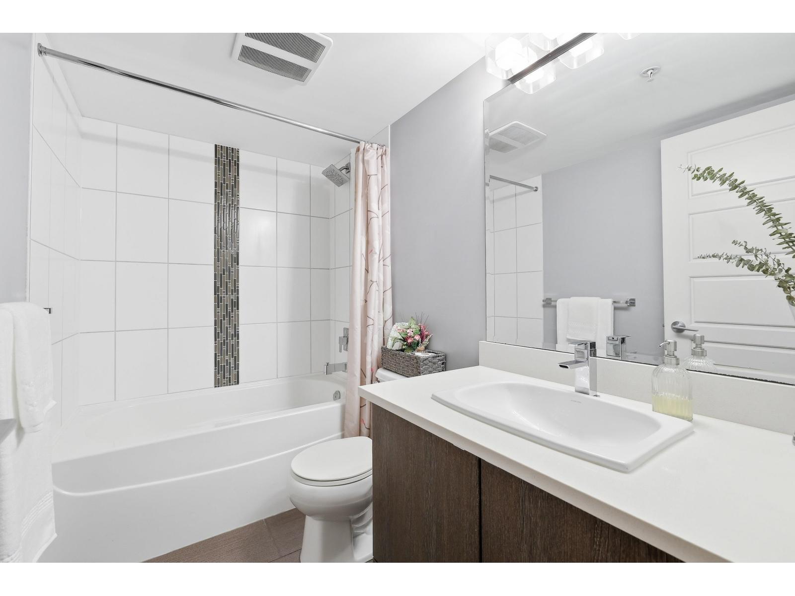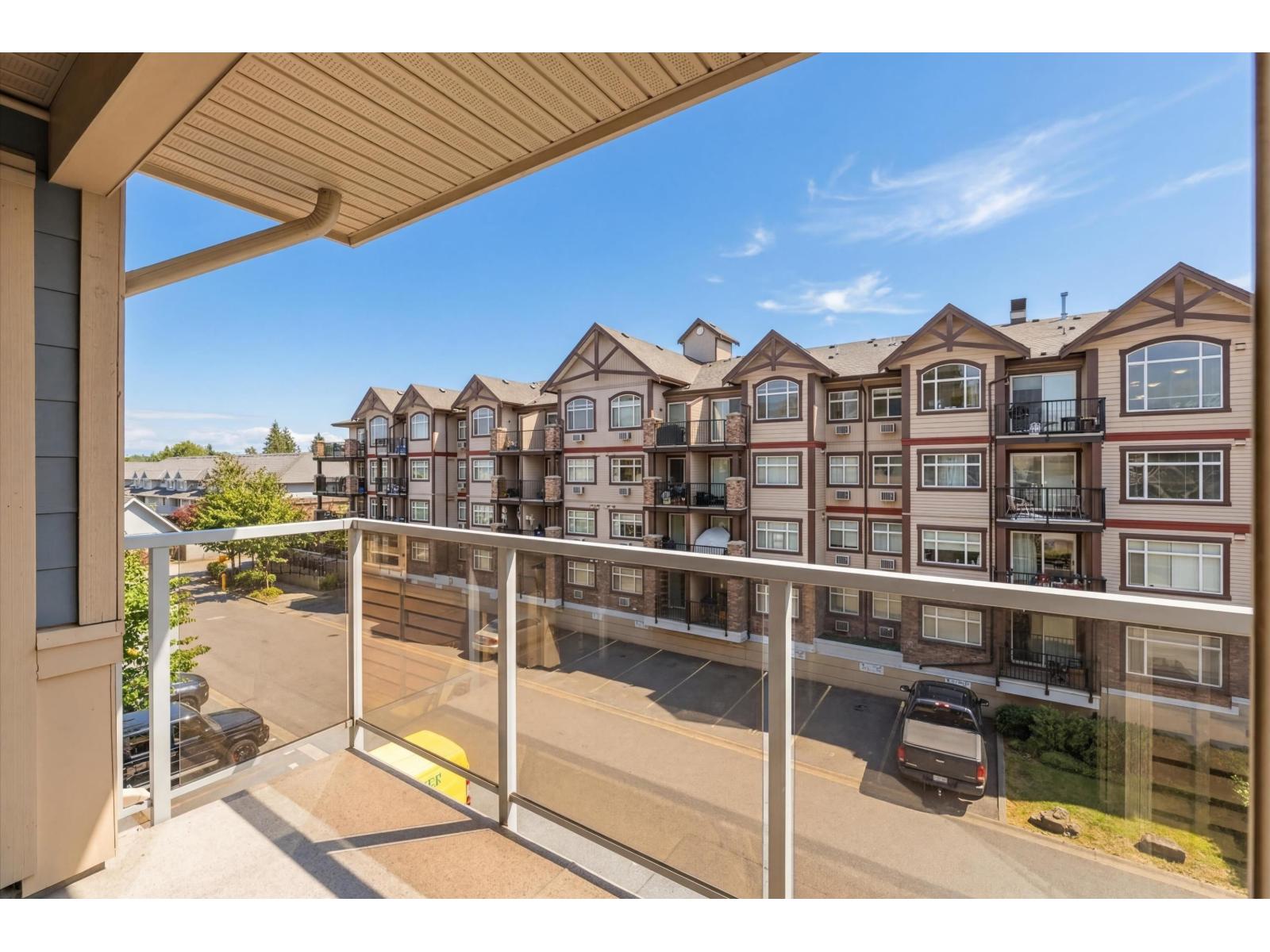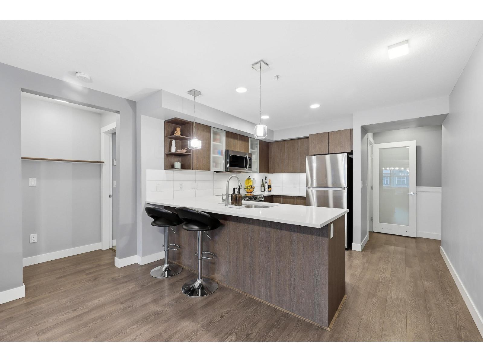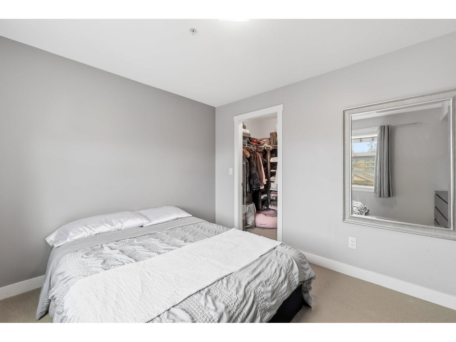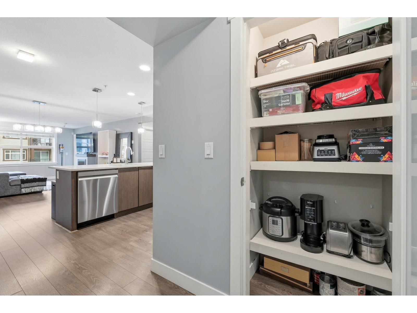 Welcome to Bearing Pointe! Bright south facing 2 bed & 2 bath, 959 sqft CORNER UNIT. Perfect for first time buyers or investors. Attention to detail is evident with window trim, wainscoting, custom built-ins in the pantry & linen closet, and light fixtures! Chef's kitchen with Caesarstone counters, warm cabinets, new stainless steel appliances, a large pantry, bar seating & a dining area. Spacious primary bedroom boasts a walk-in closet & fabulous en-suite with soaker tub, moen fixtures, & stone counters. Comes with one of the largest parking spots plus a storage locker. Party room, two elevators, 2 pets any size, and lots of visitor parking. Steps away from the heart of Langley City with shopping, restaurants, transit, future skytrain, recreation, schools and parks! (id:64528)