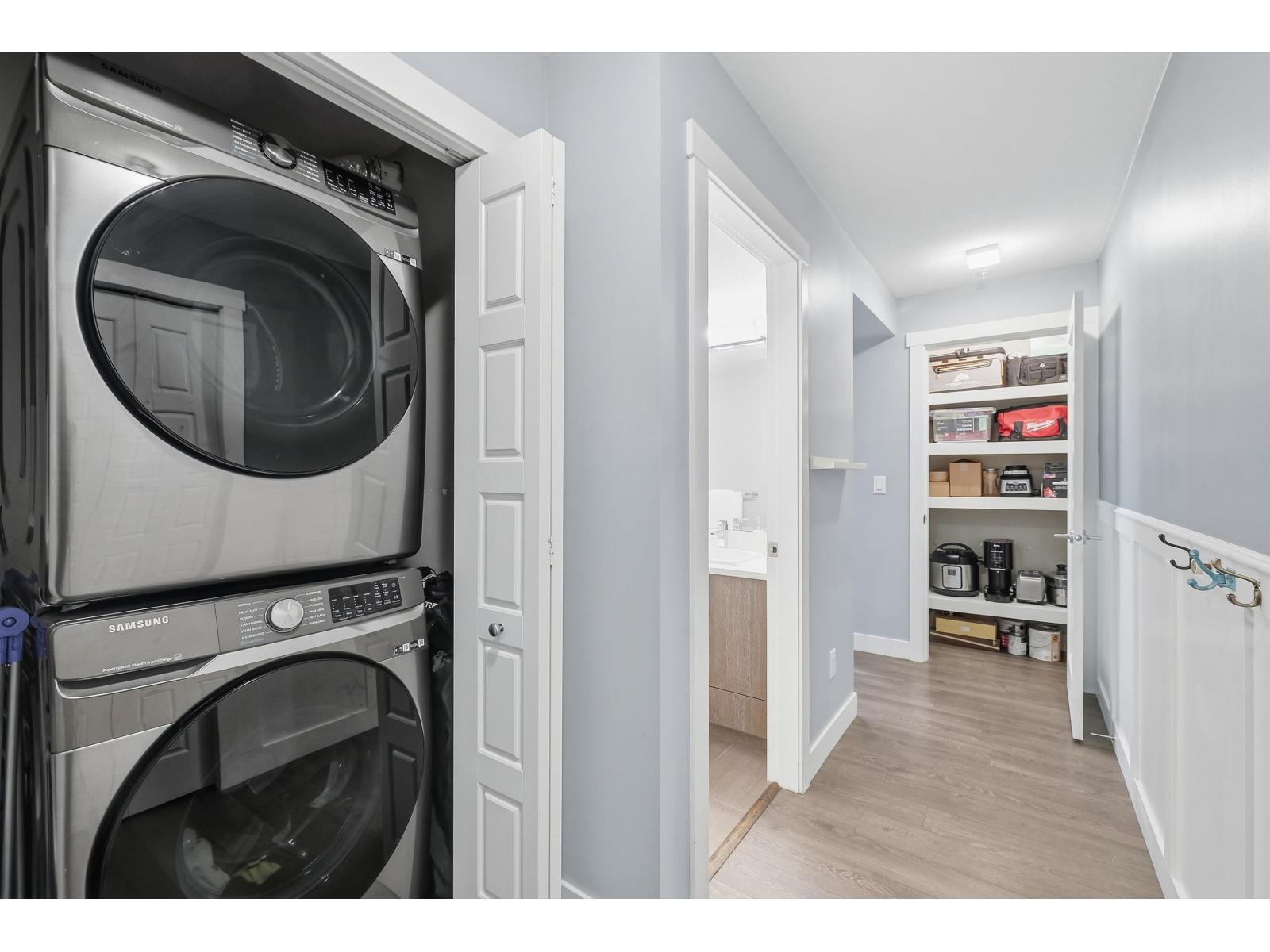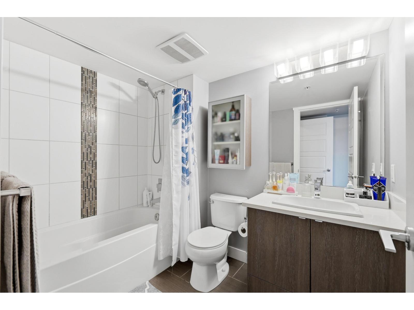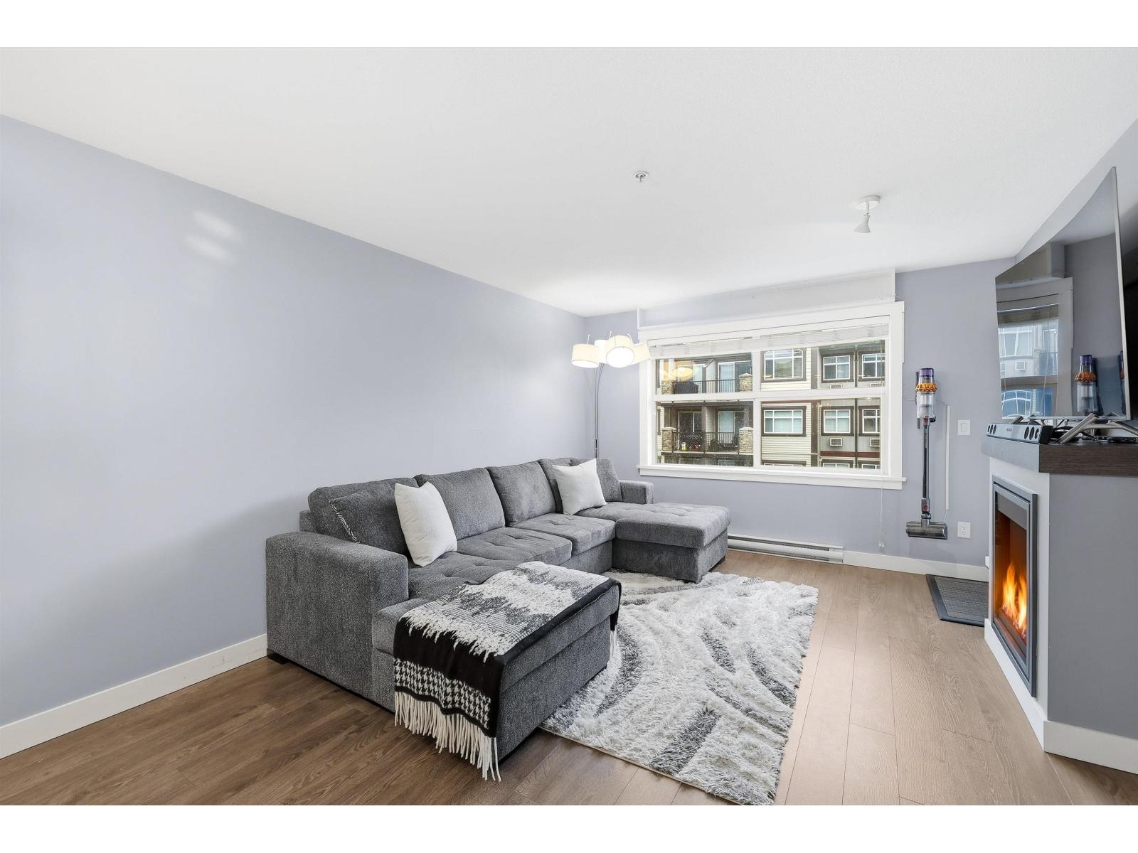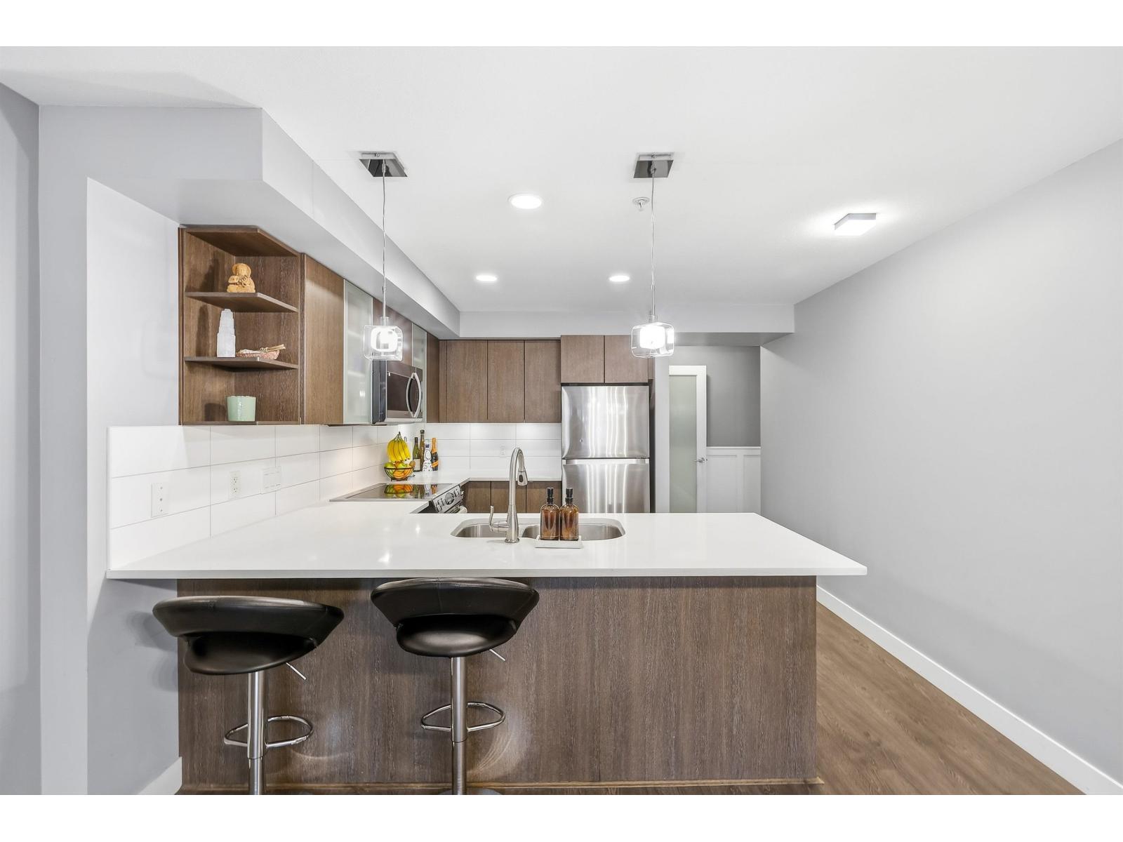 Welcome to Bearing Pointe! Bright south facing 2 bed & 2 bath, 959 sqft CORNER UNIT. Perfect for first time buyers or investors. Attention to detail is evident with window trim, wainscoting, custom built-ins in the pantry & linen closet, and light fixtures! Chef's kitchen with Caesarstone counters, warm cabinets, new stainless steel appliances, a large pantry, bar seating & a dining area. Spacious primary bedroom boasts a walk-in closet & fabulous en-suite with soaker tub, moen fixtures, & stone counters. Comes with one of the largest parking spots plus a storage locker. Party room, two elevators, 2 pets any size, and lots of visitor parking. Steps away from the heart of Langley City with shopping, restaurants, transit, future skytrain, recreation, schools and parks! (id:64528)