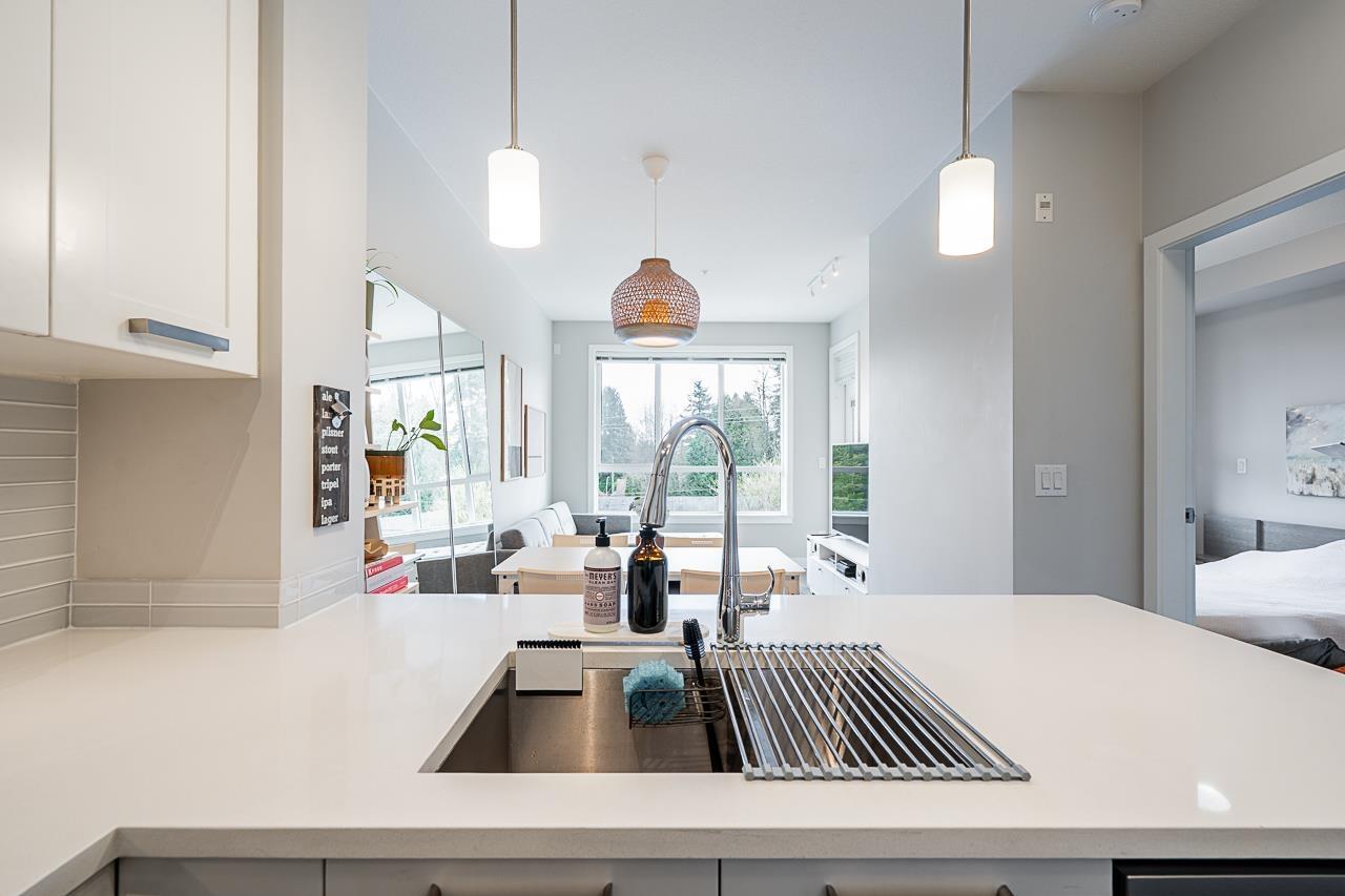 G3 RESIDENCES - This bright, upper-floor gem is truly one-of-a-kind! Meticulously well-kept by the original owner, it features a unique, custom-selected color scheme that radiates energy and warmth-setting it apart from every other unit in the building. The open-concept interior boasts 8'10 ceilings, quartz countertops, stainless steel appliances, and the convenience of in-suite laundry. Enjoy incredible value with low strata fees, secure parking, and a large storage locker! The building offers elite amenities, including a 2,500+ sq. ft. clubhouse with a fitness center, lounge, and a guest suite. Located in the heart of Guildford, you are steps from shopping and dining with Hwy 1 just minutes away. A rare, vibrant sanctuary! Open House Apr 25 & 26, 2pm - 4pm! (id:64528)
