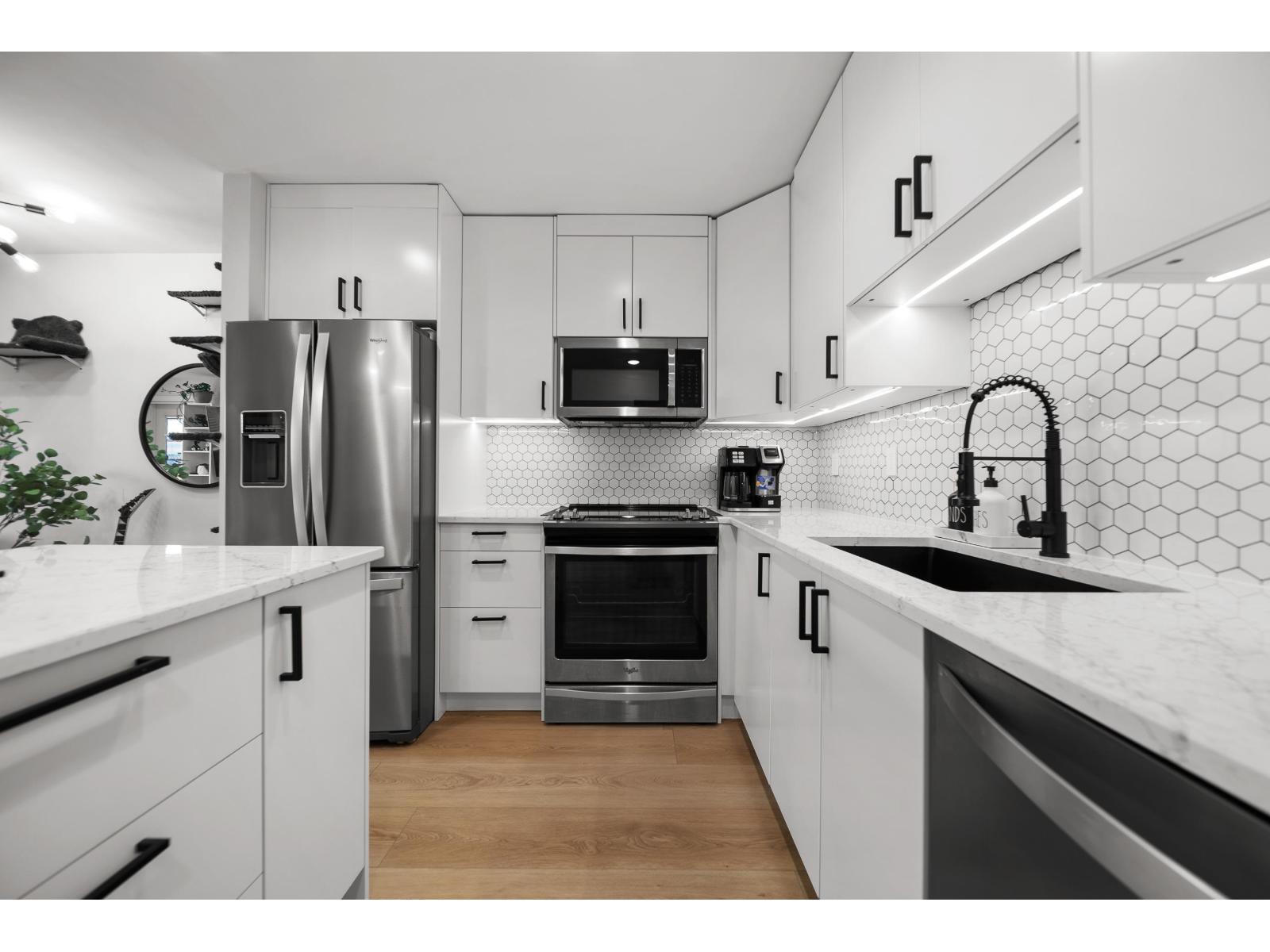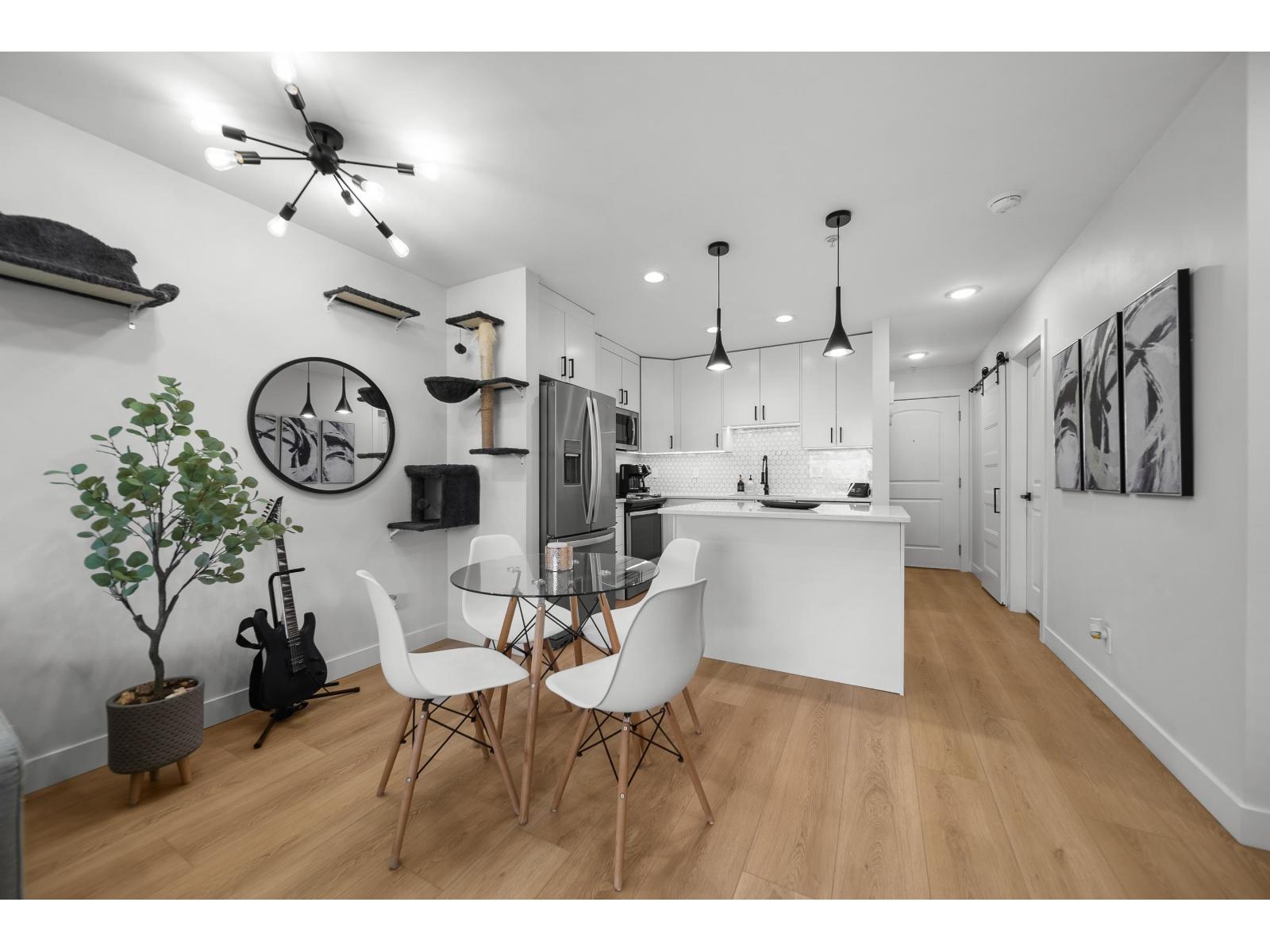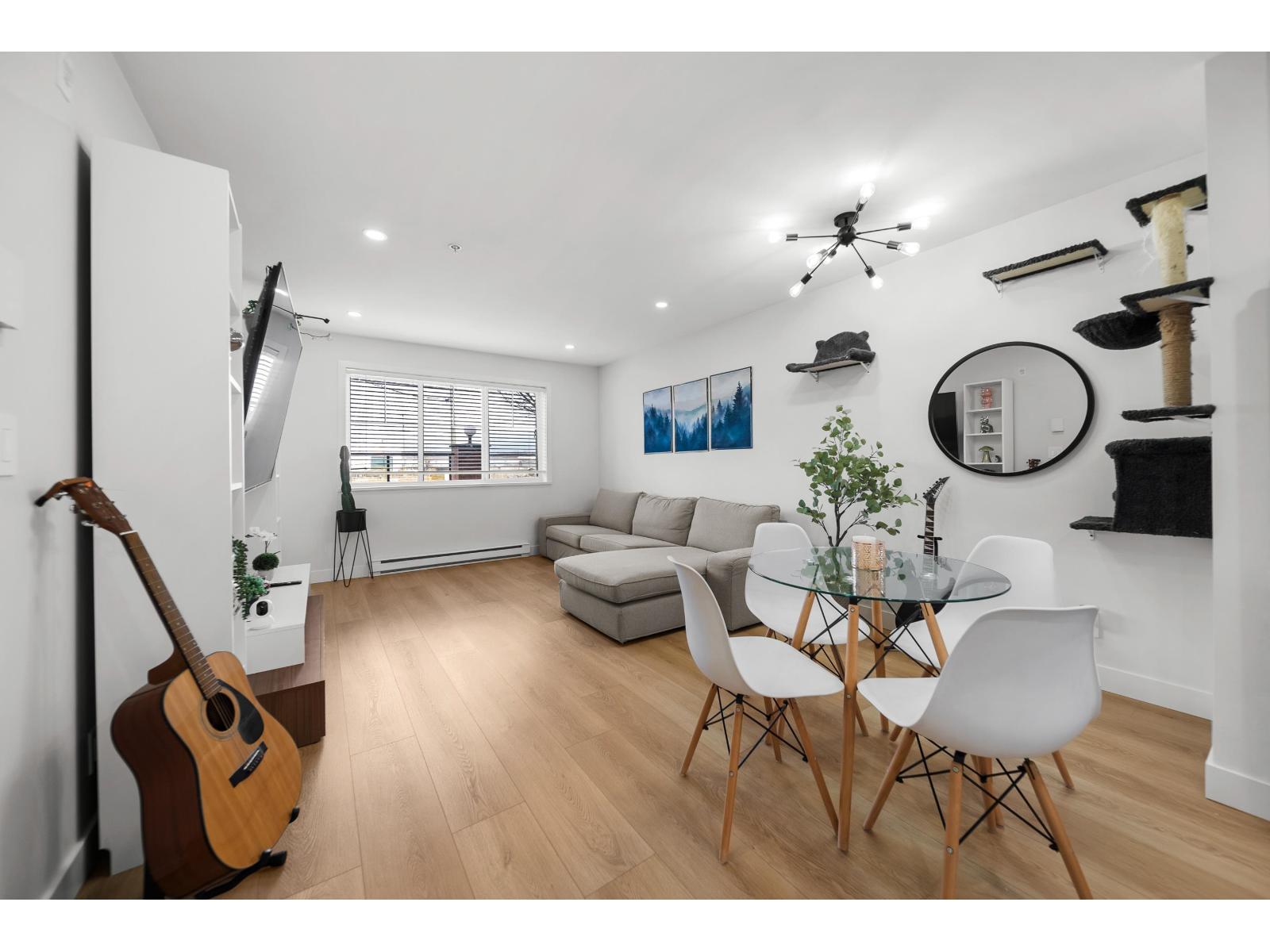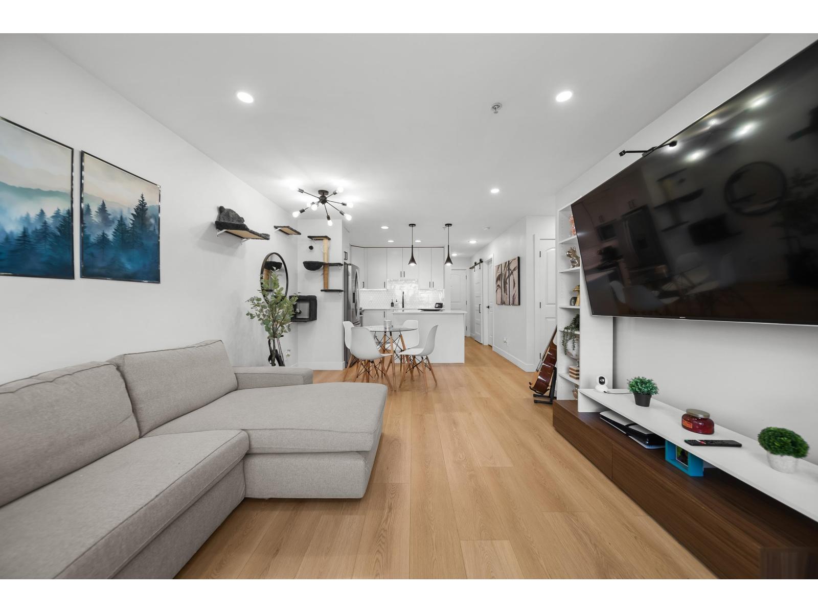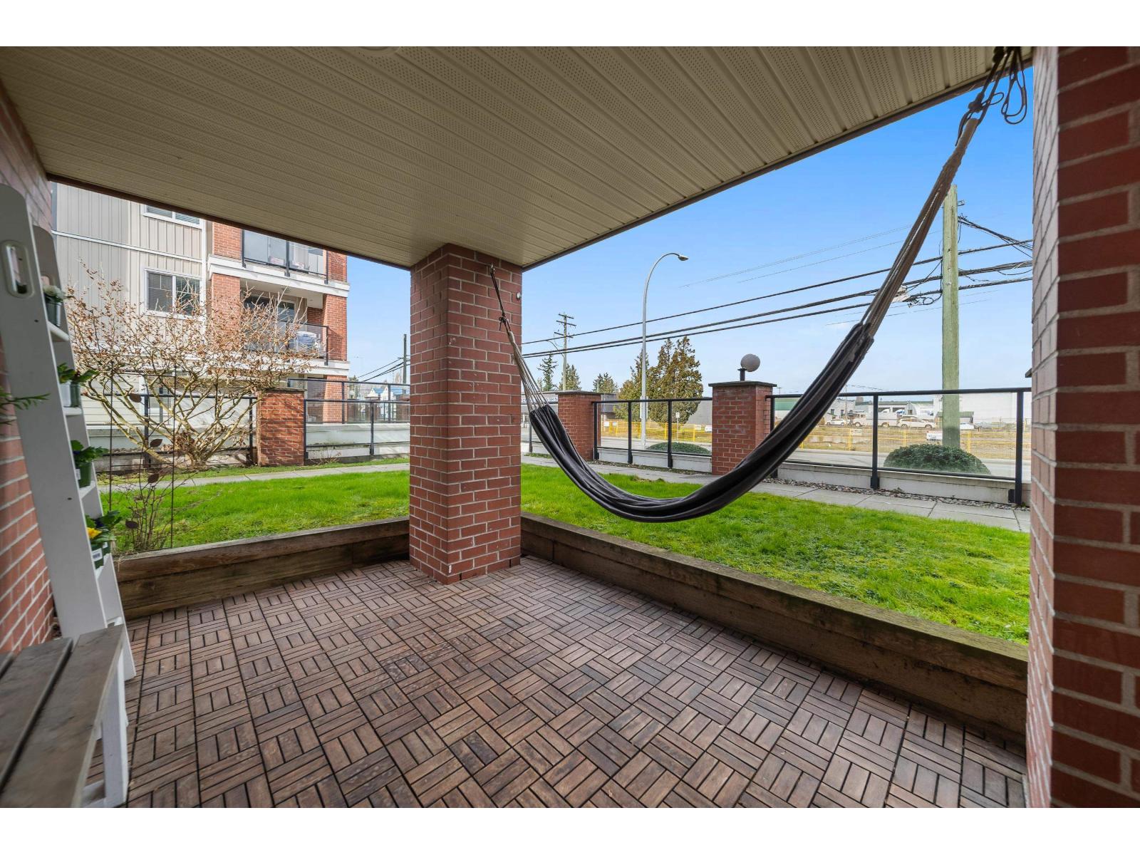 Langley City beauty at Madison Station! A lot to appreciate at this CORNER two bed and two bathroom condo. Situated on the ground floor with access to covered 12x8 patio and direct access to spacious grass area making for a great space for kid/dog and visitor access! This 'like new' home features an abundance of updates including: kitchen with quartz counters, luxury SPC vinyl flooring, updated main bath, remodeled ensuite with in-floor heating, A/C in primary, lighting system controlled by Alexa, paint, baseboards and even the outlets and switches. Quiet condo with just one neighbor! Enjoy TWO dedicated parking stalls, private storage and a well run building including fitness and club rooms. Strata fee of 408/month and welcoming all ages plus one pet (cat or dog of any size). (id:64528)