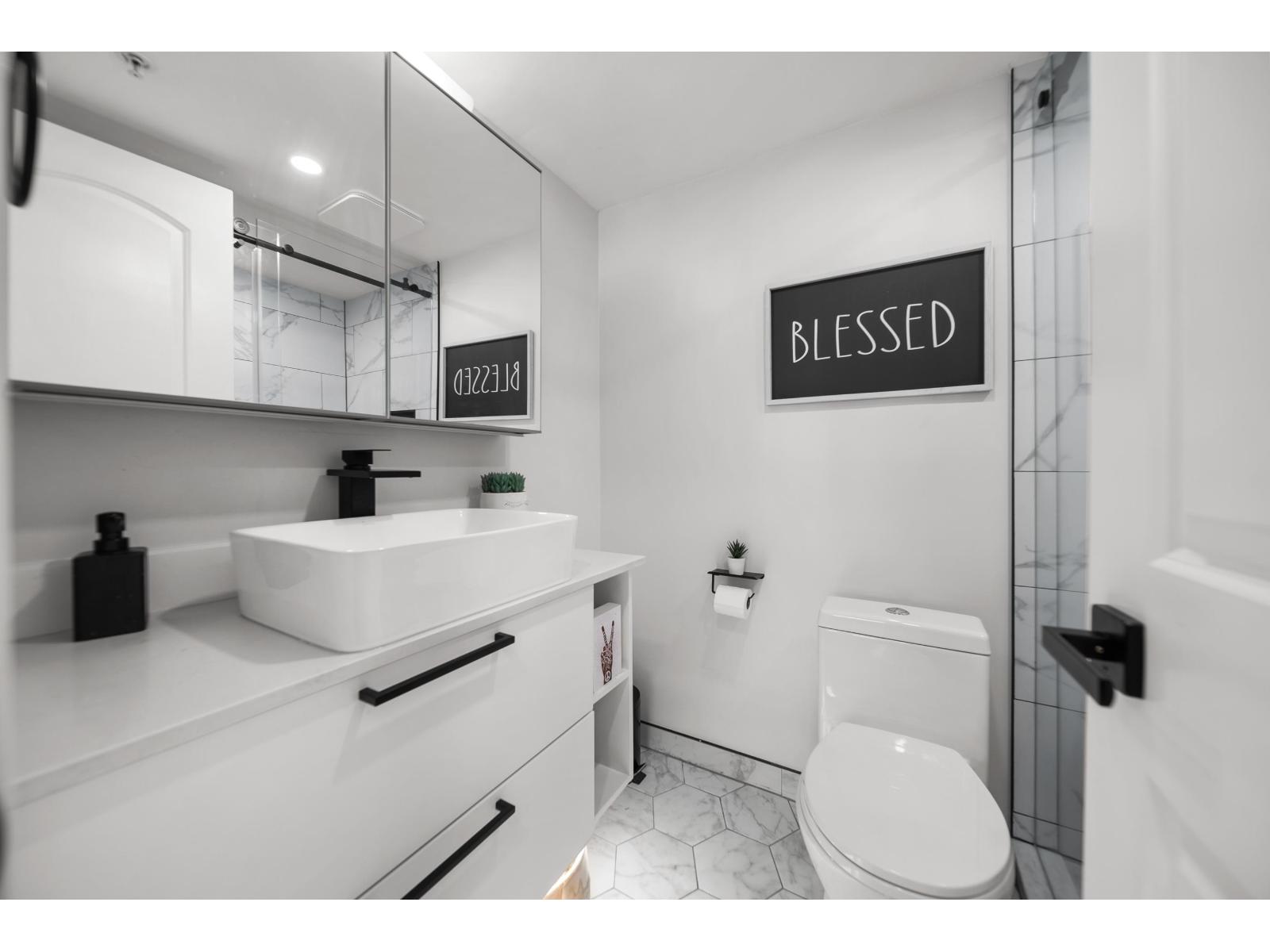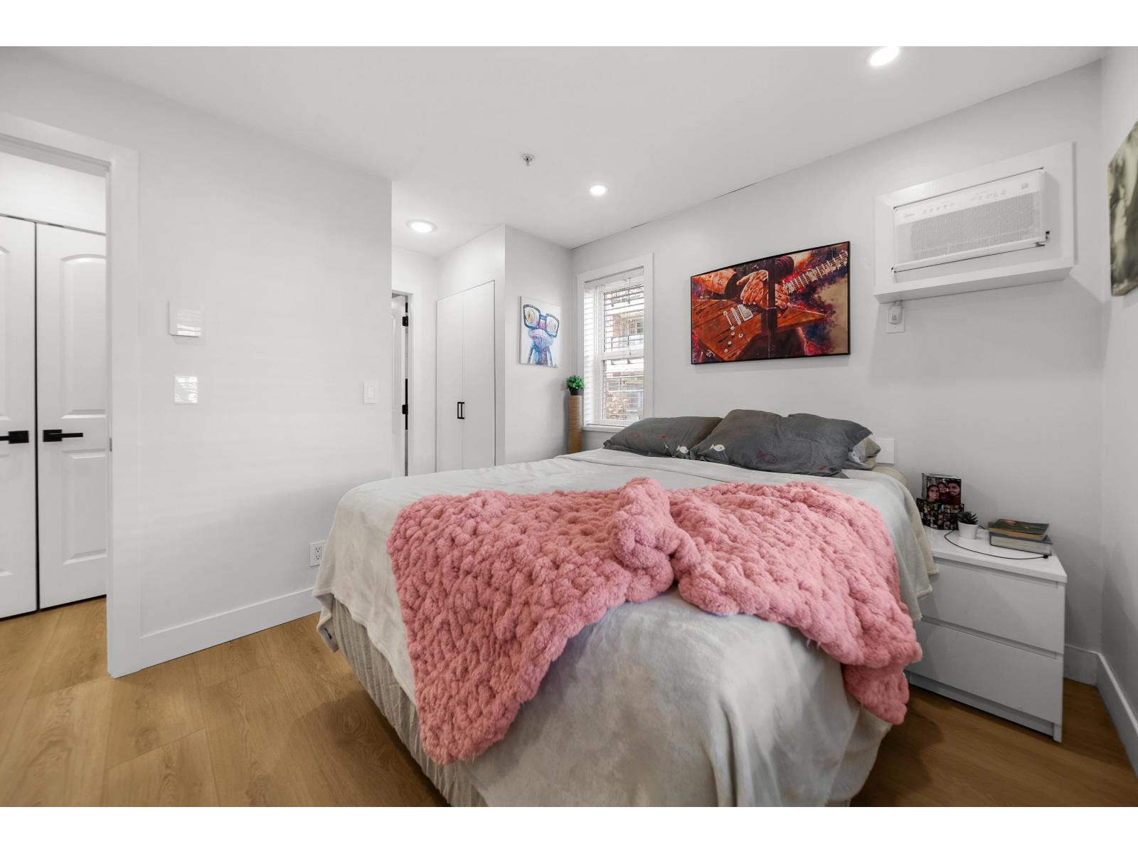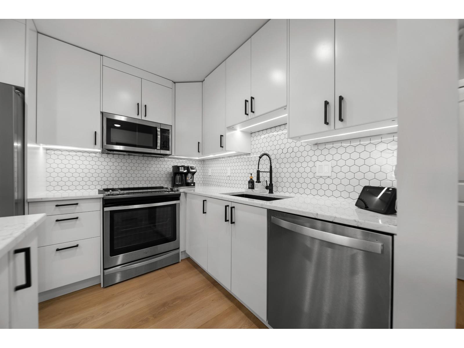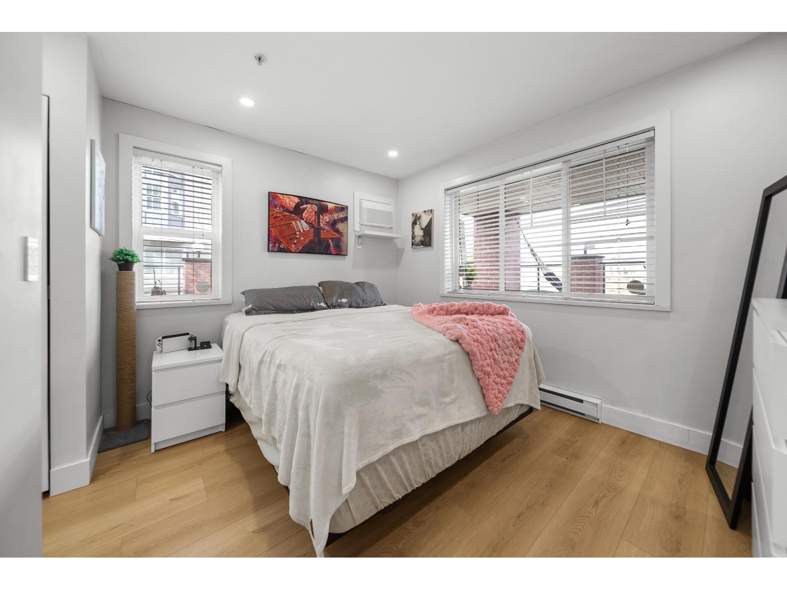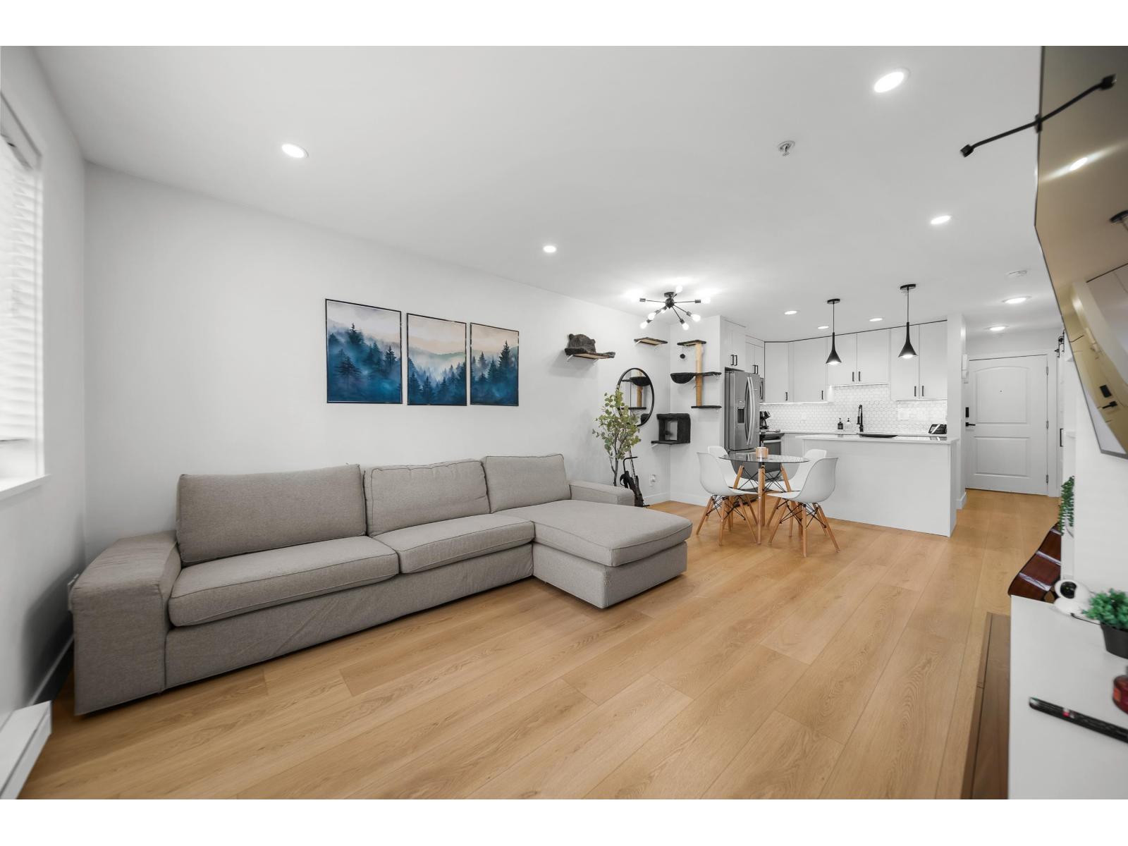 Langley City beauty at Madison Station! A lot to appreciate at this CORNER two bed and two bathroom condo. Situated on the ground floor with access to covered 12x8 patio and direct access to spacious grass area making for a great space for kid/dog and visitor access! This 'like new' home features an abundance of updates including: kitchen with quartz counters, luxury SPC vinyl flooring, updated main bath, remodeled ensuite with in-floor heating, A/C in primary, lighting system controlled by Alexa, paint, baseboards and even the outlets and switches. Quiet condo with just one neighbor! Enjoy TWO dedicated parking stalls, private storage and a well run building including fitness and club rooms. Strata fee of 408/month and welcoming all ages plus one pet (cat or dog of any size). (id:64528)