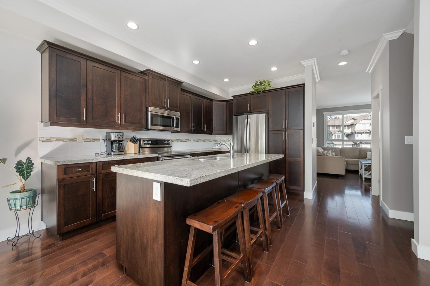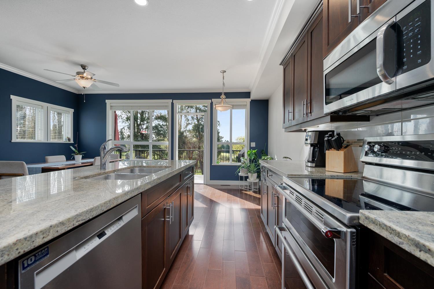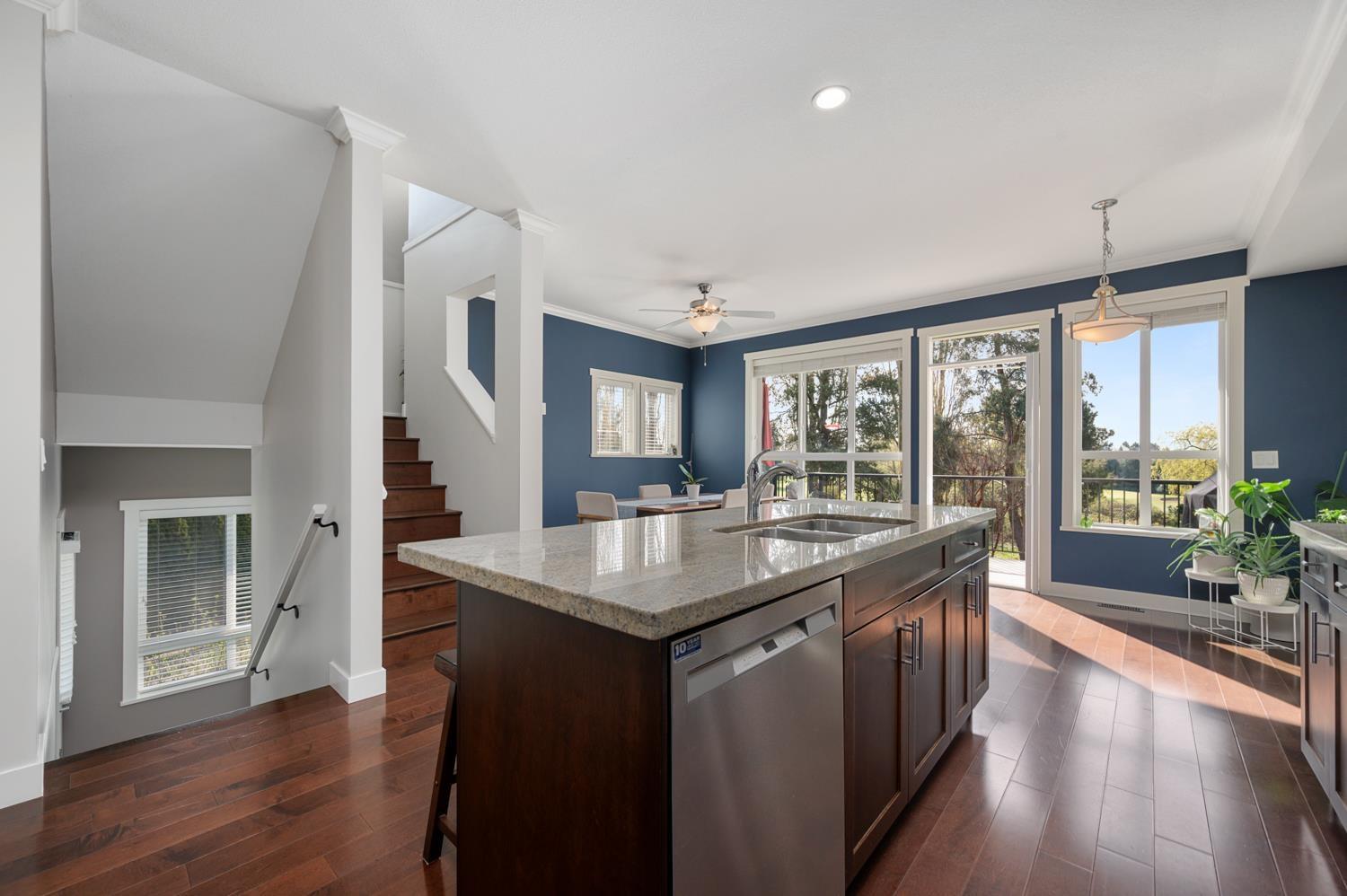 Welcome to this highly sought after corner unit by award winning Vesta Developments, perfectly positioned in one of the best locations in the complex, backing directly onto Surrey Golf Club. Bright and filled with natural light, this home offers stunning golf course and pond views from all three levels, creating a peaceful, private retreat. The main floor features 9 foot ceilings, a gourmet kitchen with upgraded appliances, ample storage, and a thoughtfully designed layout ideal for both everyday living and entertaining. Step out onto the spacious deck or unwind on the lower patio while taking in the serene surroundings. The lower level offers a versatile rec room, office, or guest bedroom complete with a full 3 piece bathroom. Enjoy a short 2 minute walk to the clubhouse, mornings filled with songbirds, and a warm, welcoming community. All just minutes to Surrey Sports Complex and Guildford Town Centre, this home truly has it all. OPEN HOUSE APR 18 & 19 - 2 to 4pm (id:64528)