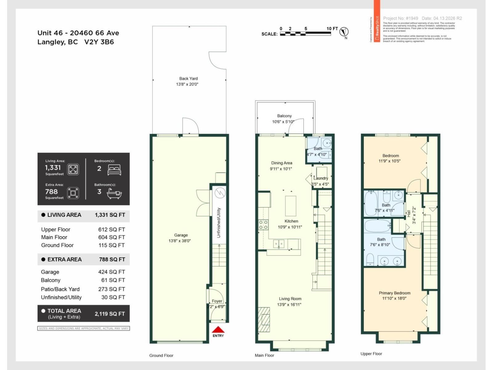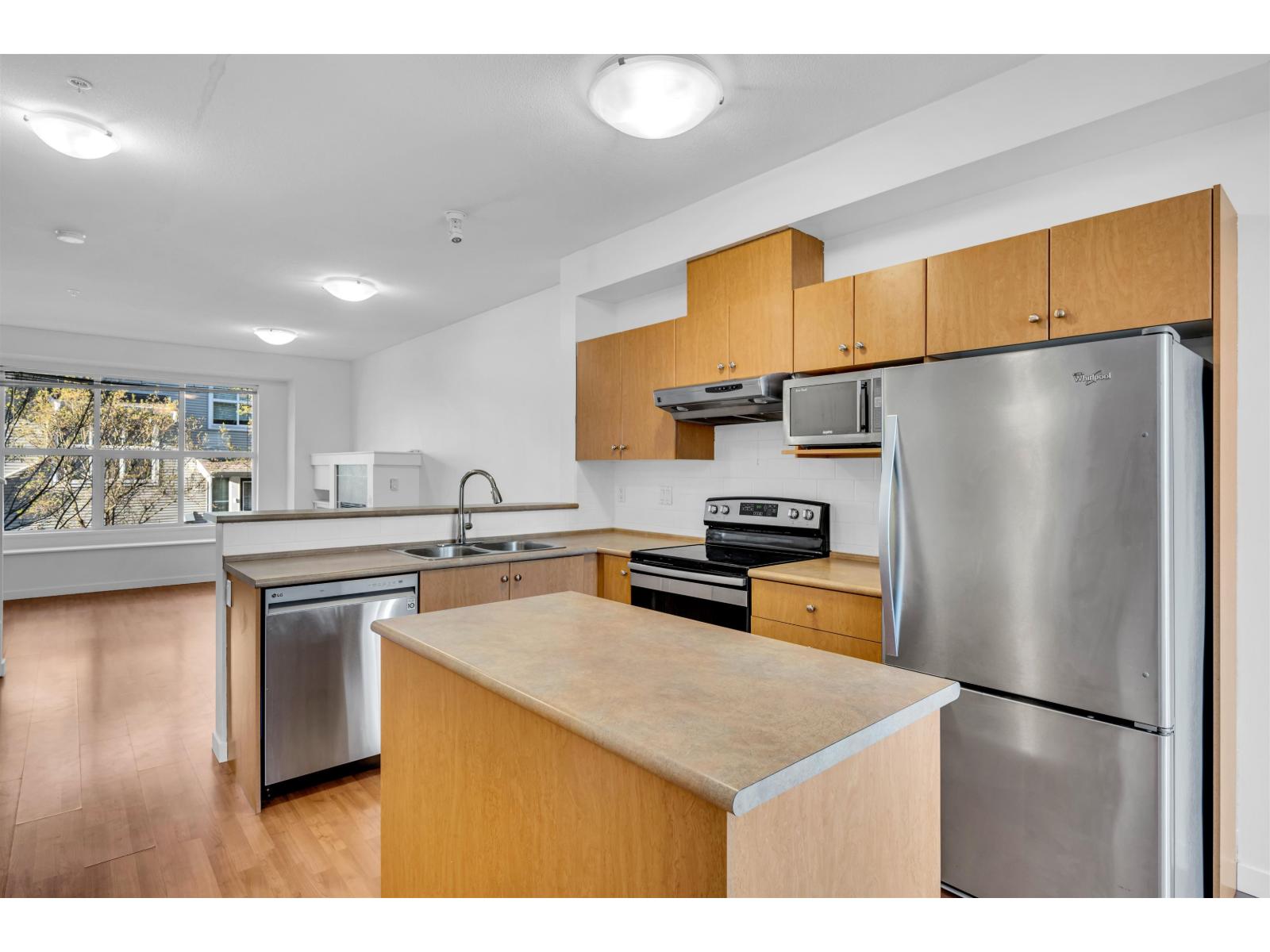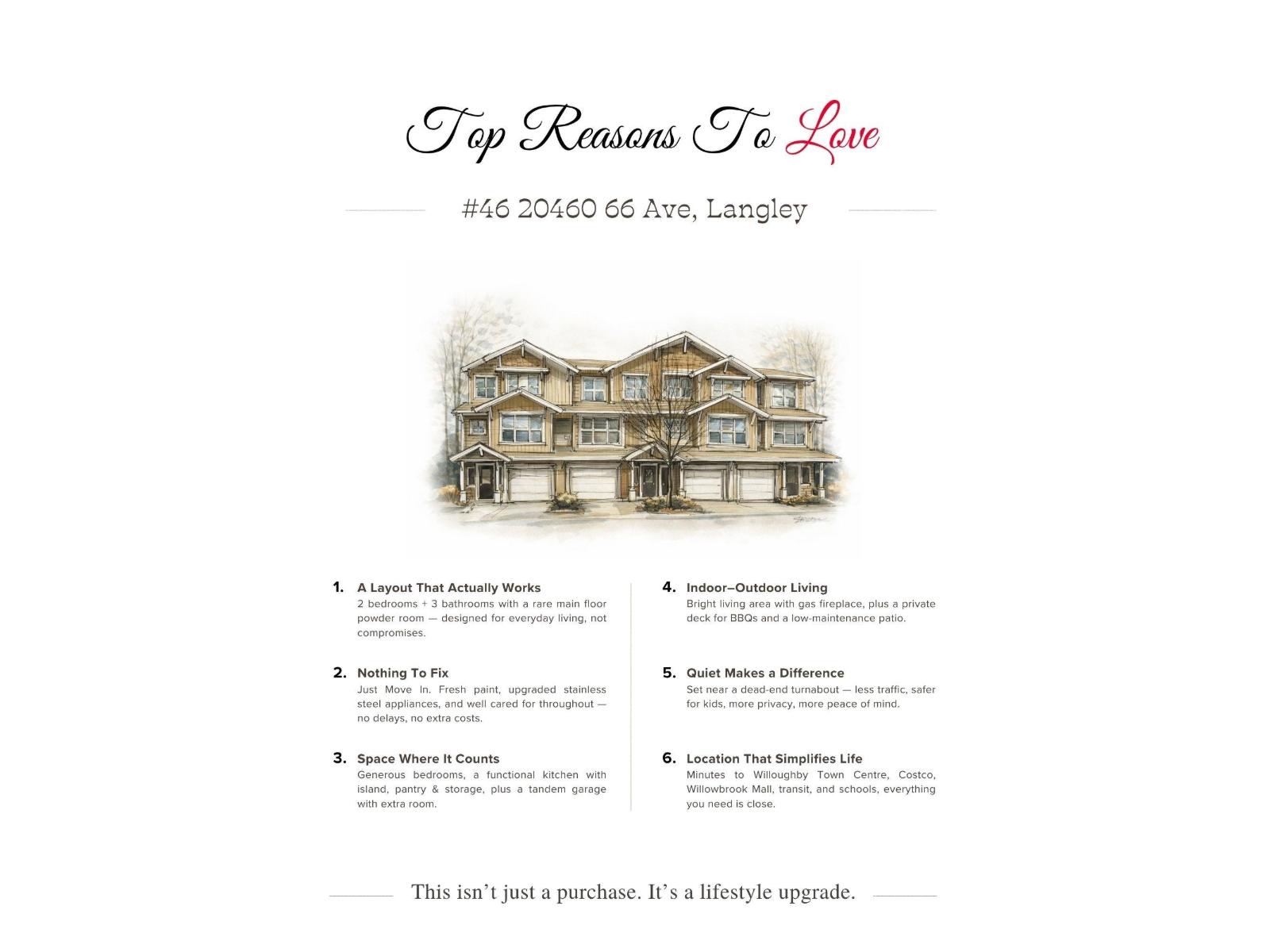 PRIVATE, BRIGHT & MOVE-IN READY . This 2 bed, 3 bath townhome offers 1,331 sqft of functional living designed for who want enough space without compromise . The main floor powder room adds everyday convenience, while well-separated bedrooms provide privacy and flexibility . Tucked into a quiet turnabout with south exposure, the home is filled with natural light yet feels removed from traffic and noise .Freshly painted with upgraded stainless steel appliances-no work needed . Enjoy a 61 sqft BBQ-friendly deck plus a 273 sqft fully fenced patio with artificial turf, ideal for kids, pets & enjoyment . 9 ft ceilings and a tandem garage with extra storage complete the package . Built in 2005 and located minutes to Willoughby Town Centre, Costco, Willowbrook Mall, schools, and transit . A smart choice in a home you can grow into . This isn't just a purchase. It's a lifestyle upgrade! You're Not Buying a Unit. You're Buying Comfort. You're Buying Frictionless Daily Living. (id:64528)