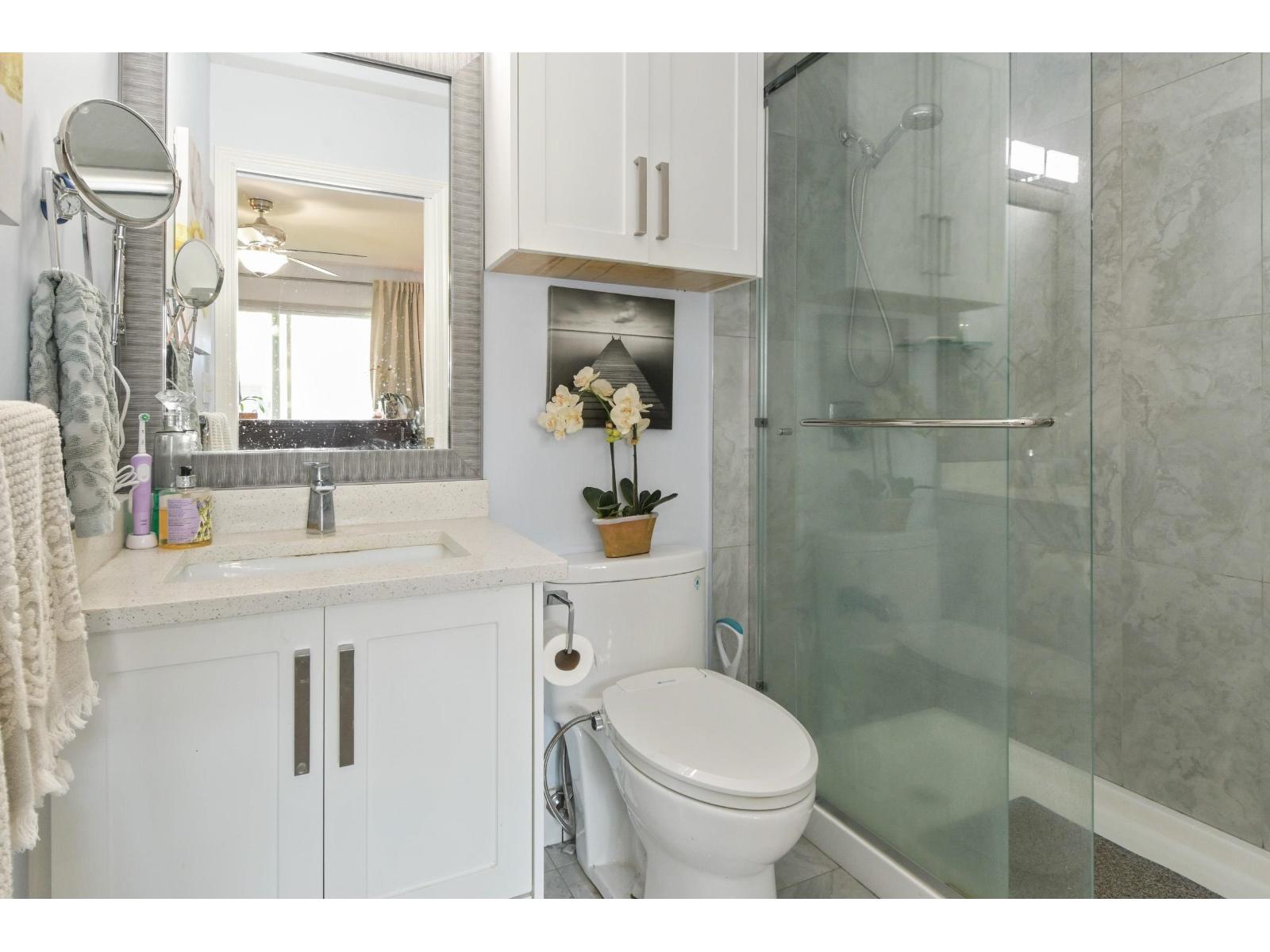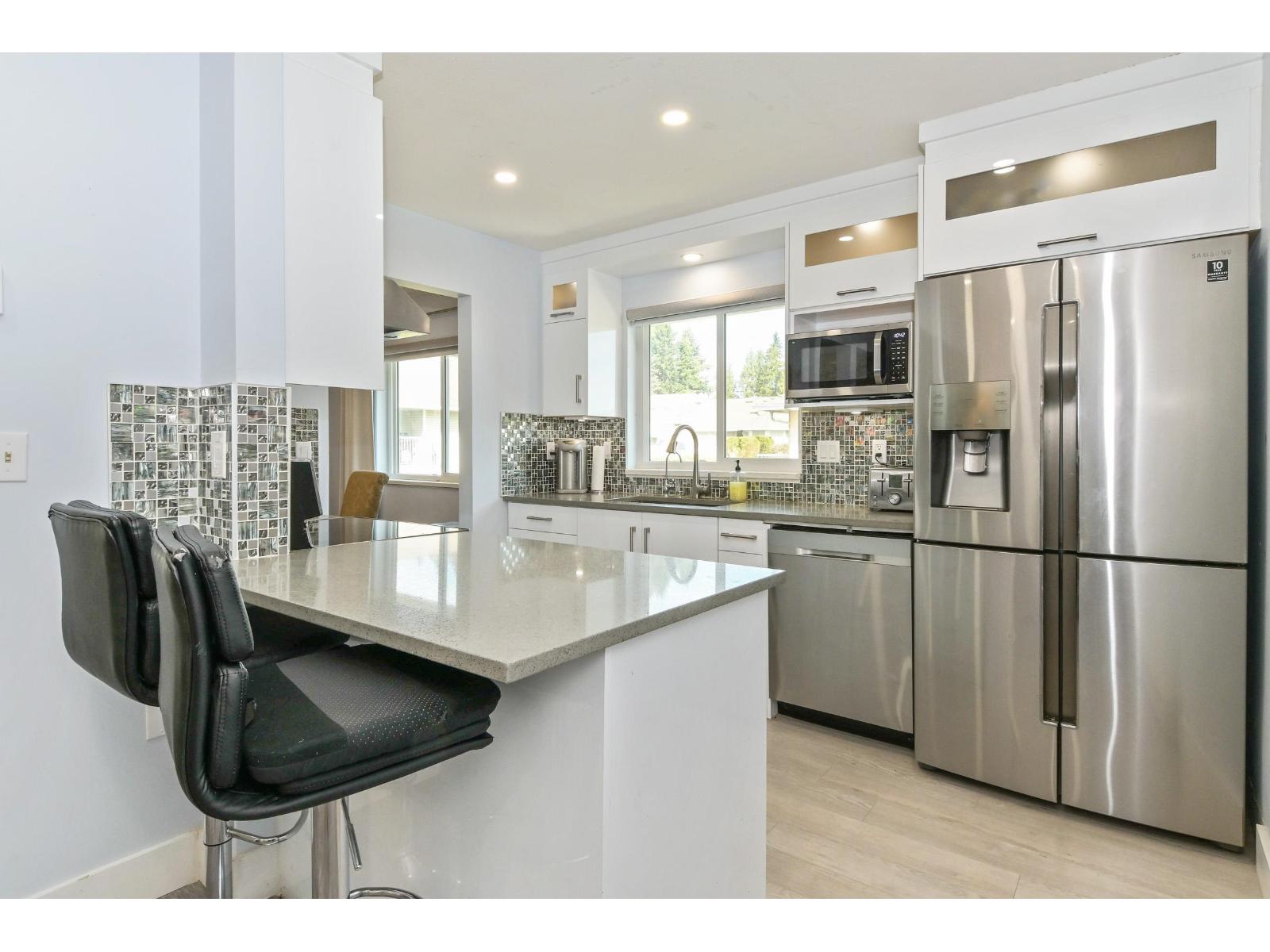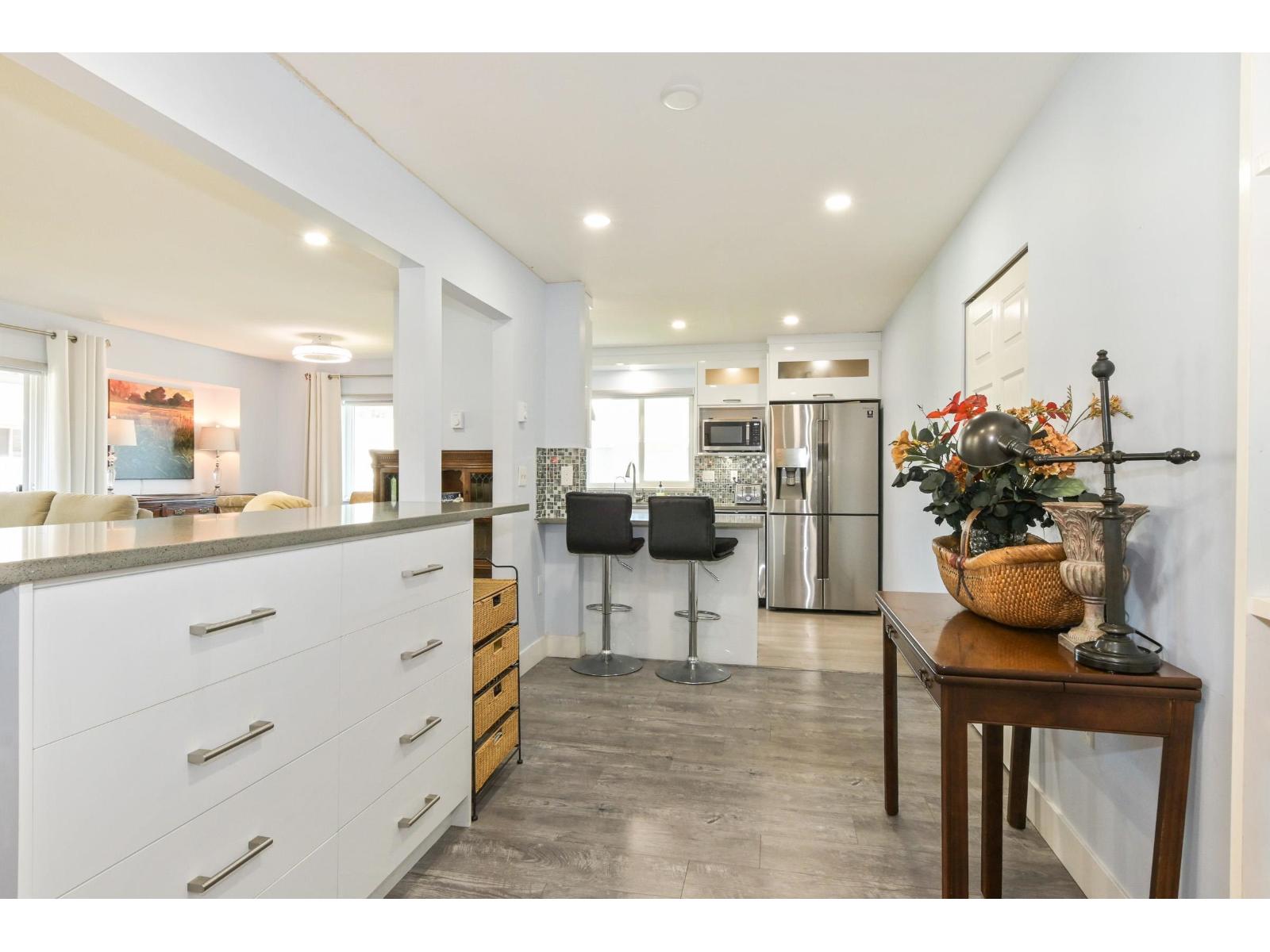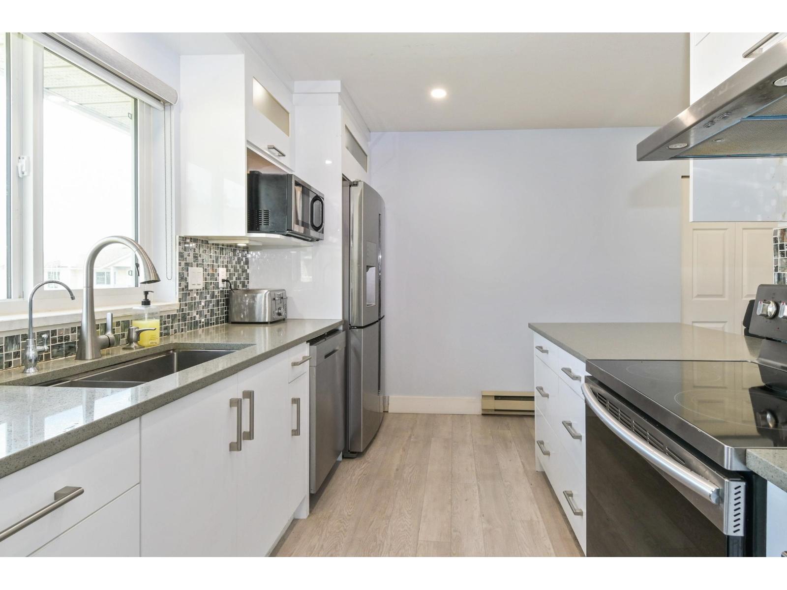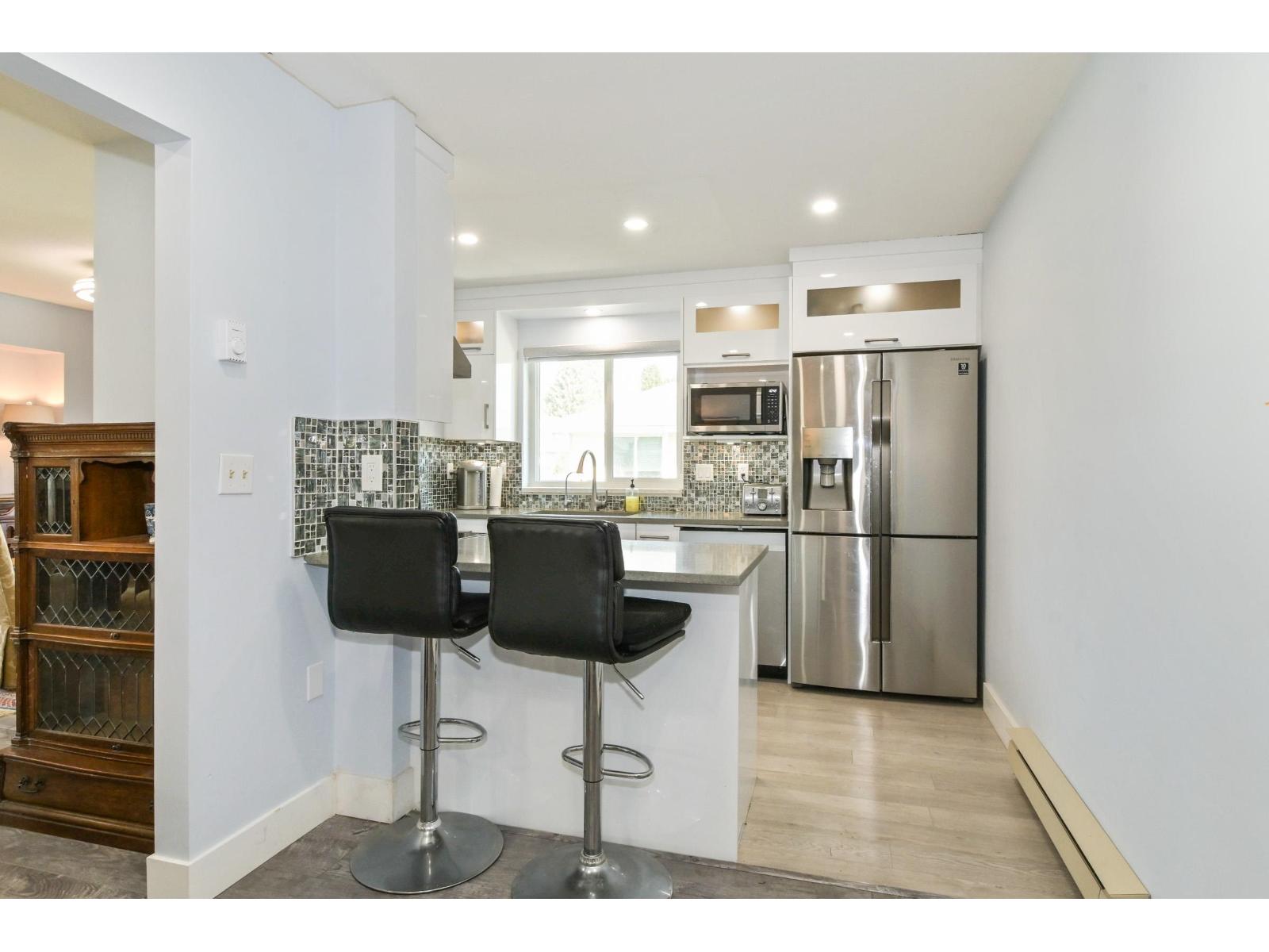 Discover the ease of top-floor living in this beautifully renovated 2 bed, 2 bath townhome, in Emerson Park Estates, perfectly suited for those looking to downsize without sacrificing comfort or style. Thoughtfully updated with quality finishes throughout, this inviting home features a bright modern kitchen with white cabinetry, quartz countertops, stainless steel appliances, laminate flooring, refreshed bathrooms with tile and vanities, and custom blinds. Enjoy the added convenience of a single car garage with storage. Set in a well-kept adult-oriented community close to West Oaks & Seven Oaks mall, Save On Foods, dining, recreation, Mill Lake park, transit, Hwy 1, and all that Abbotsford has to offer. 55+ complex. Open House April 18 from 1:00pm to 4:00pm. (id:64528)