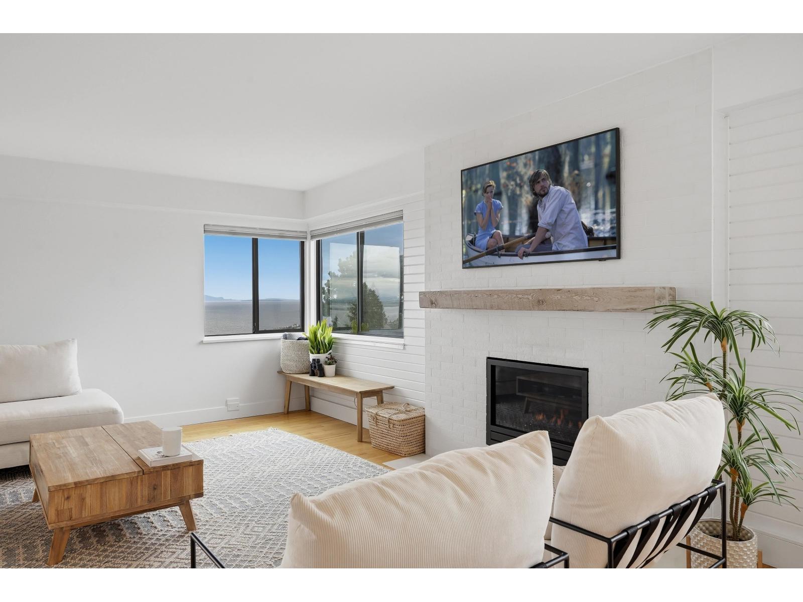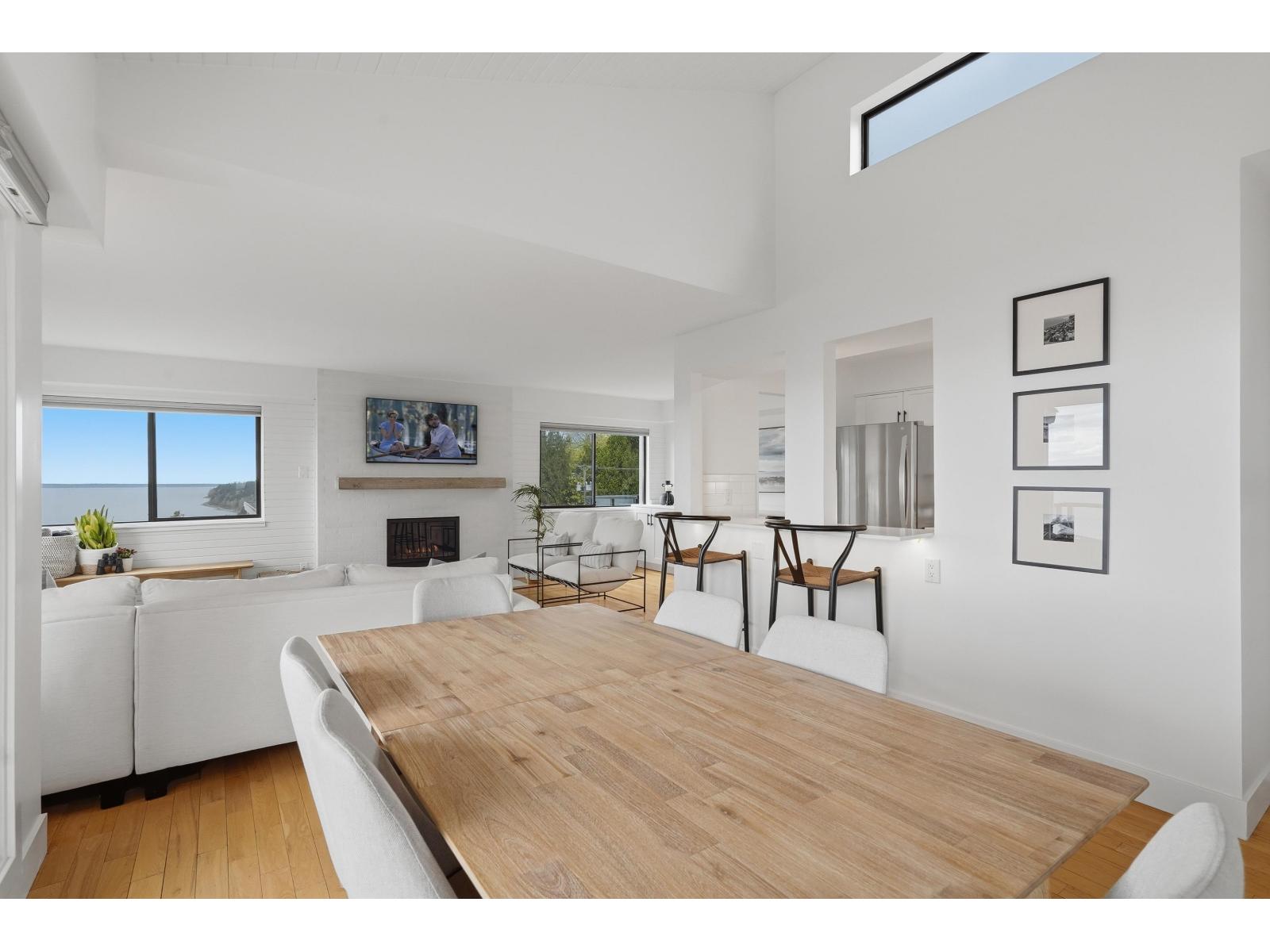 Very Rare 180° Ocean View Penthouse occupying the entire front of the building with only one shared wall, offering exceptional privacy. This renovated home features modern coastal design, 12.5' vaulted ceilings, and a bright south-facing exposure that fills the space with natural light all day. Enjoy a cozy gas fireplace, built in cabinets with wine fridge and outdoor deck for sunrises & sunsets on the ocean. Thoughtful layout includes 2 large bedrooms, 2 bathrooms, in-suite laundry & ample storage. 1 parking (can rent 2nd spot), 1 locker & shared storage room, plus free street parking. Sea Vista is a well-managed boutique building with recent updates: exterior, decks, sliding doors and paint. Rentals allowed, no pets or smoking. Quiet location, walk to Semiahmoo Mall and White Rock Pier! (id:64528)
