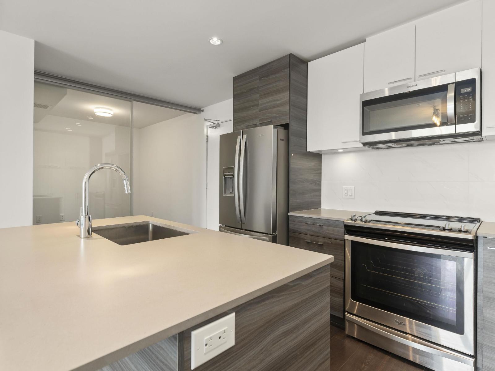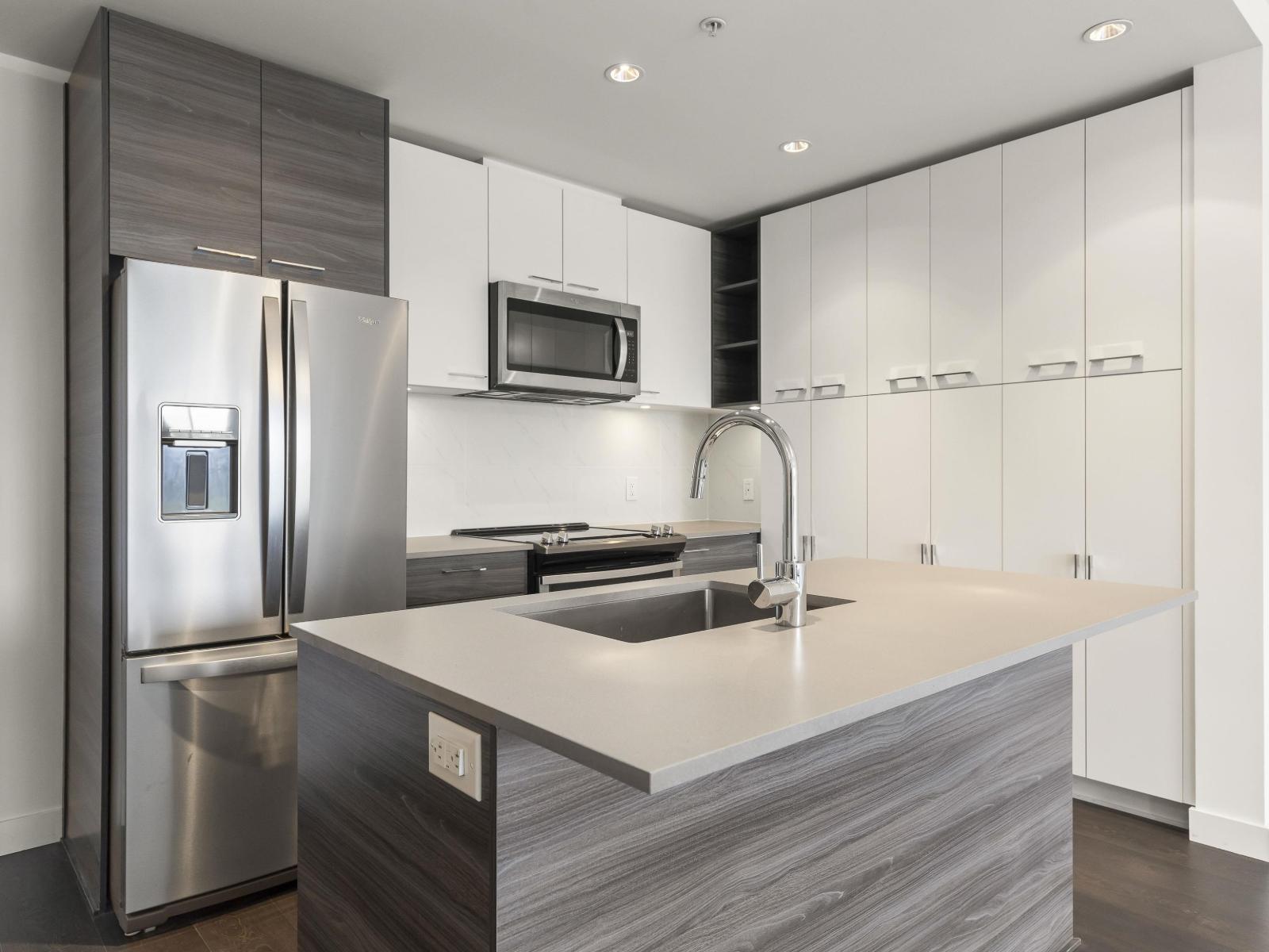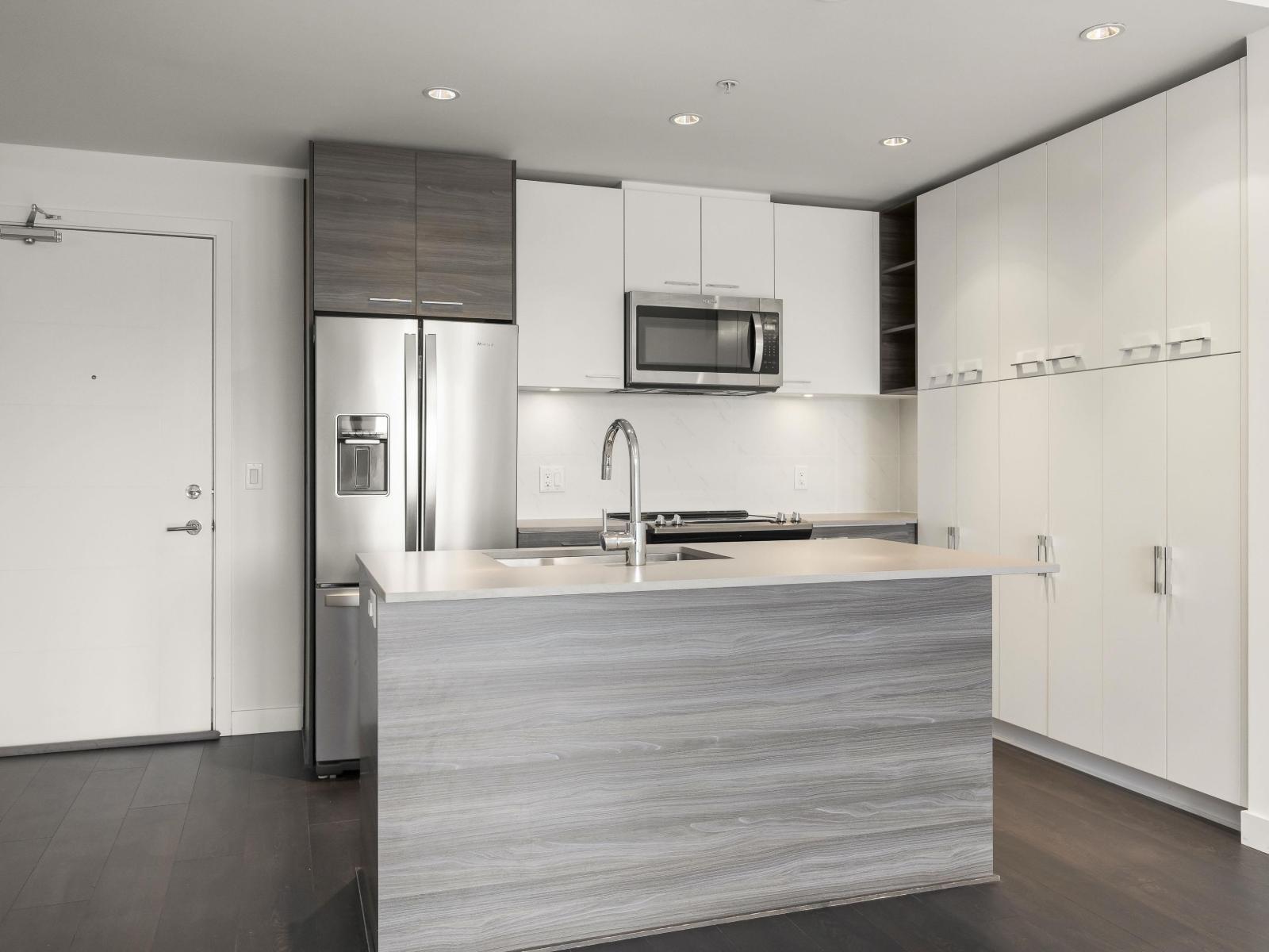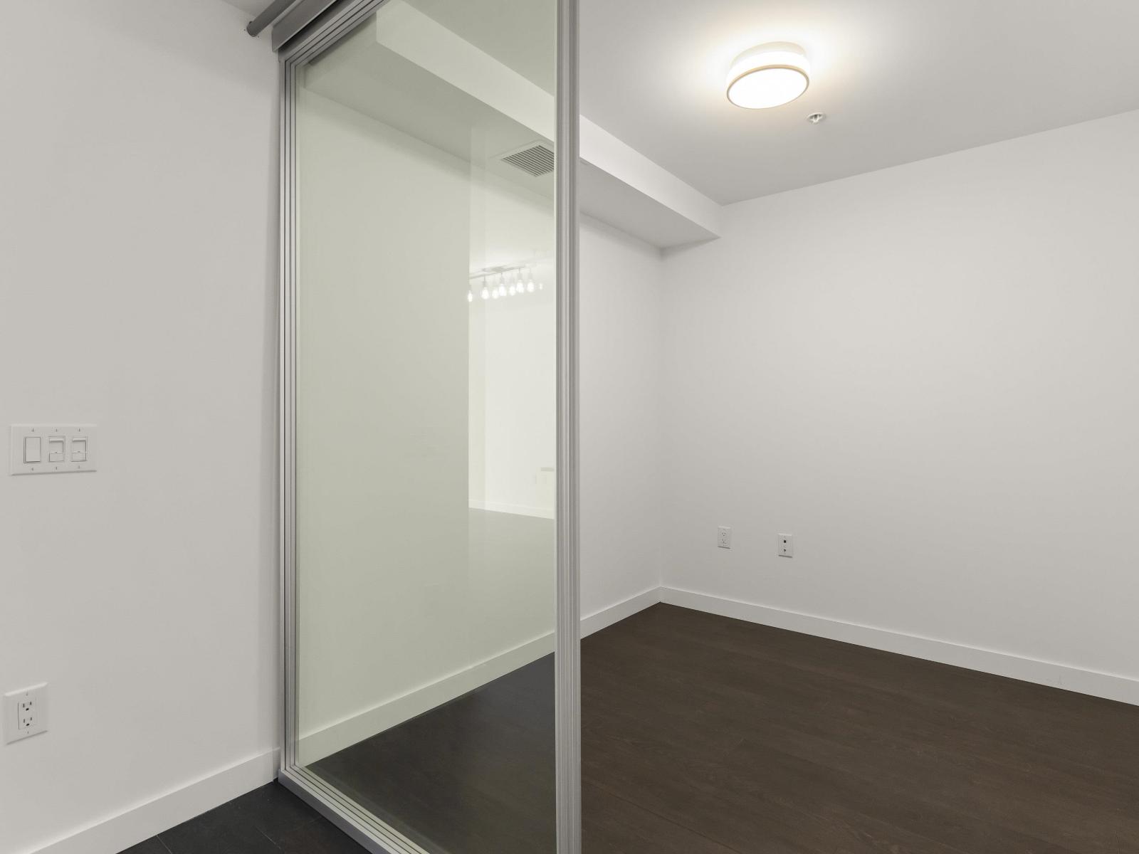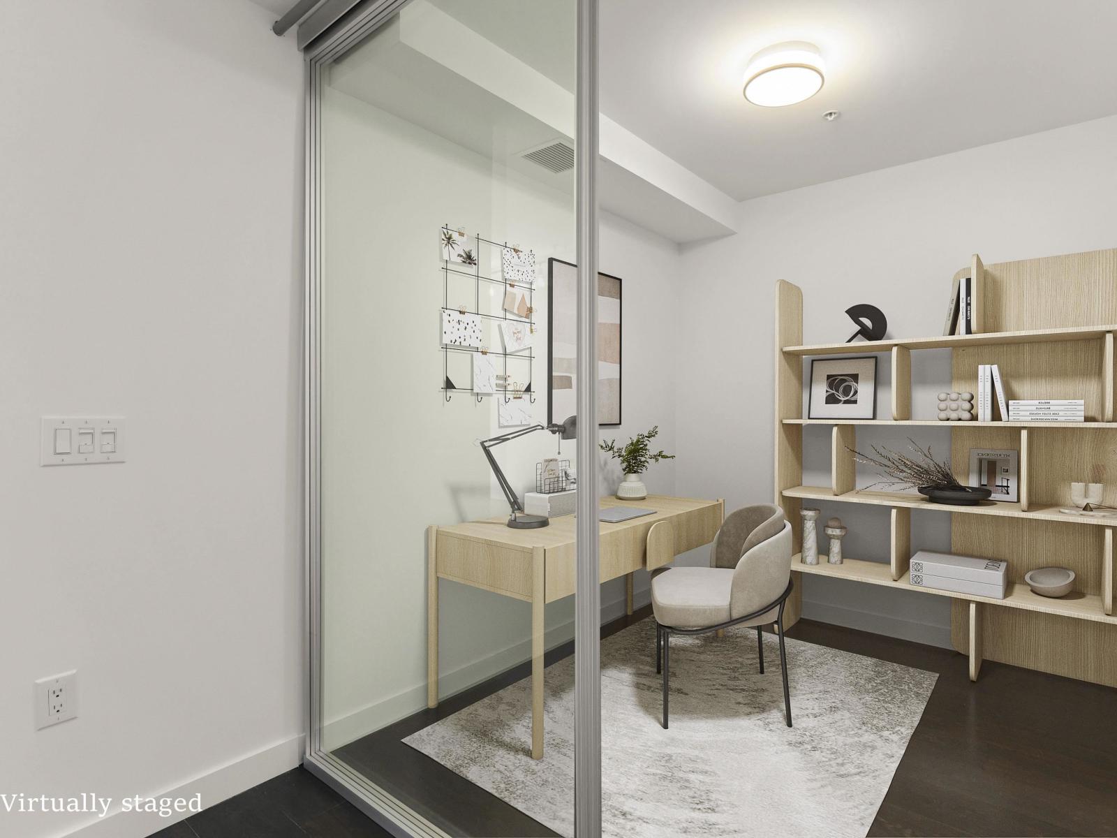 Welcome to Thrive at HQ. A smart, functional layout defines this 1 bed + den that easily adapts to your needs-home office, guest space, or media room. In like-new condition with fresh paint throughout, the home features an upscale kitchen and a full wall of built-in storage. Enjoy private, south-facing exposure overlooking the field, bringing in great natural light. Residents enjoy outstanding amenities including a gym, yoga studio, lounge, billiards, garden plots, and outdoor ping pong. Complete with parking, storage locker, in-suite laundry, and pet-friendly living. Steps to everyday conveniences, dining, and transit just one block away. (id:64528)