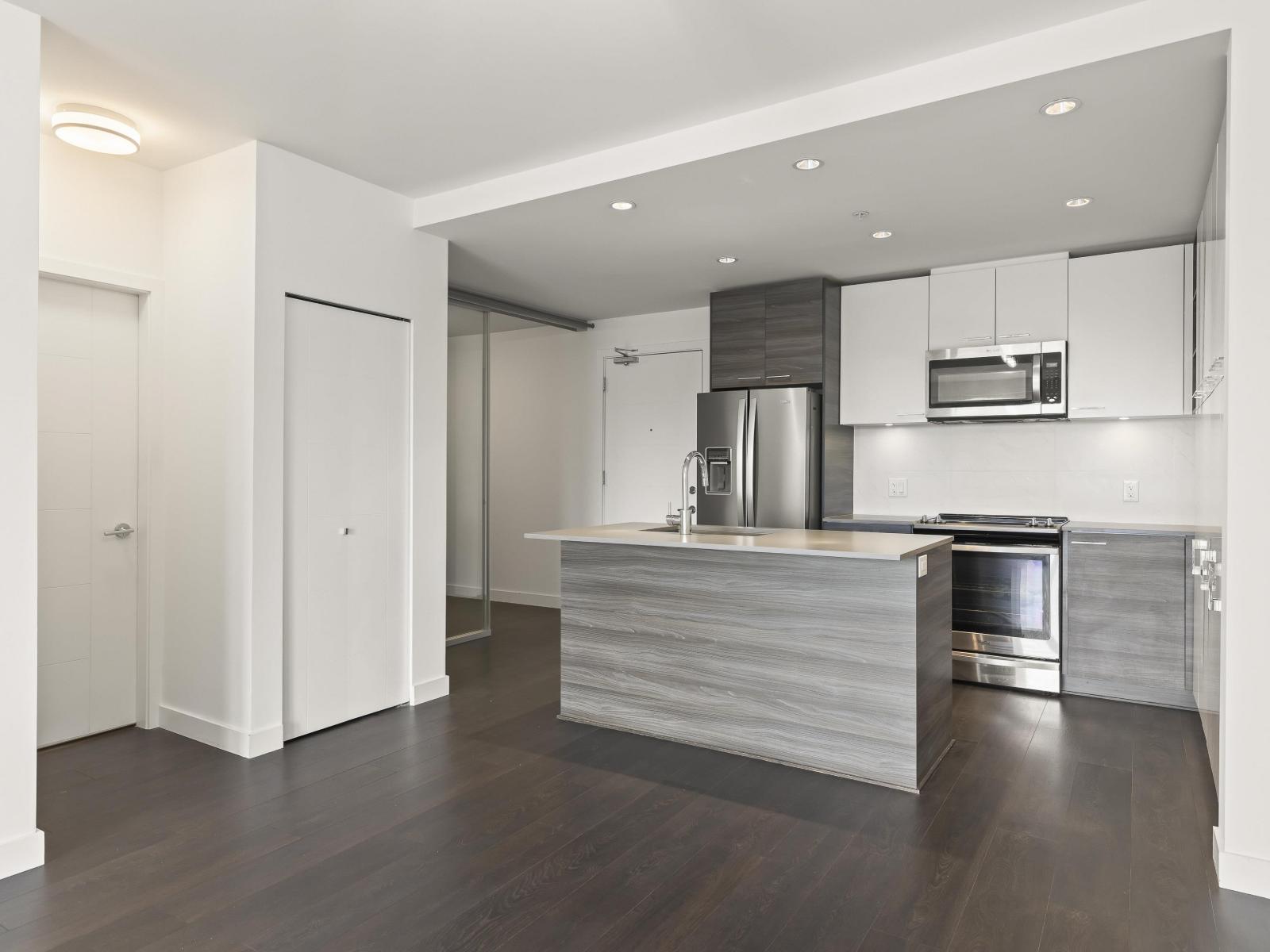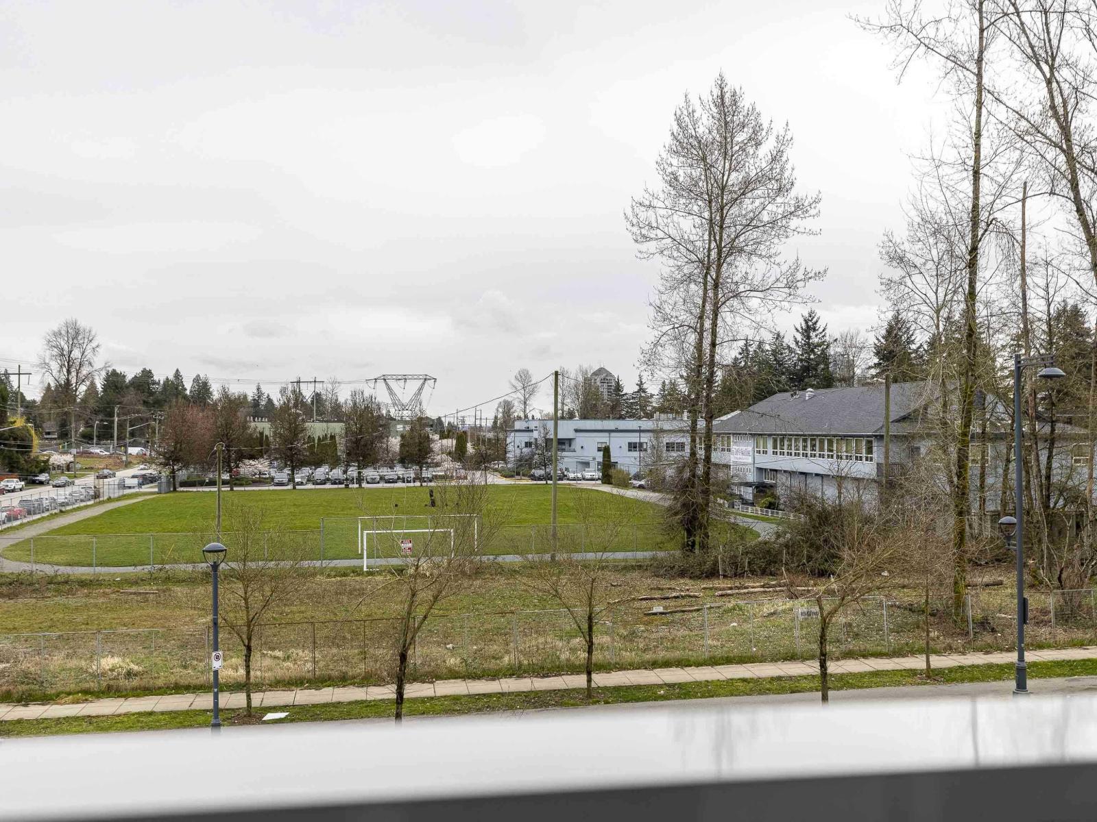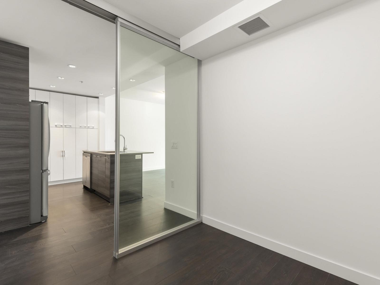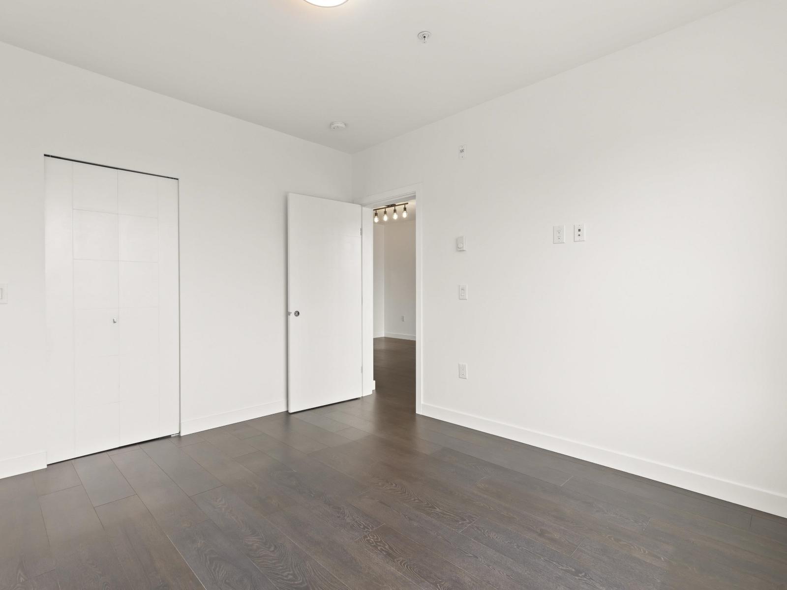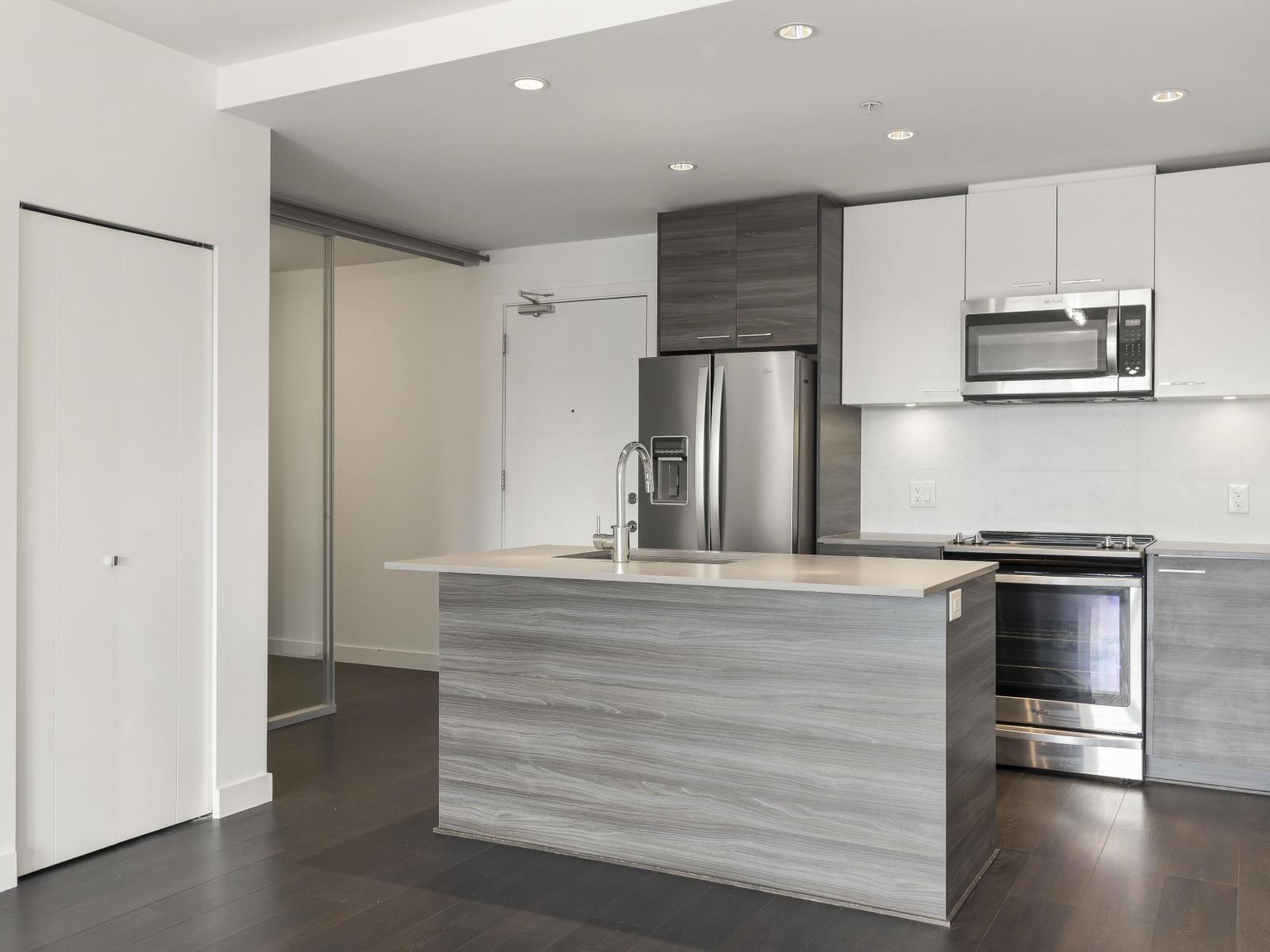 Welcome to Thrive at HQ. A smart, functional layout defines this 1 bed + den that easily adapts to your needs-home office, guest space, or media room. In like-new condition with fresh paint throughout, the home features an upscale kitchen and a full wall of built-in storage. Enjoy private, south-facing exposure overlooking the field, bringing in great natural light. Residents enjoy outstanding amenities including a gym, yoga studio, lounge, billiards, garden plots, and outdoor ping pong. Complete with parking, storage locker, in-suite laundry, and pet-friendly living. Steps to everyday conveniences, dining, and transit just one block away. (id:64528)