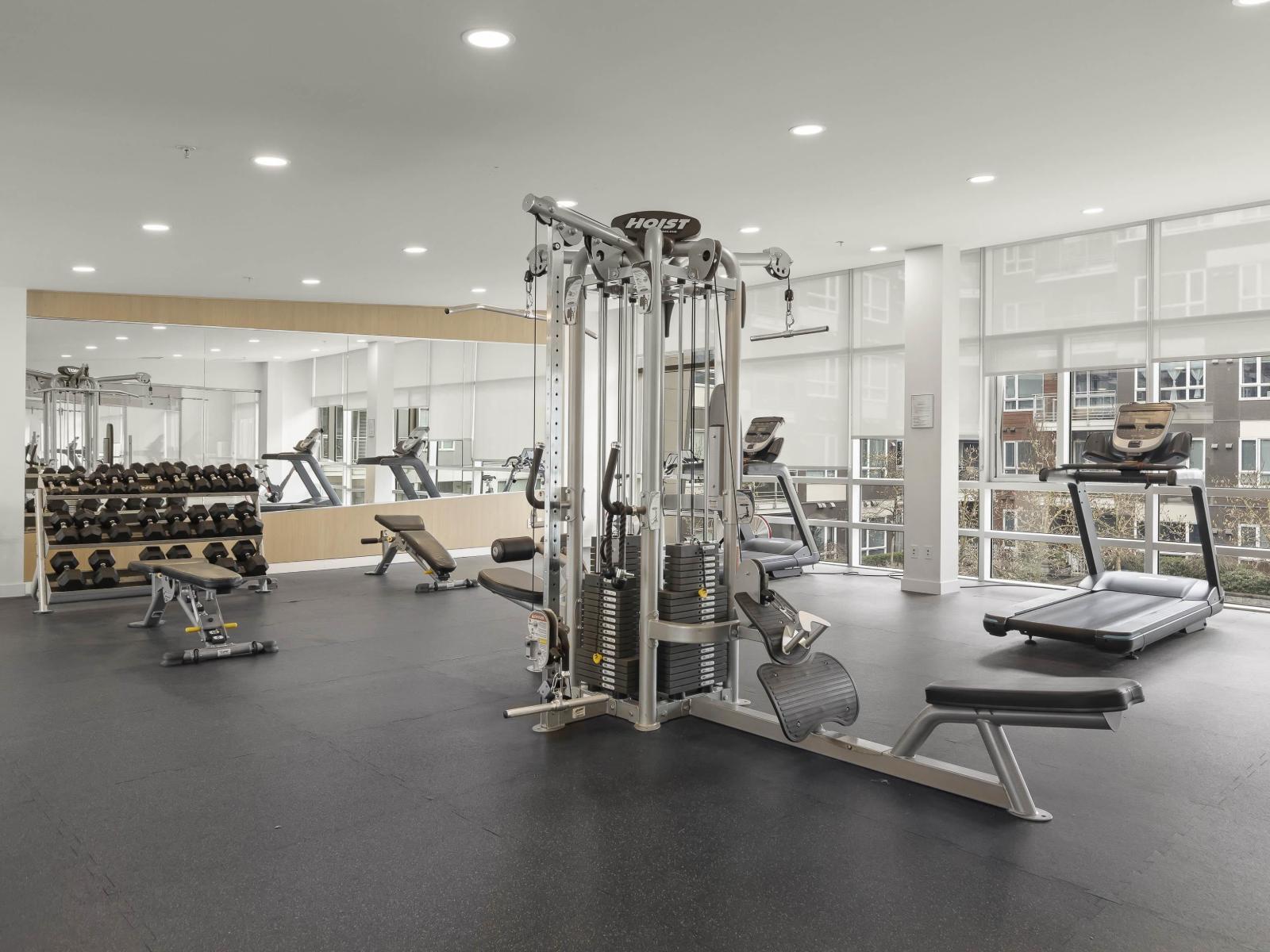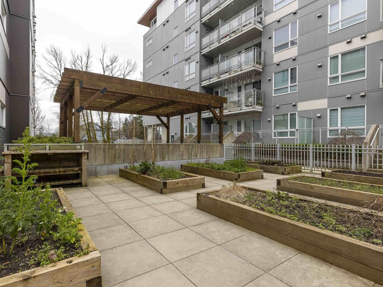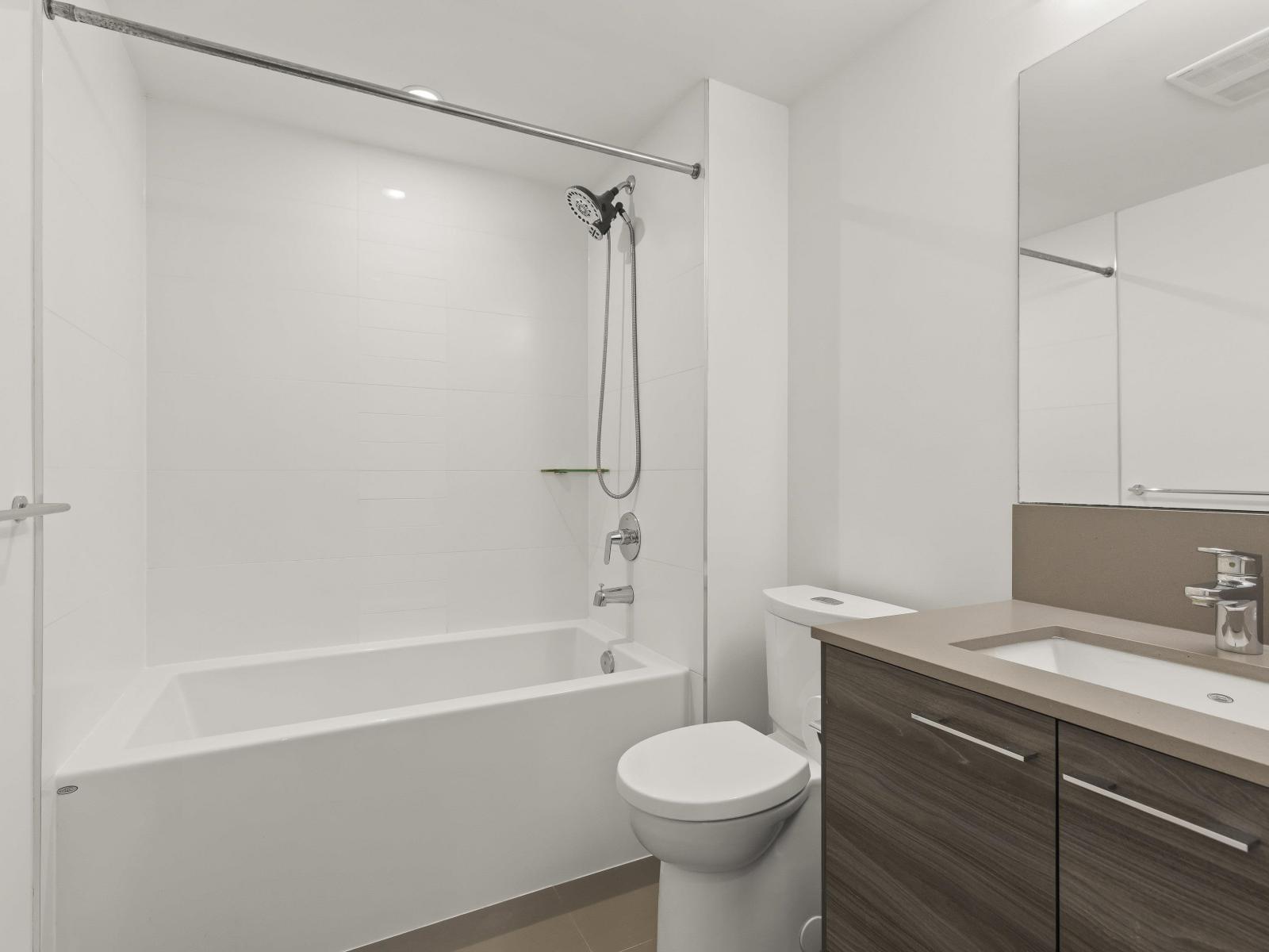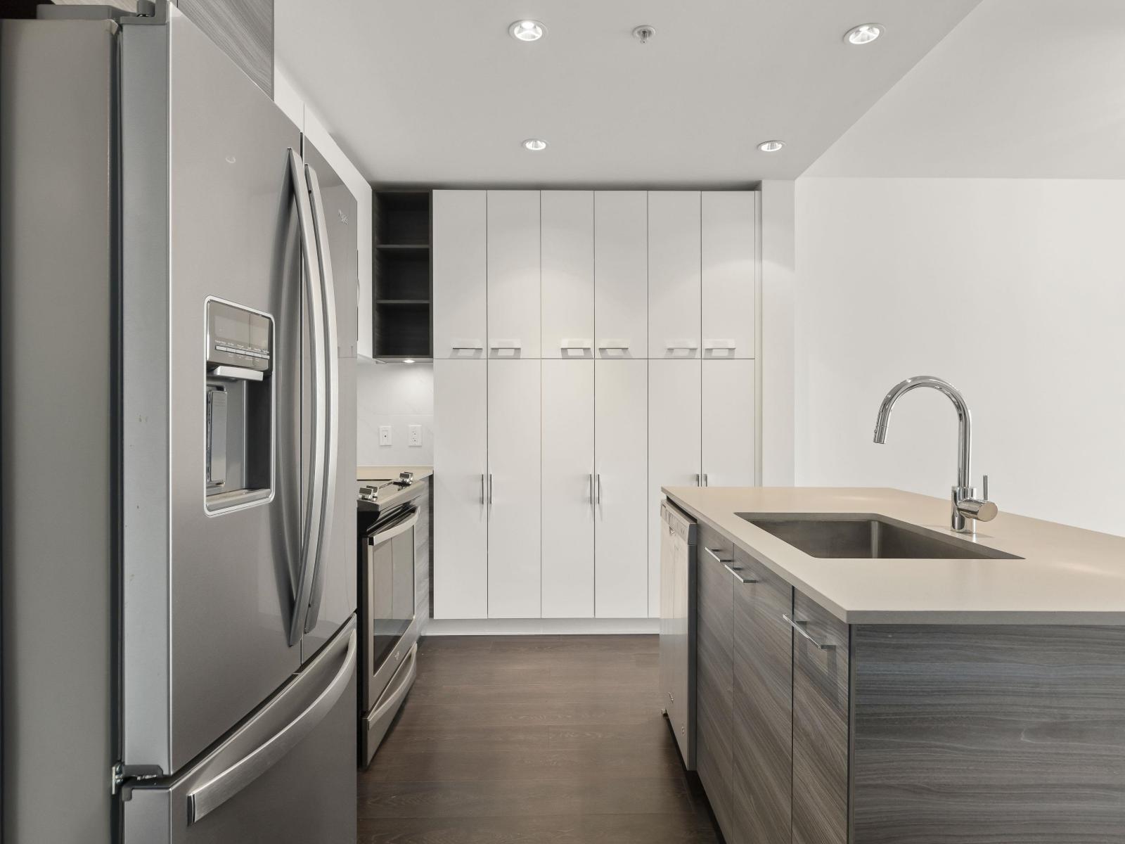 Welcome to Thrive at HQ. A smart, functional layout defines this 1 bed + den that easily adapts to your needs-home office, guest space, or media room. In like-new condition with fresh paint throughout, the home features an upscale kitchen and a full wall of built-in storage. Enjoy private, south-facing exposure overlooking the field, bringing in great natural light. Residents enjoy outstanding amenities including a gym, yoga studio, lounge, billiards, garden plots, and outdoor ping pong. Complete with parking, storage locker, in-suite laundry, and pet-friendly living. Steps to everyday conveniences, dining, and transit just one block away. (id:64528)